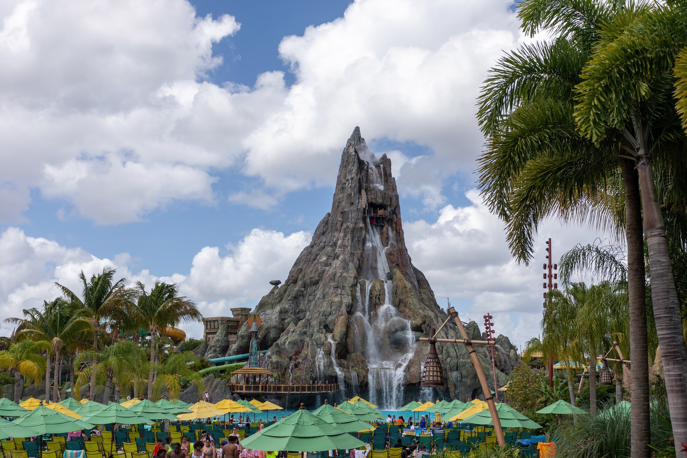 Vast Hawaiian-themed water park with a large volcano, wave pool, water slides, a lazy river, splash pads and sand beach.