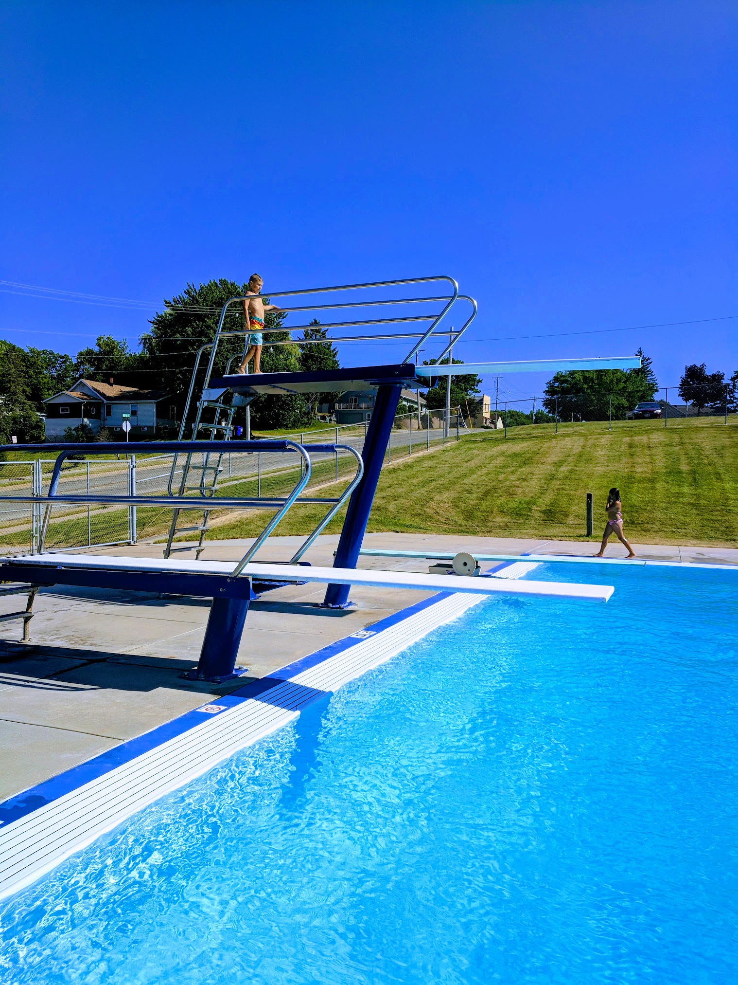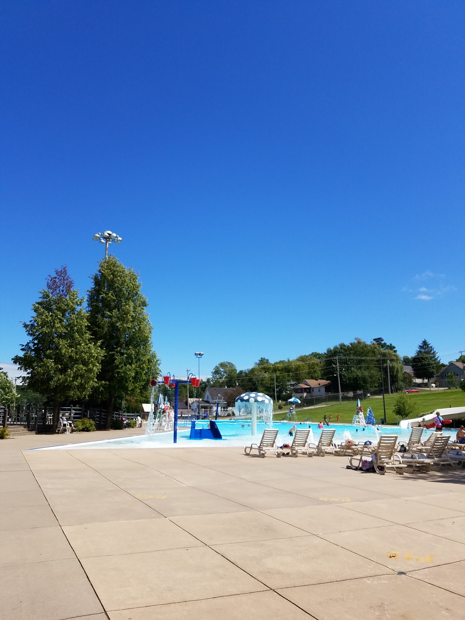 Public swimming pool featuring diving boards and a slide, plus a splash pad.