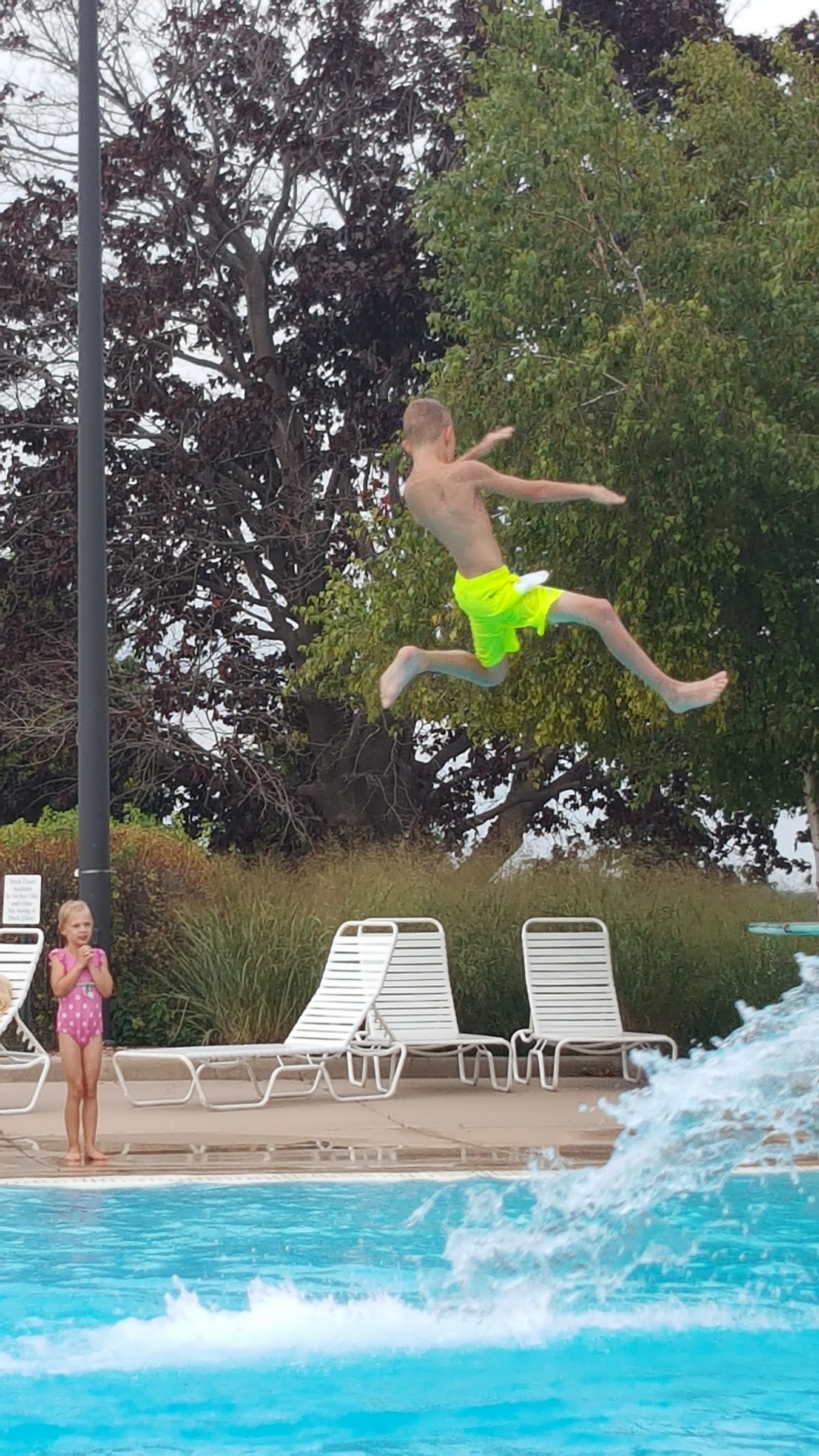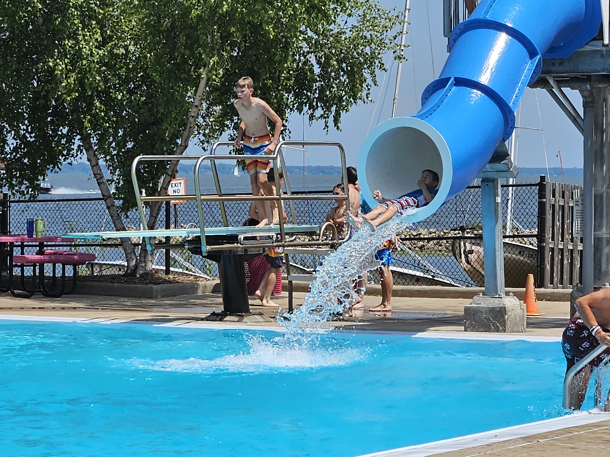 Kids have a great time, they love the basketball hoop which was added this year. I wish they would maintain the sand play area a little better. Concession stand, large water slide, drop slide, diving board, sand play area, separate sand volleyball area.