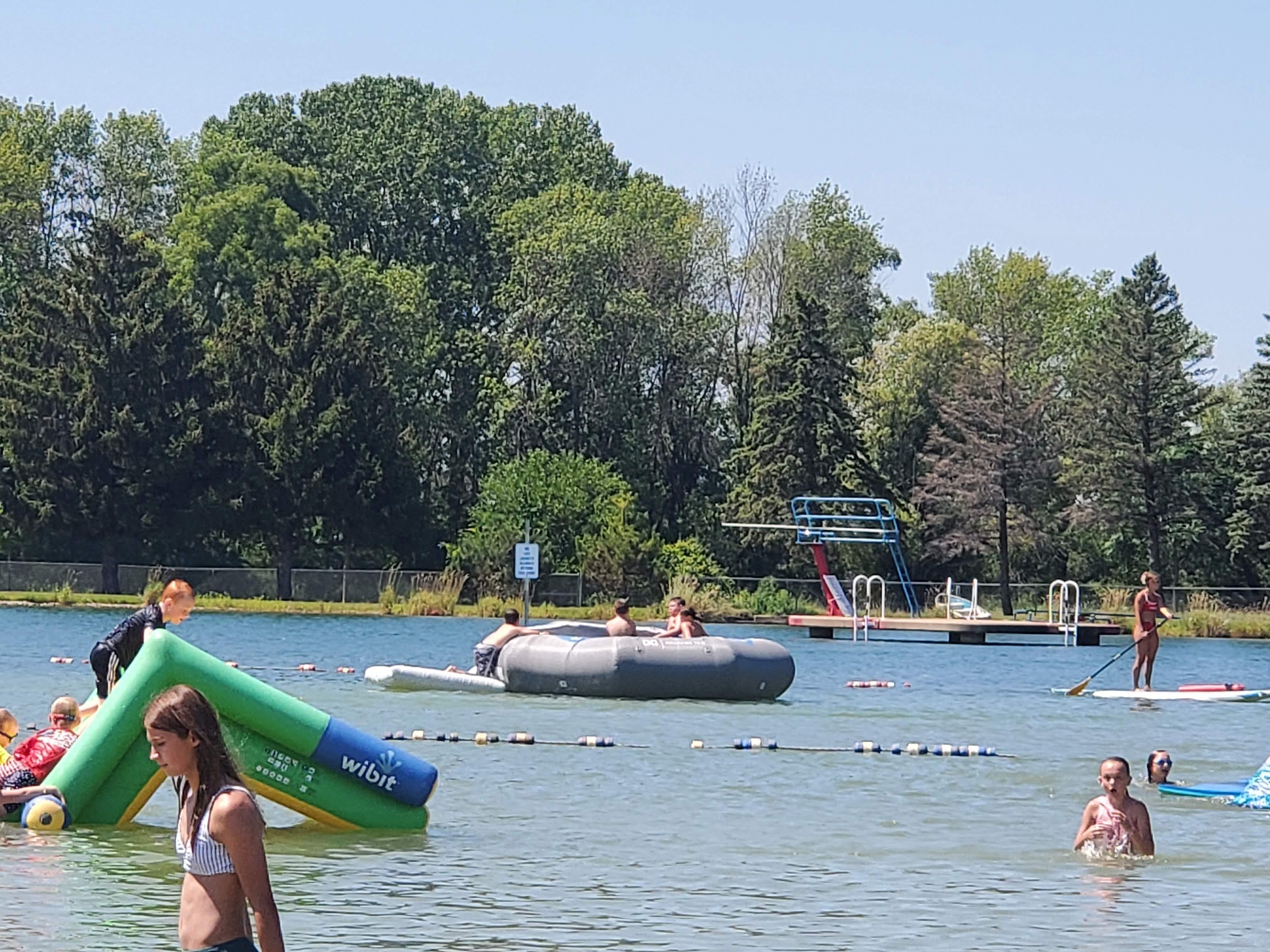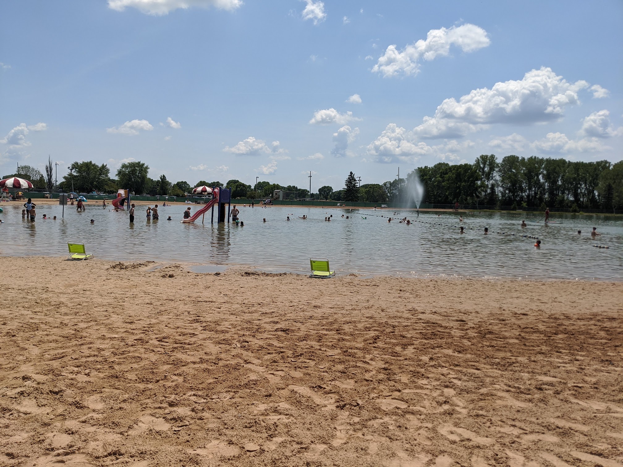 Sandy lake featuring swimming, a diving board, slides and a children's play area.