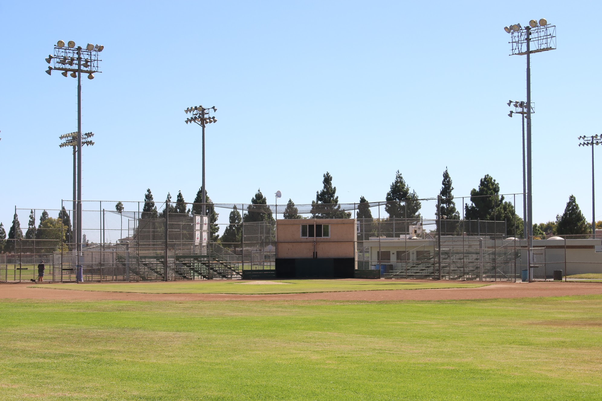 Grass-filled park featuring baseball fields, tennis courts and a playground.