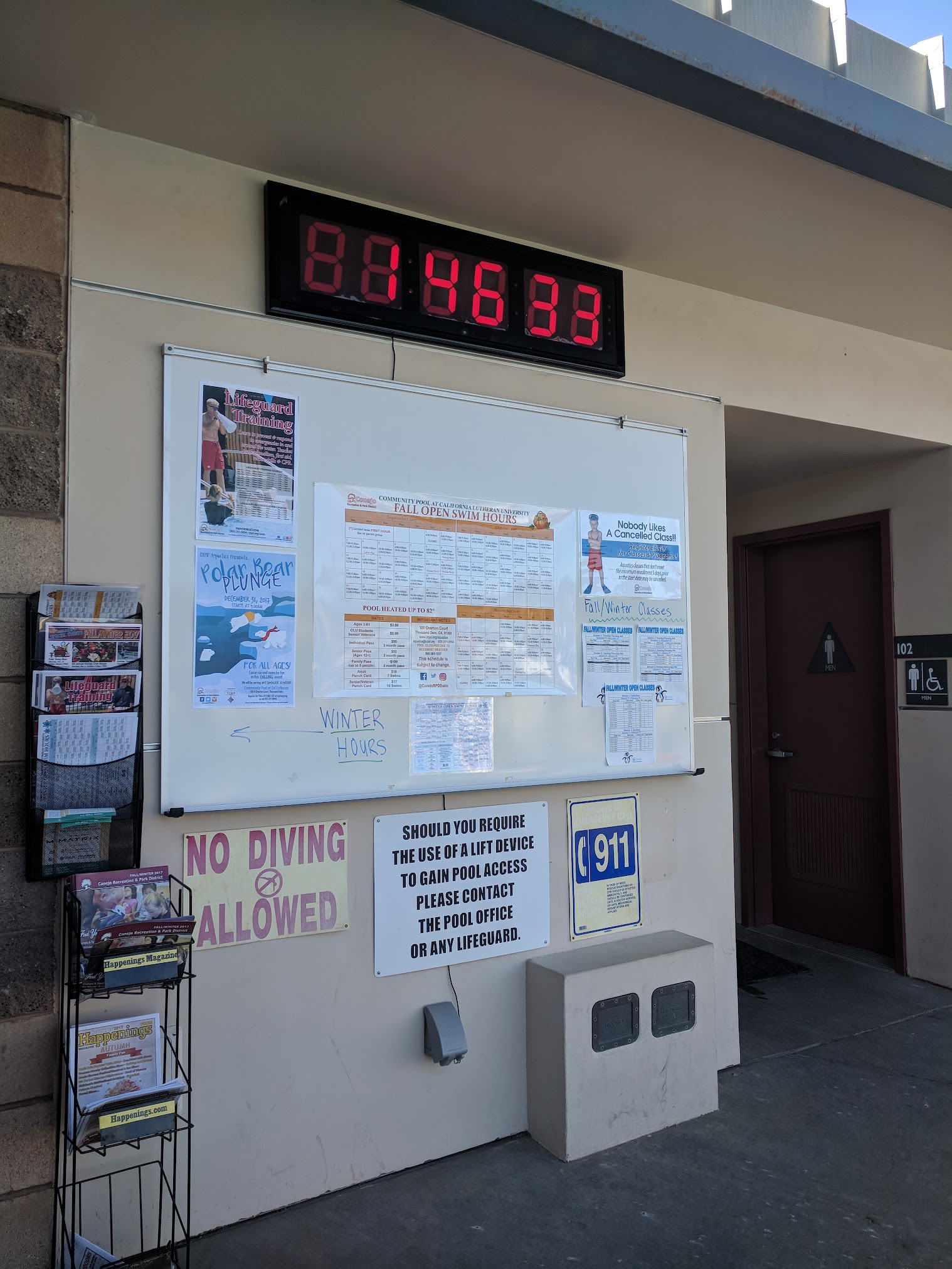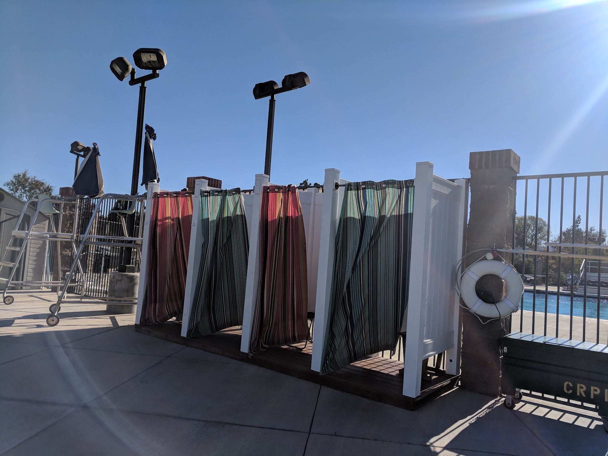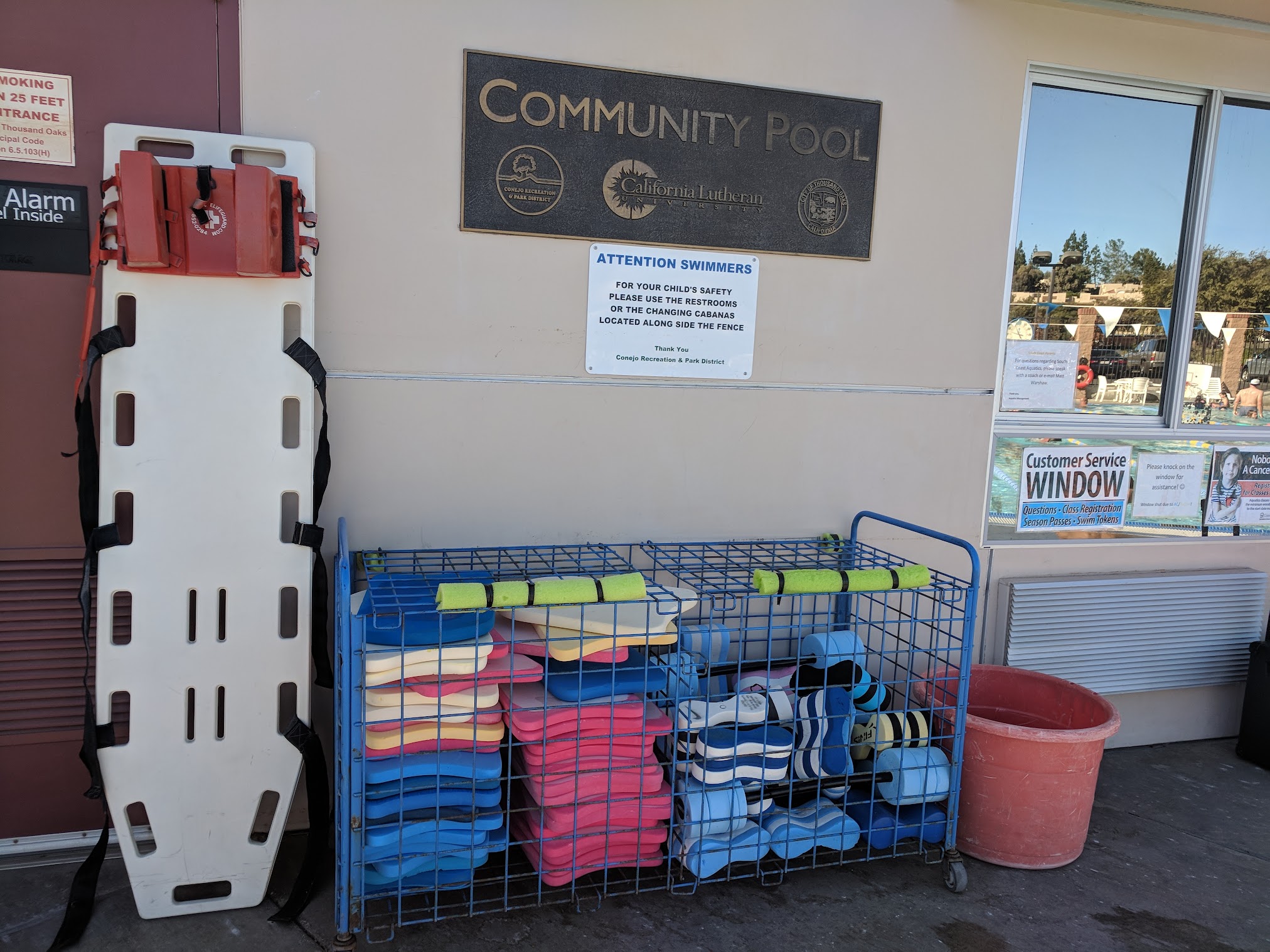 The community pool at Cal Lutheran University in Thousand Oaks is a great 25 yard pool with eight lanes. Pool temperature is always comfortable, pool is clean and landlines for lap swimming. They do have designated shallow water area with steps to exit the pool the entire length of the pool. Manager Dee is great. Has locker rooms as well as on deck changing area and outdoor heated showers. Lounge chairs and tables with umbrellas. Plenty of parking. Lifeguards. Great place to spend any day of the year.
