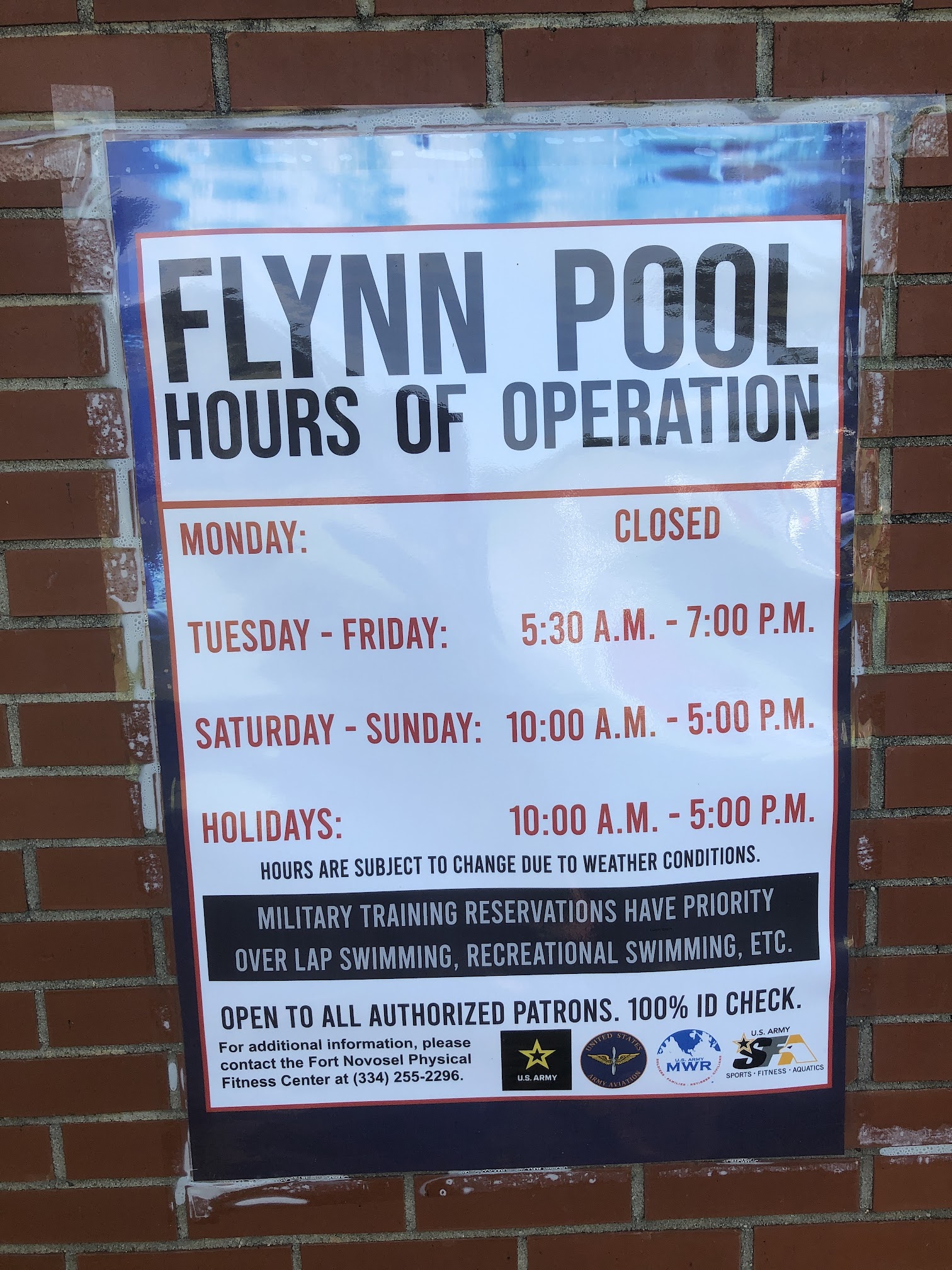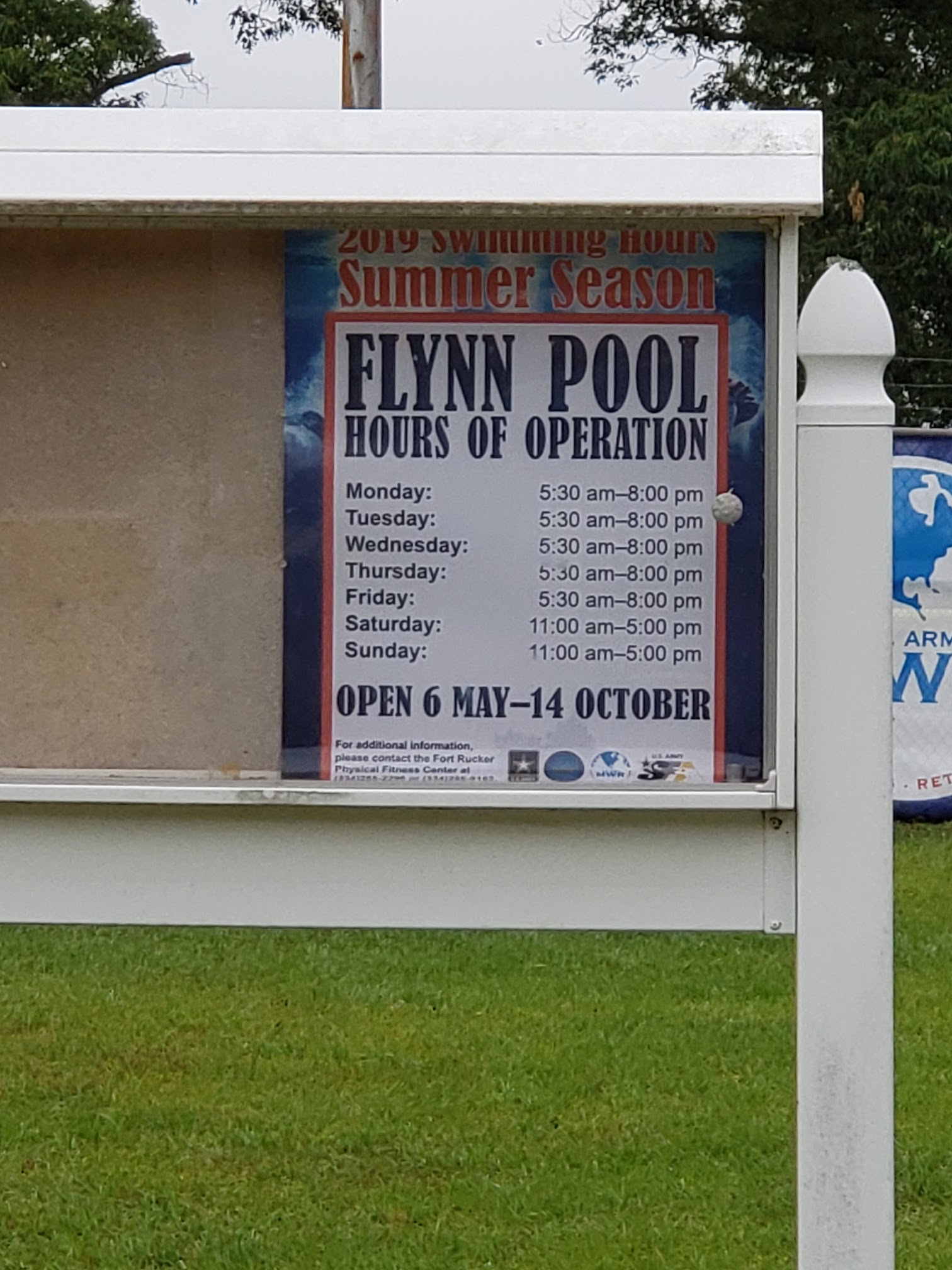 A nice pool, except you can't use the diving board (imagine that, no using the diving board at the Army Safety Center haha, that's predictable). Also, why shut the pool down on Labor Day weekend when the temperature is in Alabama stay above 85 basically through the end of September? You still have the same people working at the indoor pool, and when asked they said they'd rather be working at the outdoor pool themselves. Something you really should think about, leaving an open for an extra month