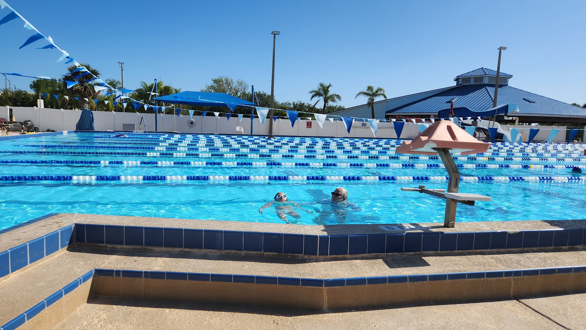 The instructional/recreational pool at the Cocoa Beach Aquatic Center is heated and typically maintained at a comfortable 84 degrees Fahrenheit. The 50-meter competition pool is not explicitly listed with a specific temperature, suggesting it is often unheated or maintained at a standard cooler temperature for competitive swimming.