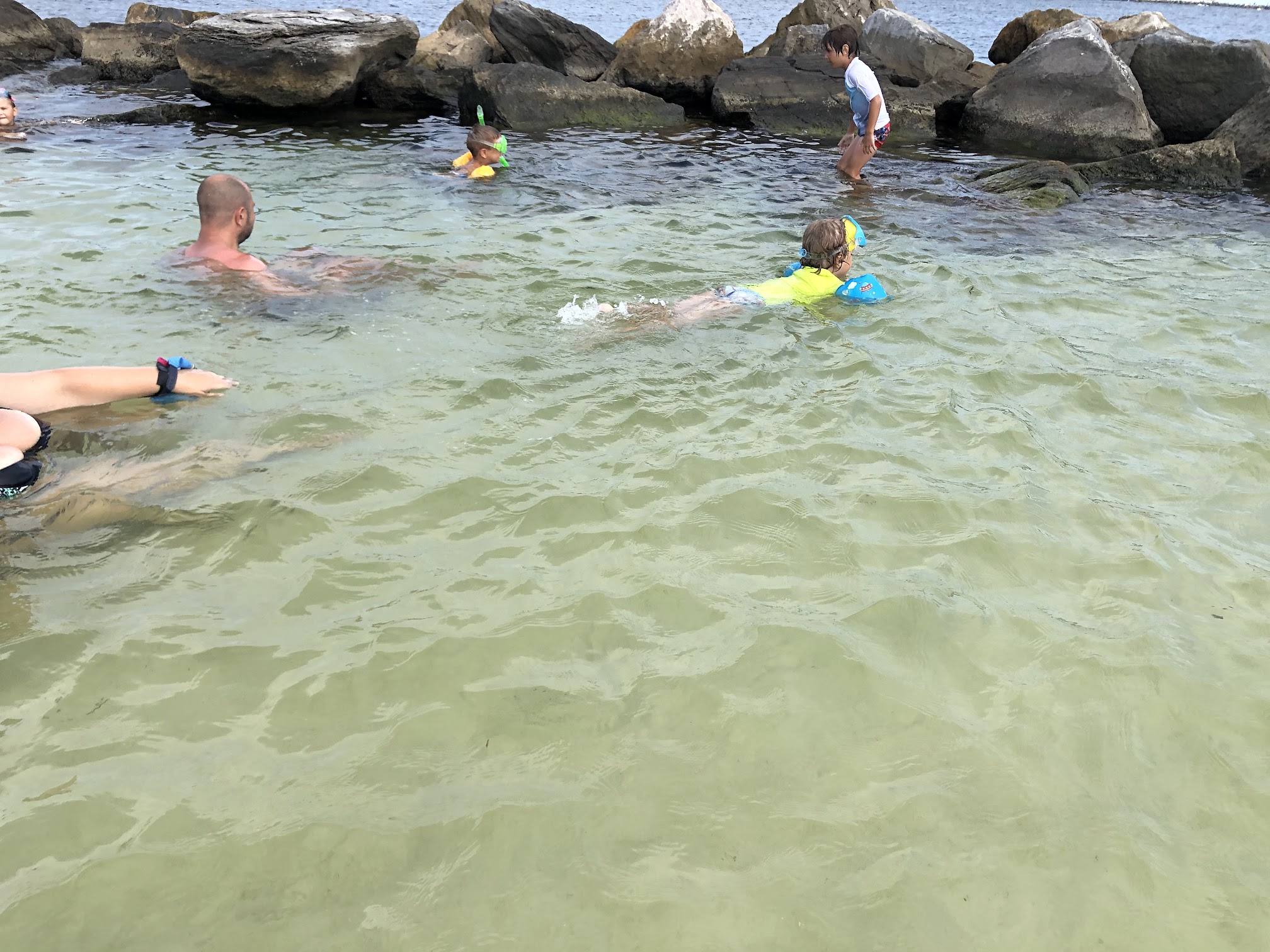 Best spot for little kids! There's a small little "kiddie pool" area, i like to call it, right along the rock wall, see my photo. We did see 3 large jelly fish dead on the rocks in the bigger tide pool area though, so keep an eye out. No jelly's in the smaller kiddie pool area so that's a plus!