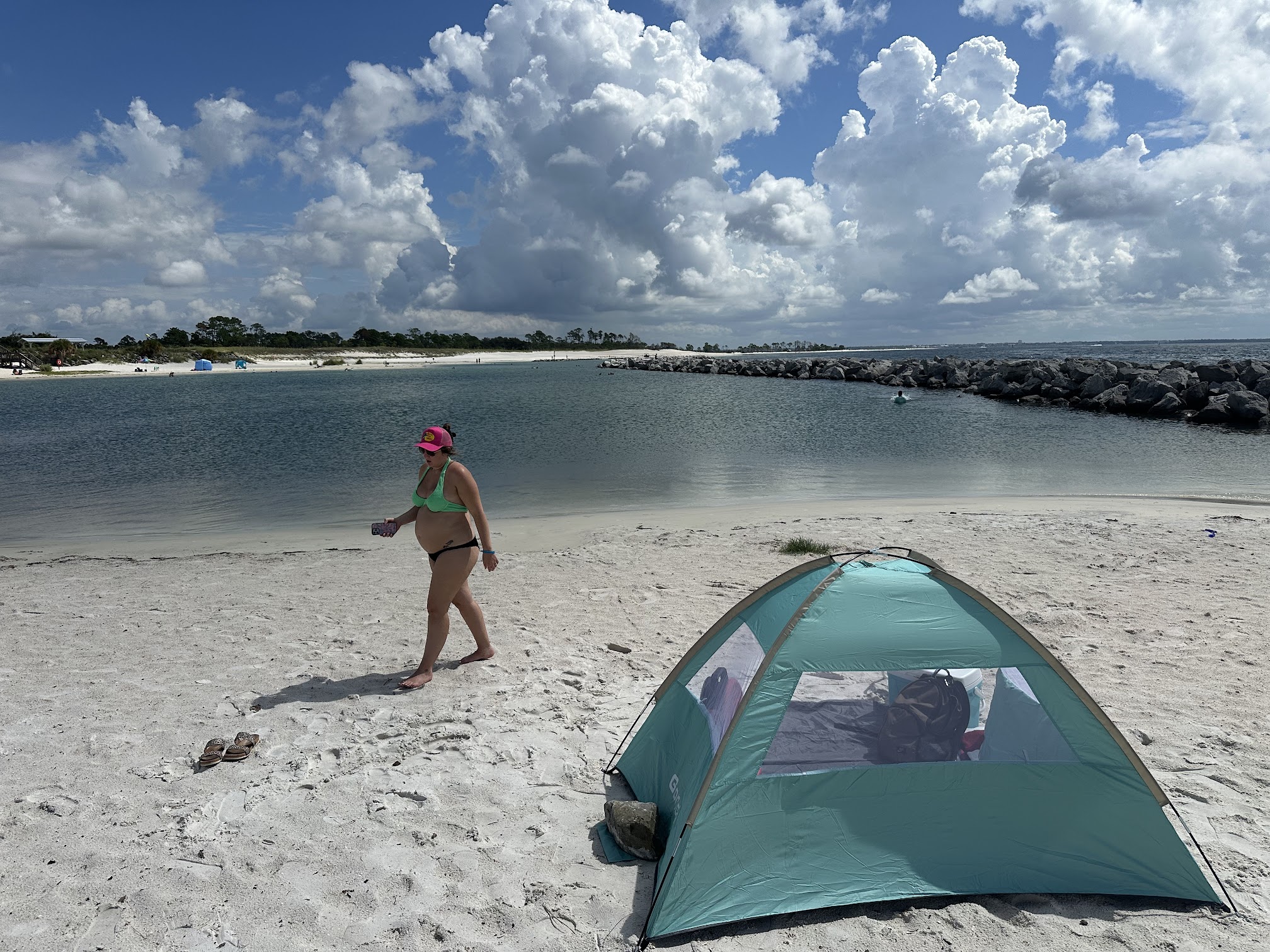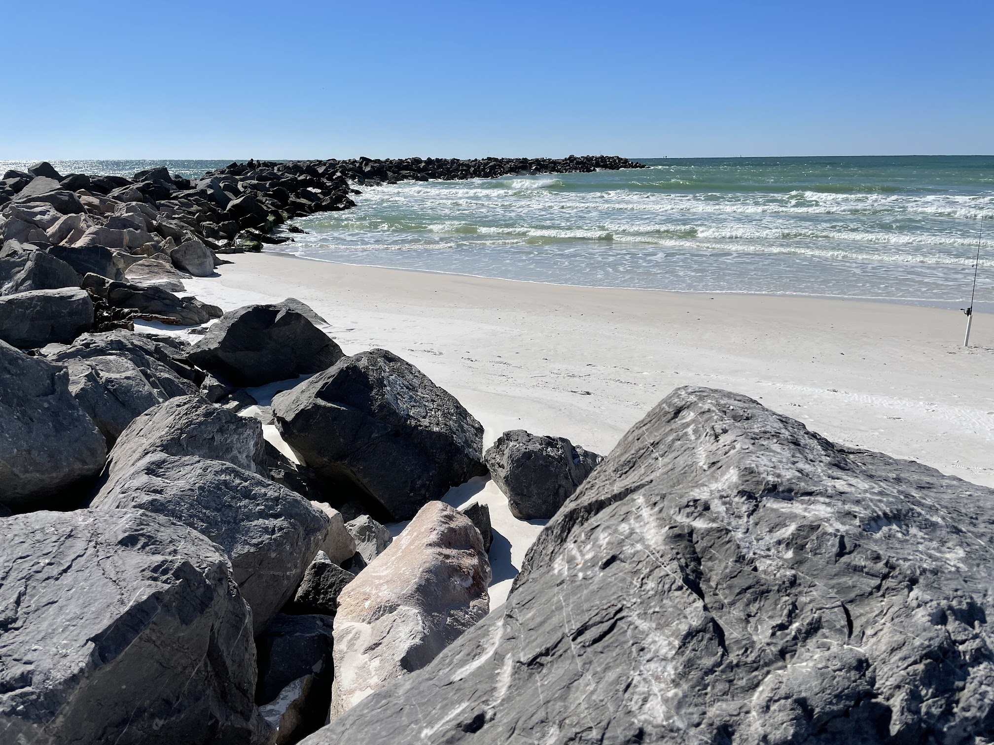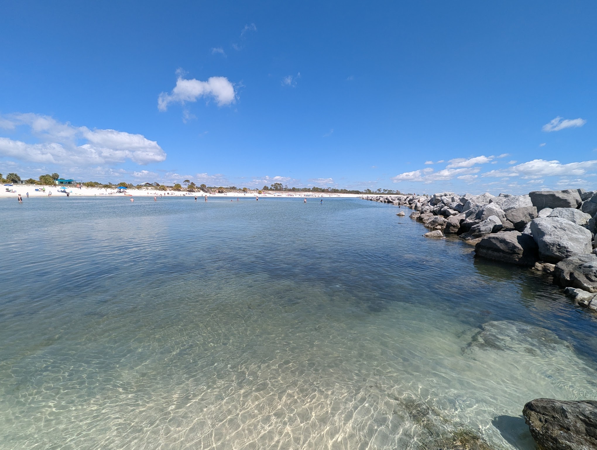 Very nice beach behind the jetty. Shallow, super clear water. Look for comb jellyfish (they don't sting) sand worms, and crabs. You can scoop up the comb jellyfish. There's a store, snack counter, changing rooms, and picnic shelters by the parking lot. The gulf coast is just the other side of the sand dune. Went on a weekday morning and crowds were not a problem.