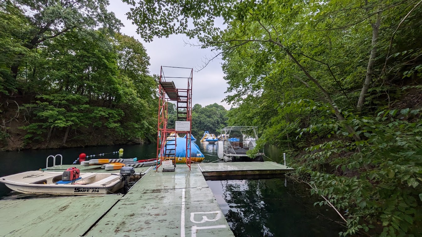 What are people saying (AI review summary)? This water amusement park offers a fun and physical experience with activities like swimming, climbing, diving, jumping, and various inflatables, including a hamster wheel and a zip line/water slide. The water is consistently described as clean, clear, and beautifully colored. Staff and lifeguards are highly praised for being amazing, friendly, helpful, and ensuring safety. Facilities include camping options, quiet areas, pavilions with grills, a snack shop, bathrooms with showers, floating docks, and shaded areas. While it's primarily designed for groups and organizations like Scouts, church groups, and school field trips, it's highly recommended for team-building and youth programs. Located about 50 minutes from Baltimore, it provides a wonderful experience surrounded by nature.