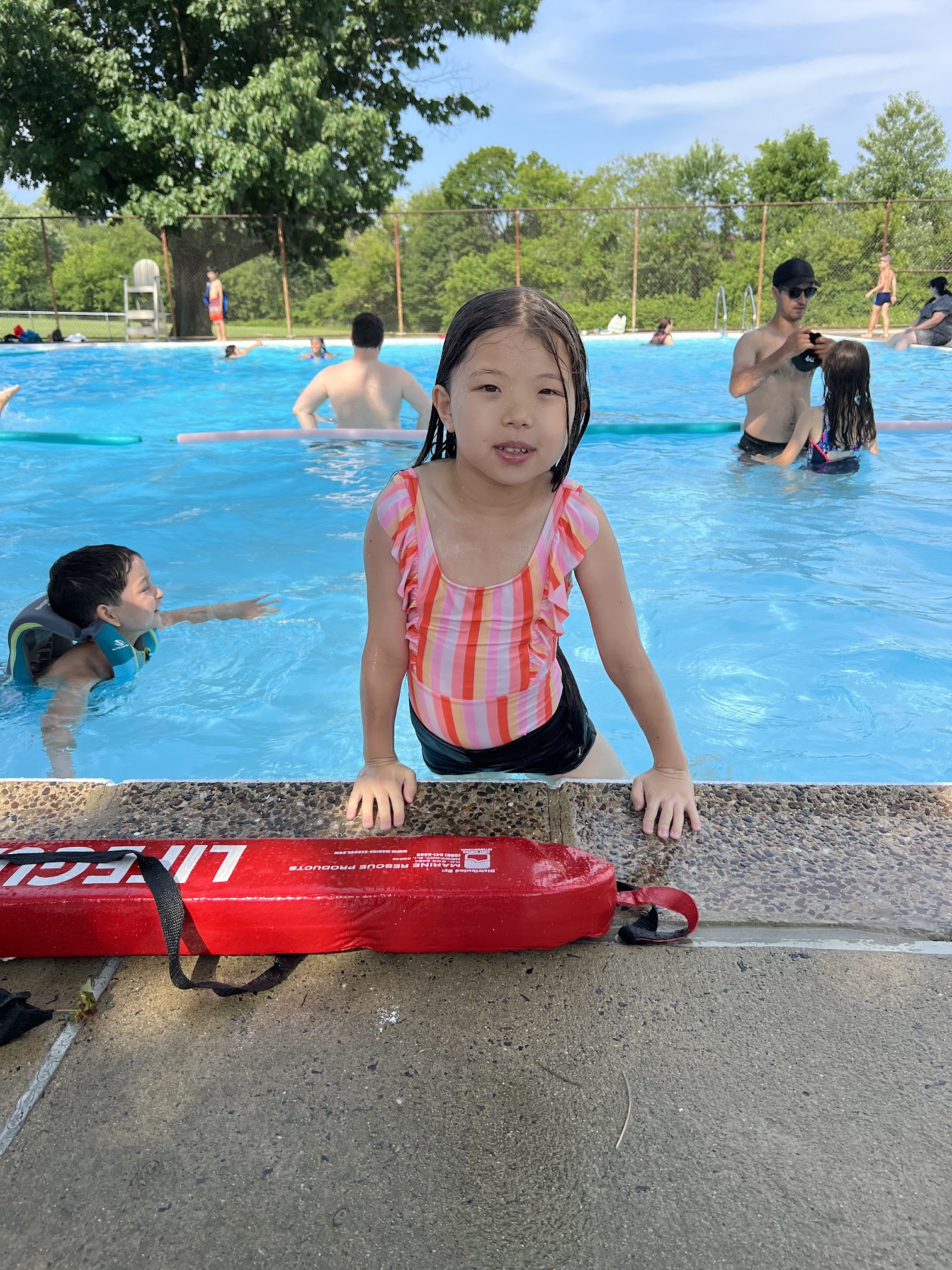 Nice clean pool. Nice playground and water fountains for the kids to play in on the hot days. Pool has different depths. So many kids and parents of similar age ranges so they make friends easily each time we go. Allowed floats and T-shirts, unlike other public pools. Staff is super friendly and helpful. Has later hours than most pools. No Id, registration or fee required. Really glad we found this nice, clean, fun pool. Go try it!