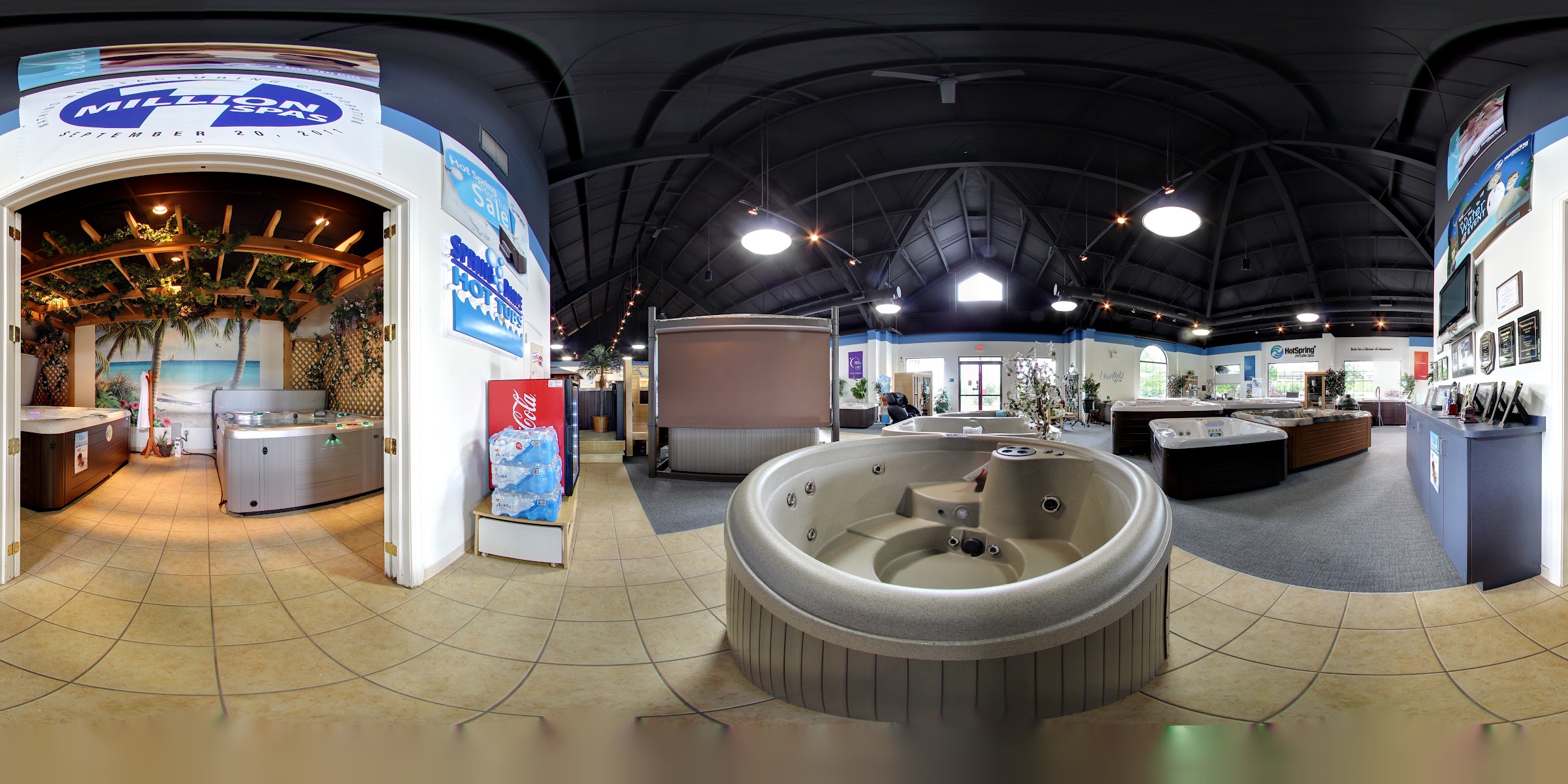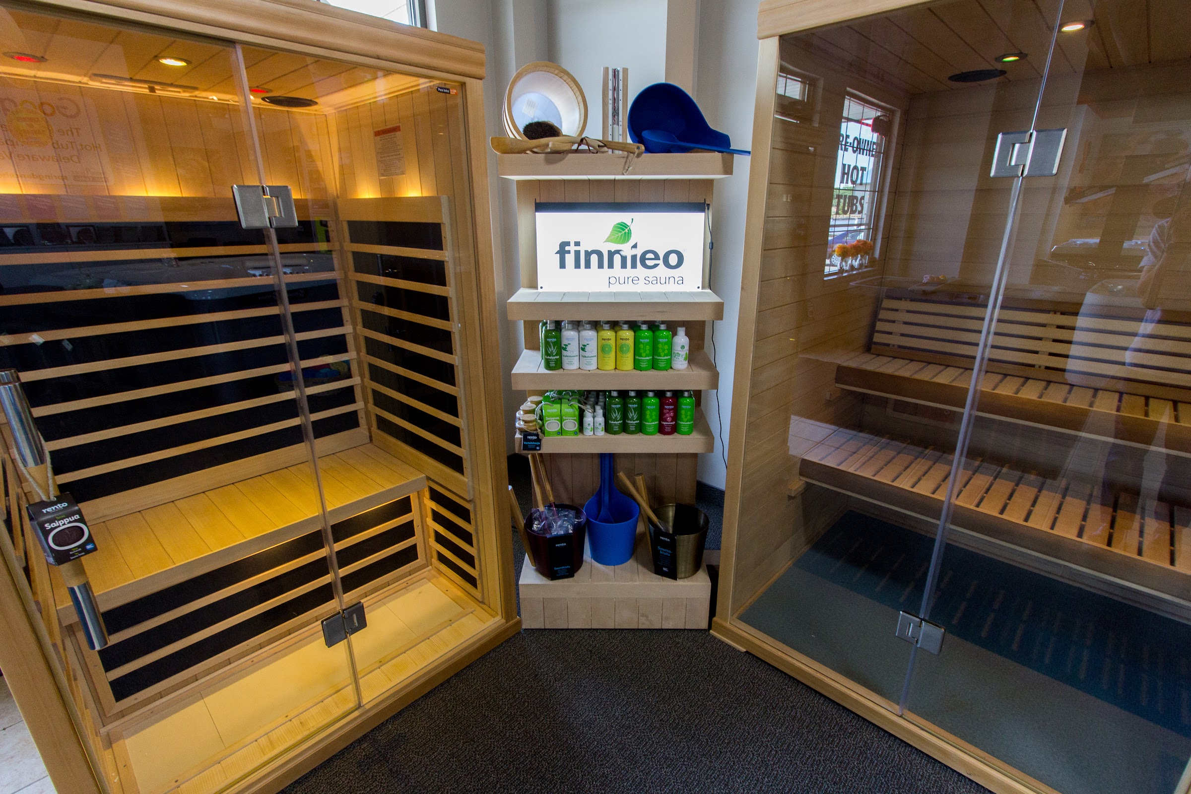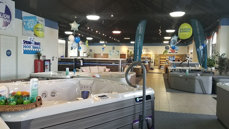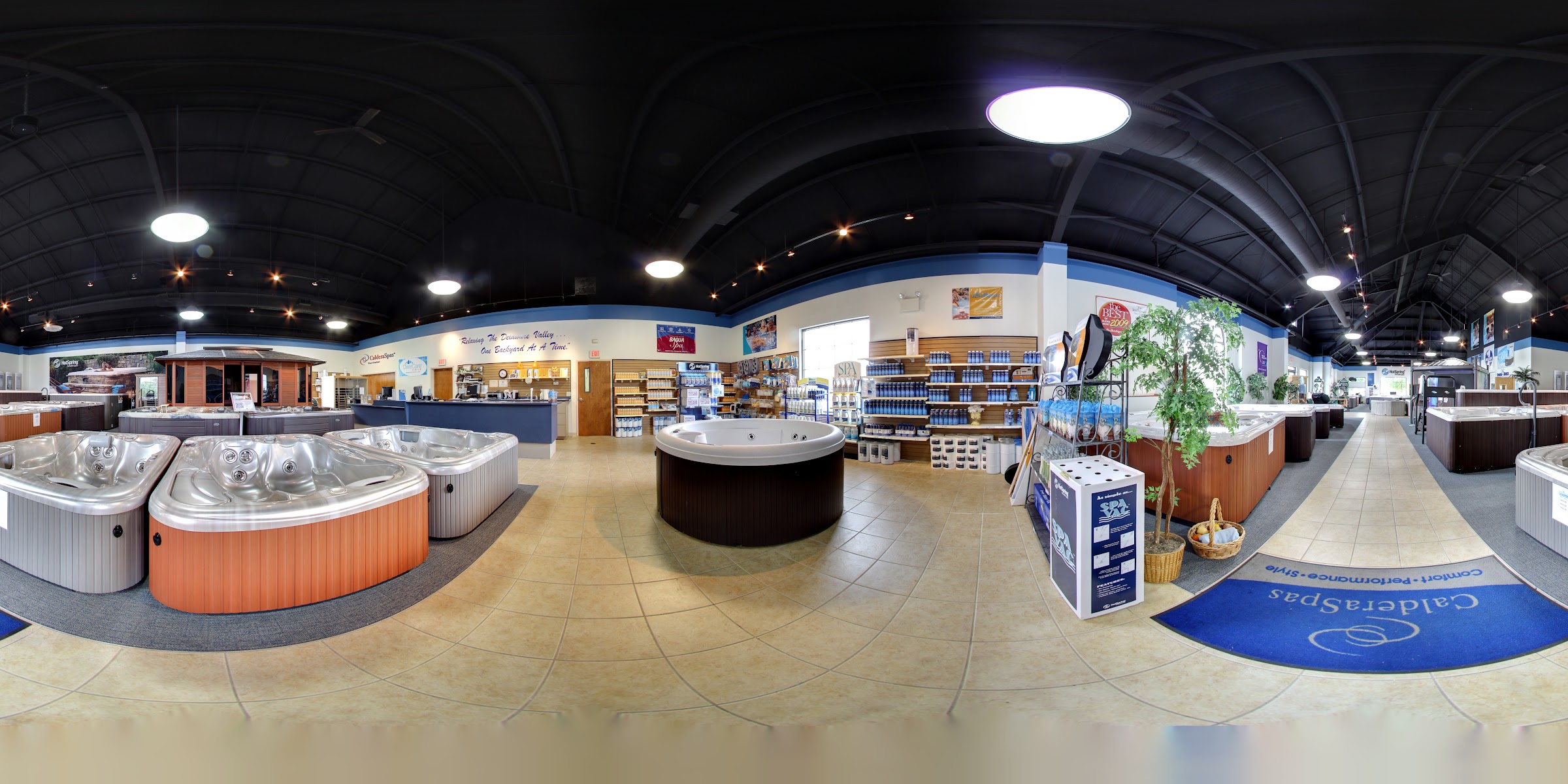 Relaxed store selling hot tubs by names including Hot Spring, Caldera and Jacuzzi.
