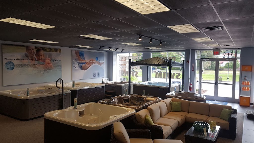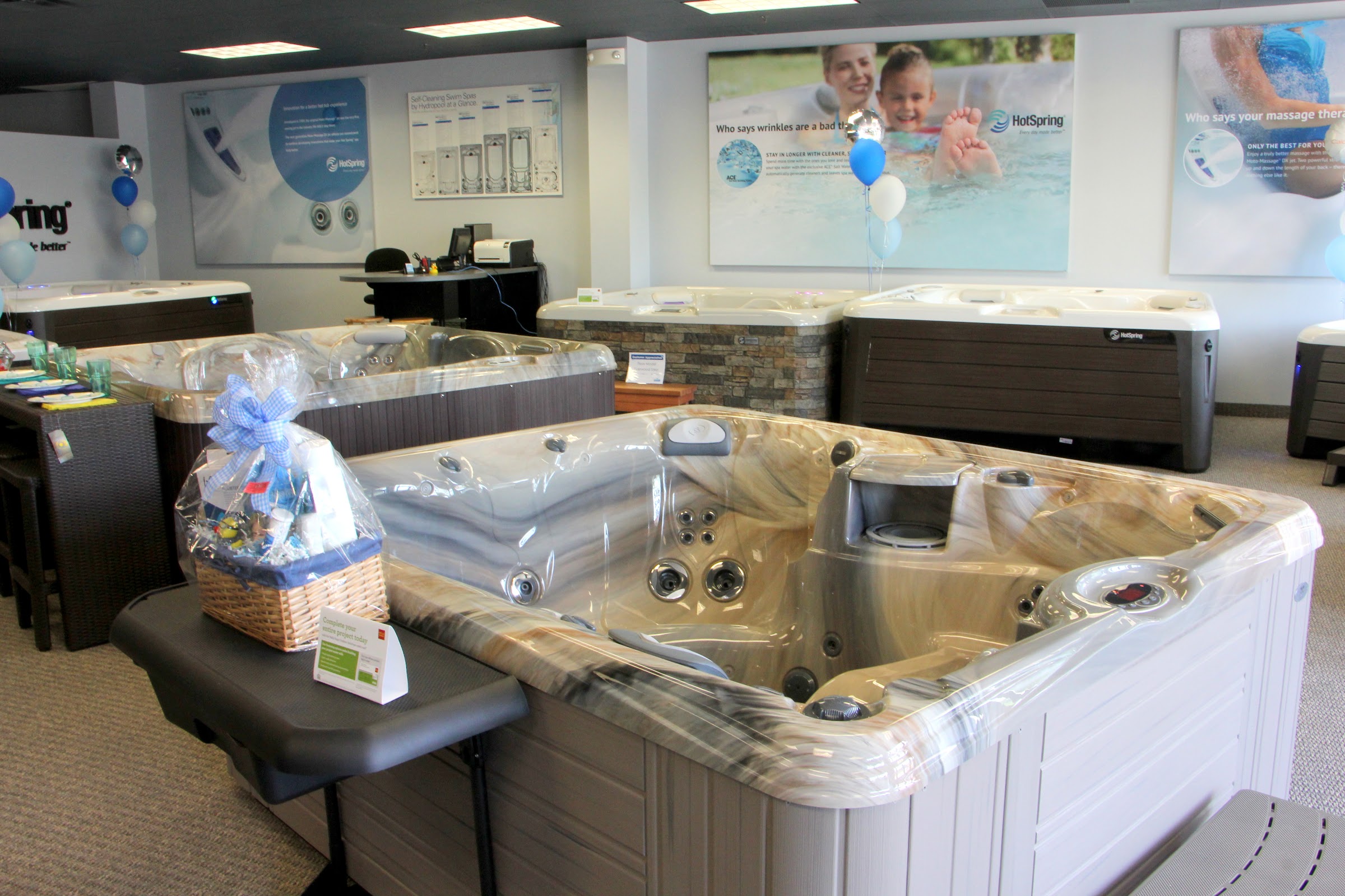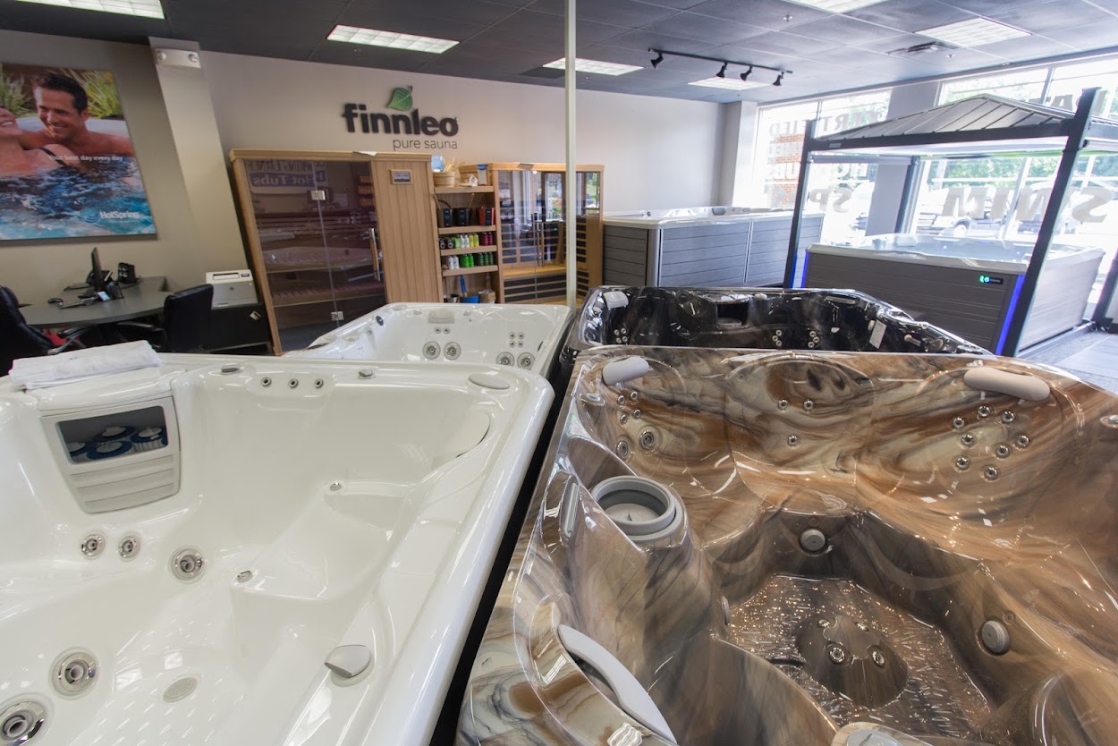 Showroom featuring a variety of hot tubs, swim spas, and saunas, plus patio furniture.
