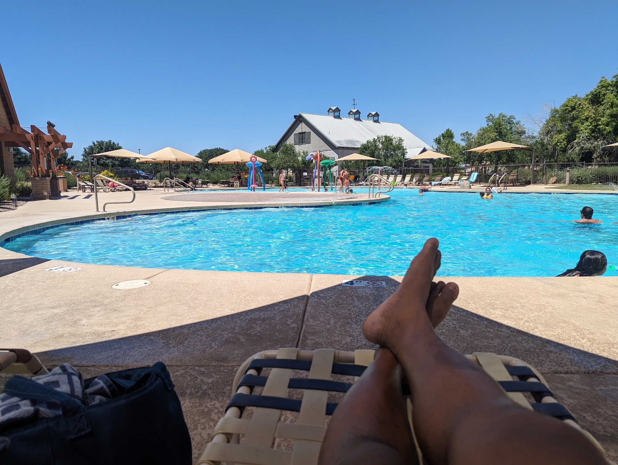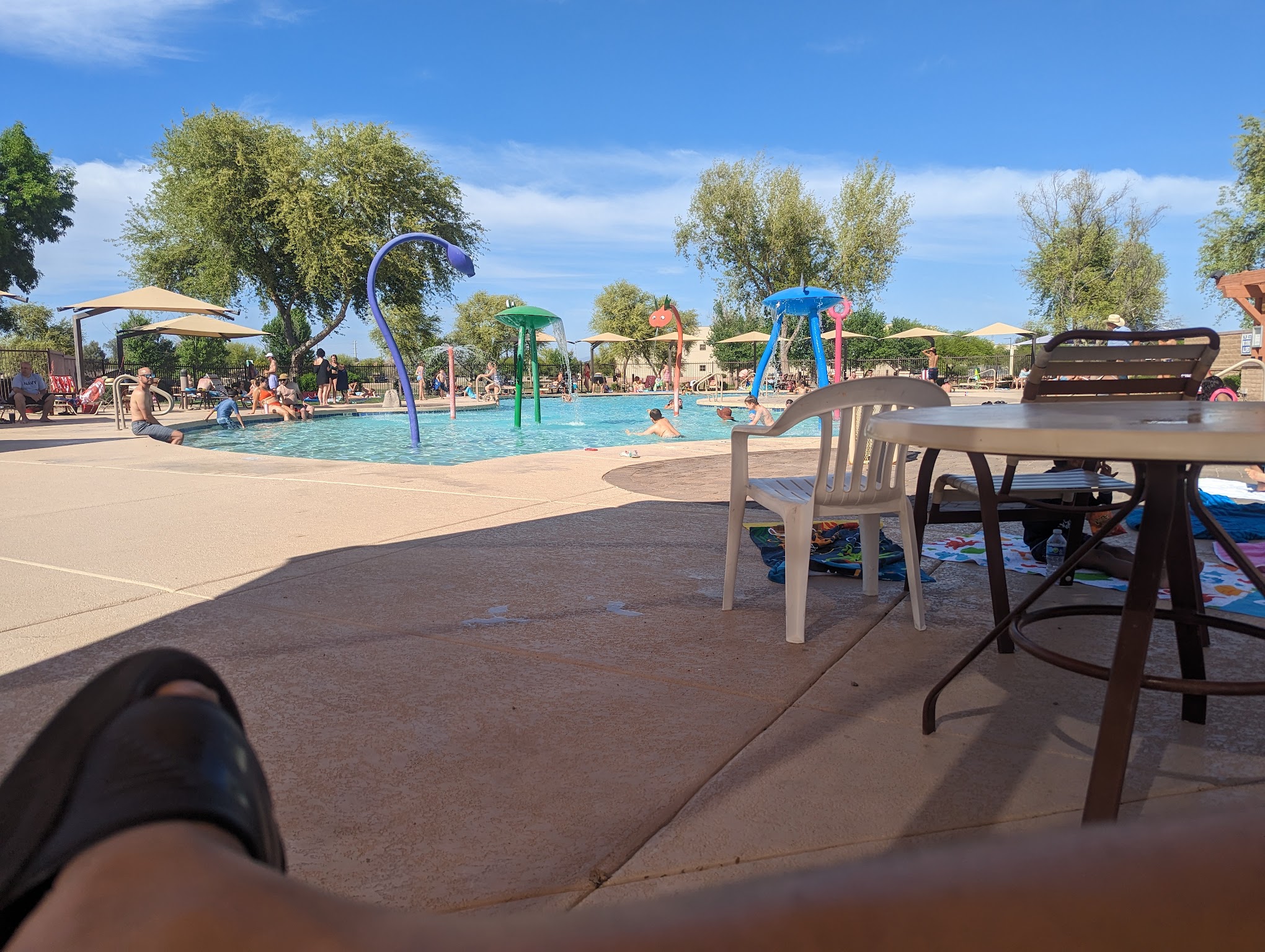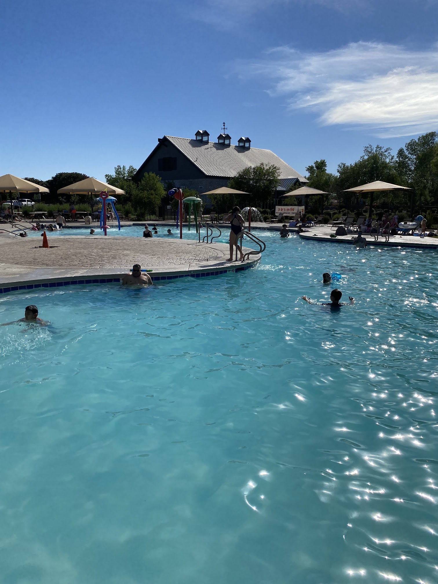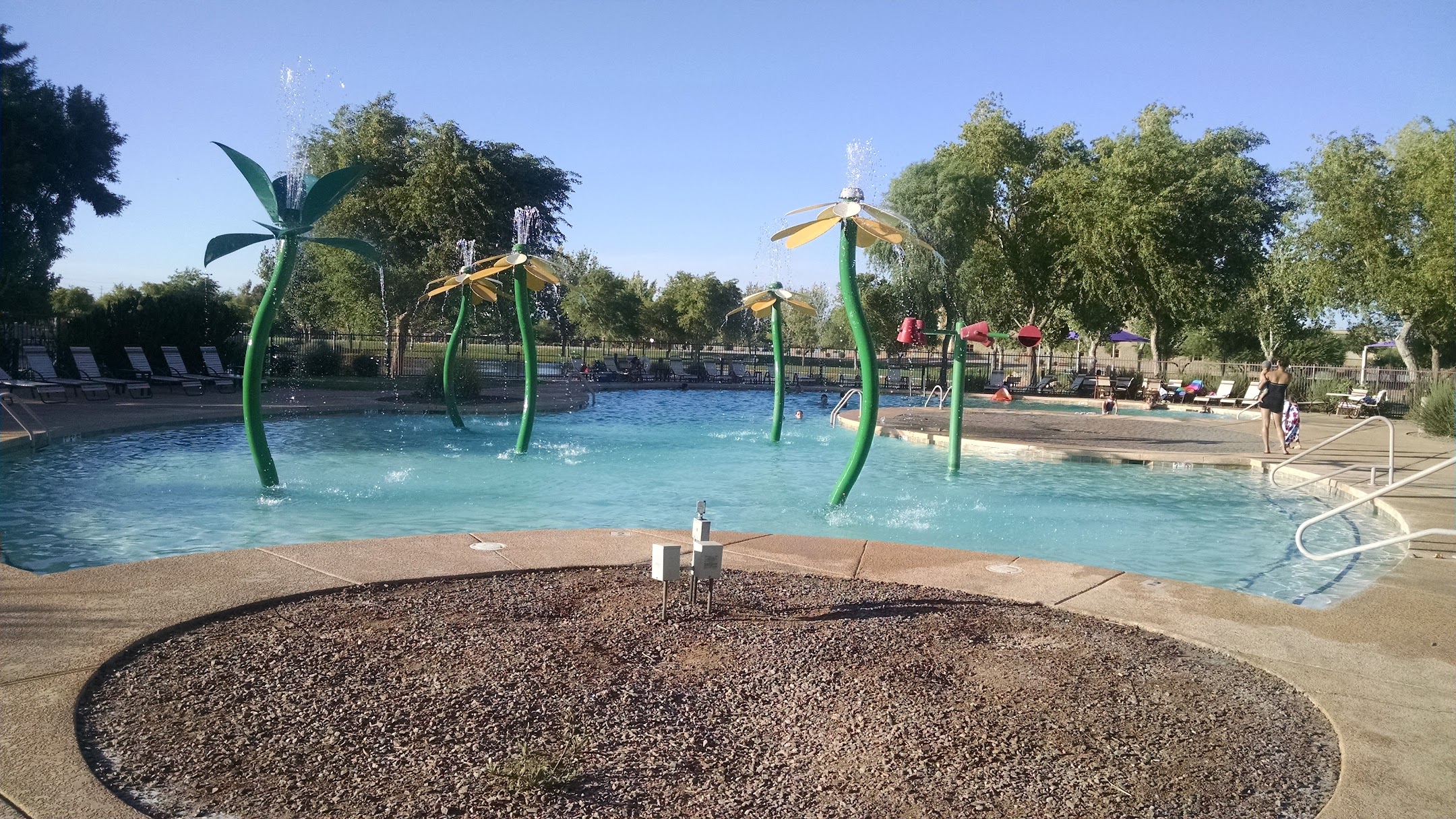This pool/park is so nice and clean. There are water features for the kiddos. The pool is a fairly large size and not to deep-abt. 6ft. It has never been crowded the times we were there. There is a lake and path to walk on around it adding to its ambiance.