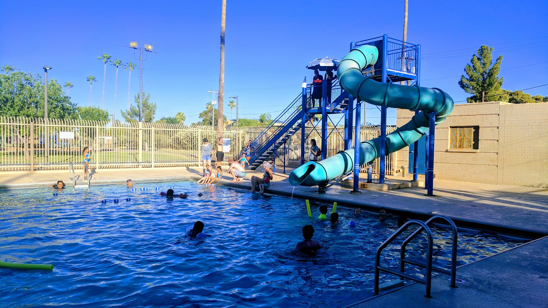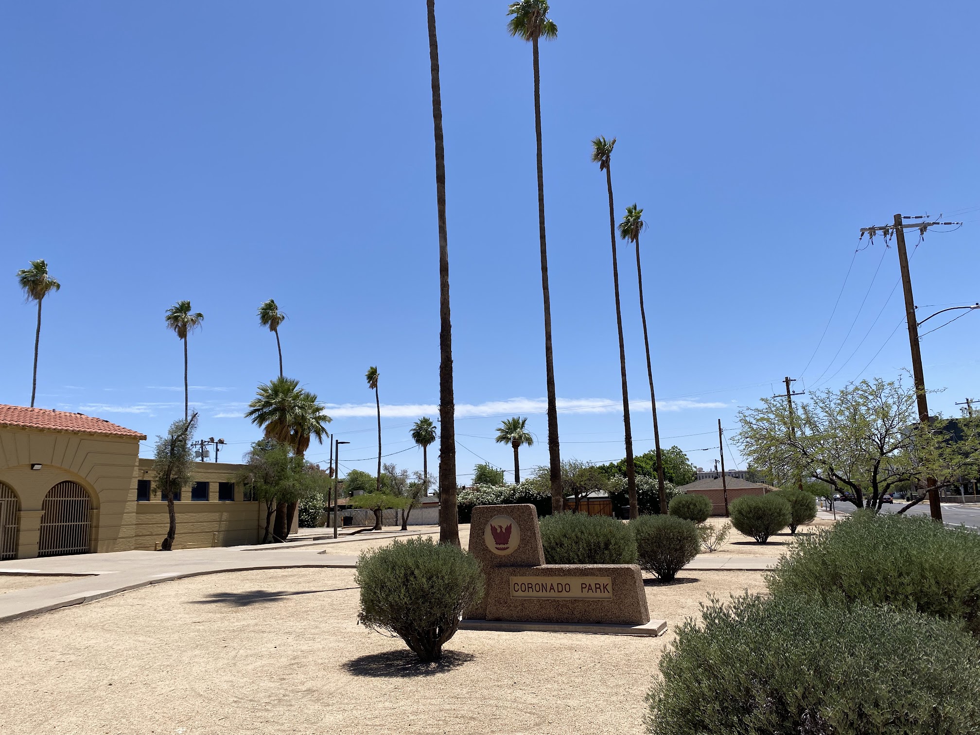 Coronado Pool, located at 1717 N 12th St, Phoenix, AZ, is a seasonal outdoor public swimming facility. It features a 6-lane, 25-yard competition pool, a separate shallow wading pool for young children, a diving board, and a water slide. The facility offers open swim, lap swim, swim lessons, and a youth swim team, with shaded areas and lounge chairs available.