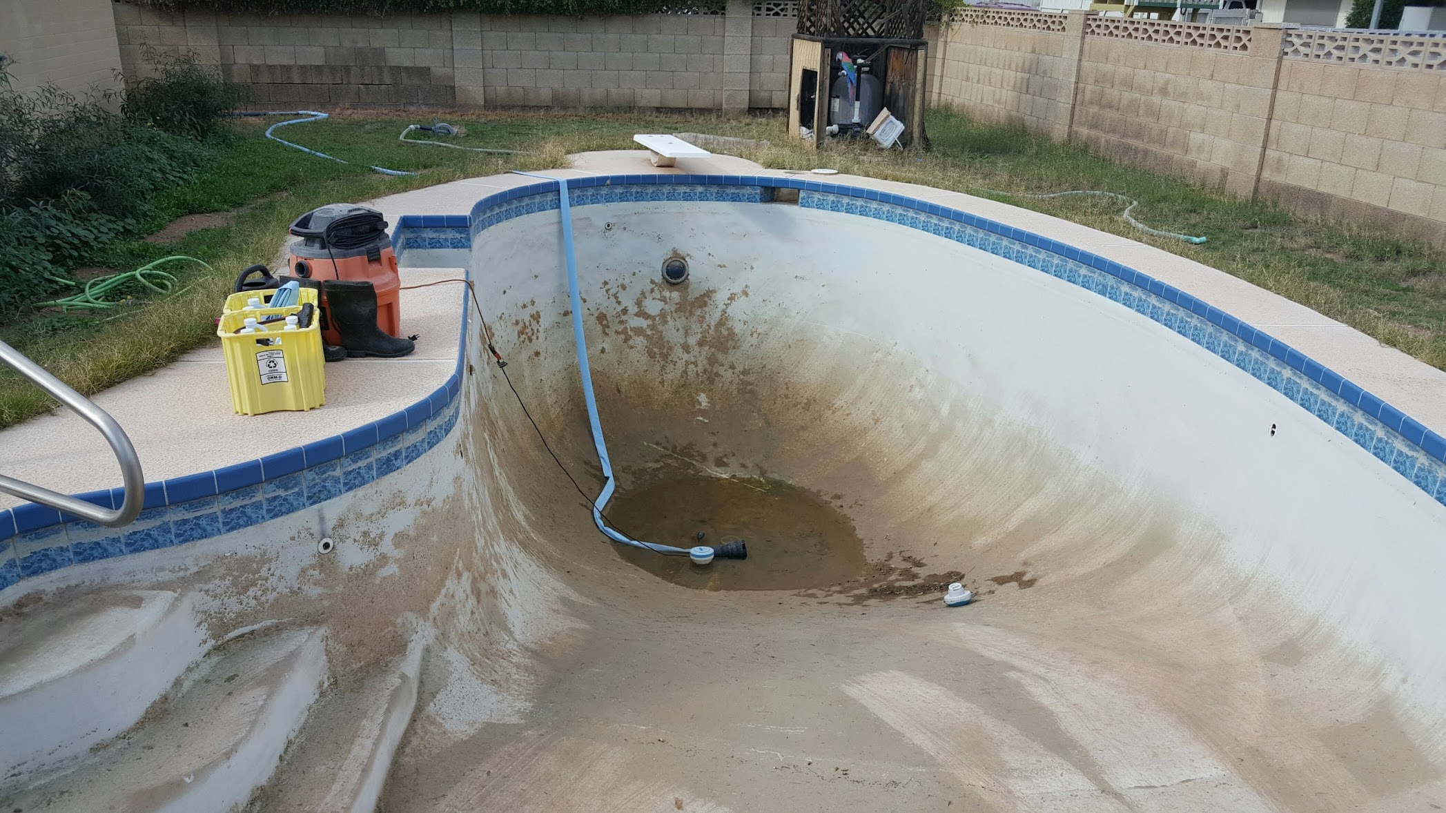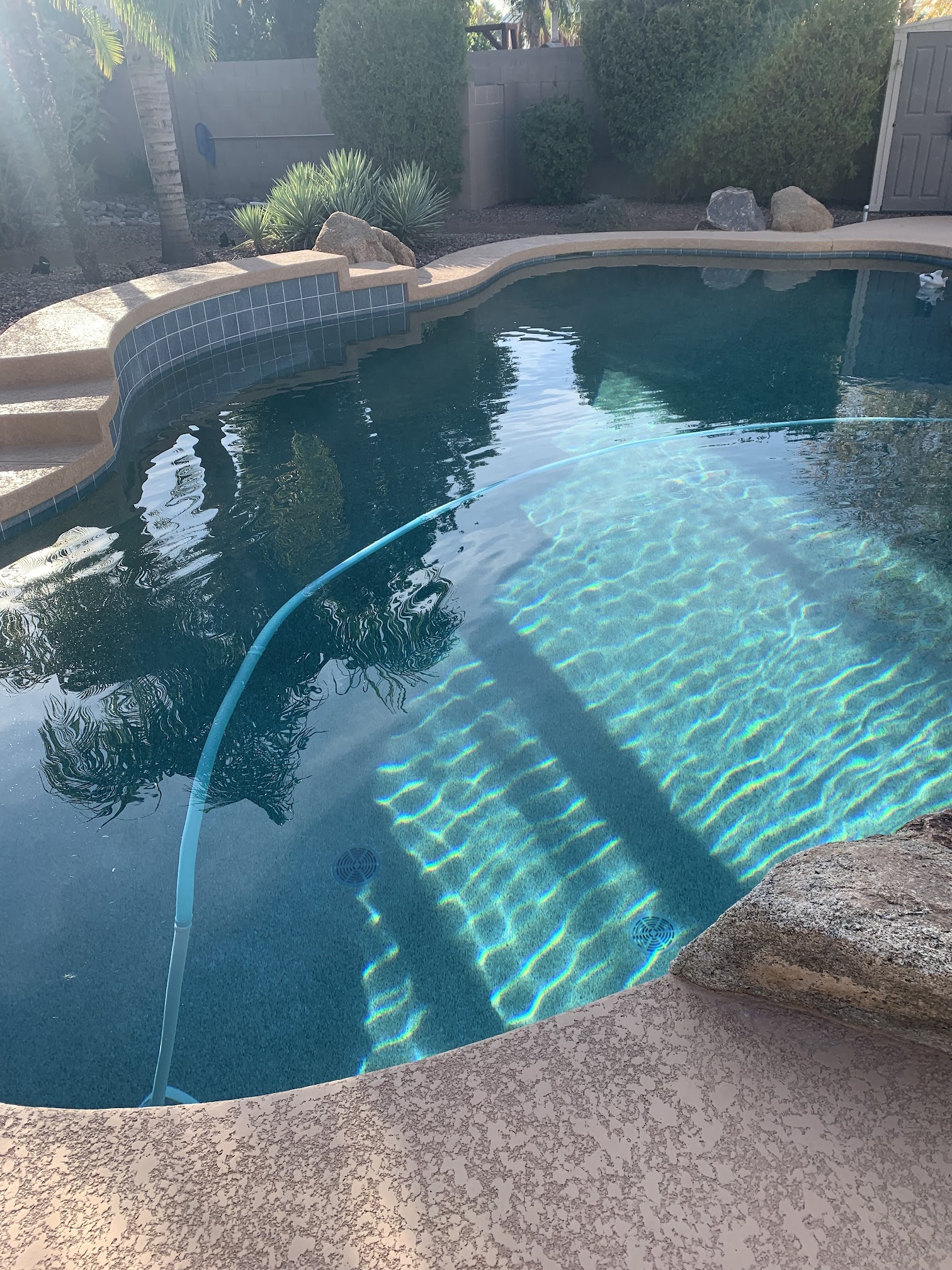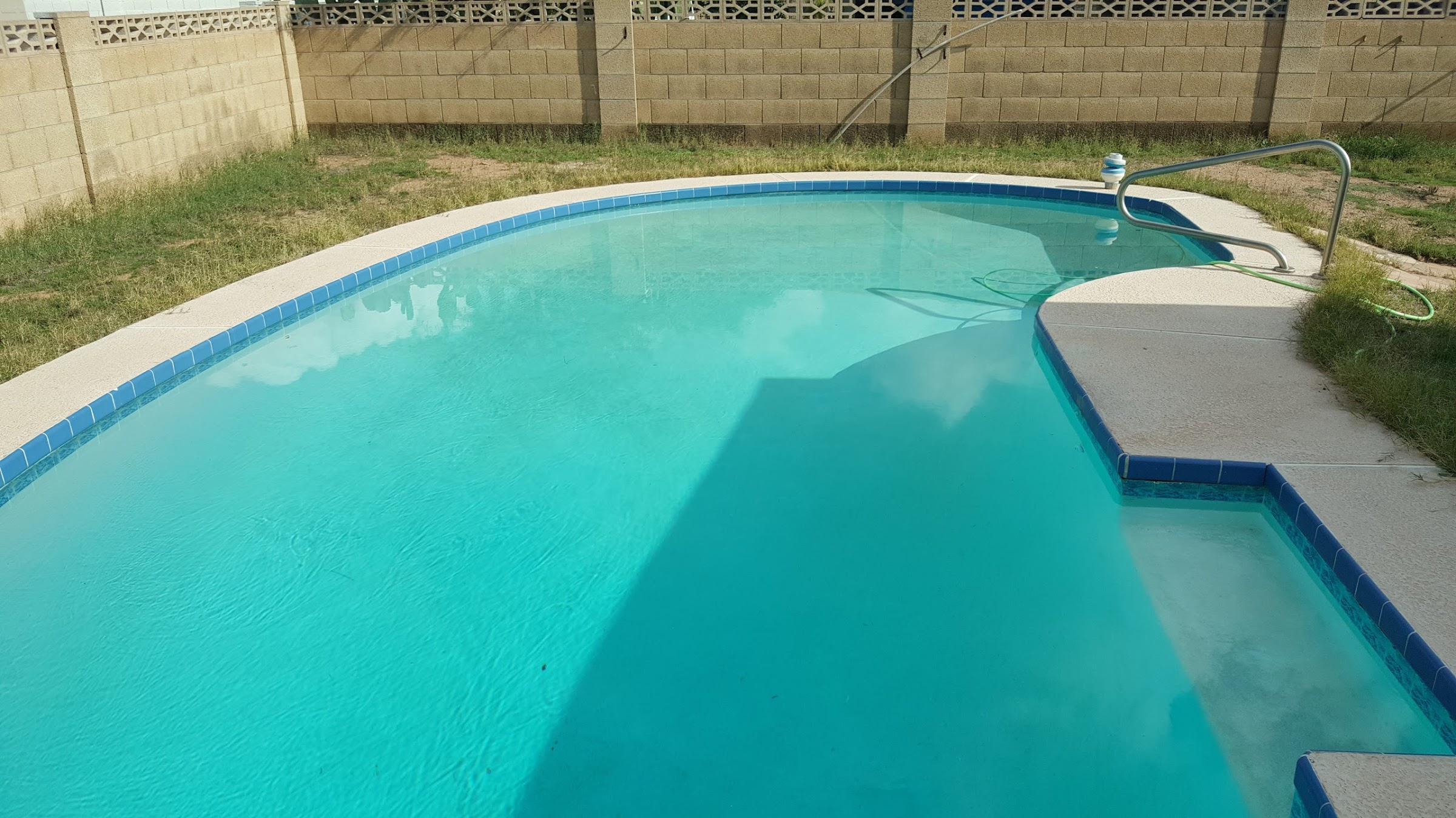 We had not changed the sand in our filter for at least six years and our water was DEAD. Jason diagnosed our problems and explained to us in layman’s terms what we needed. He scheduled the work the next week at a fair (actually a great) price. Chris replaced the sand in the filter with no mess and Jason drained my green water and sandblasted the scale off the tile. The water I now crystal clear and the tile looks brand new. Great company and staff. Drew who checks the pool weekly does a great job and informs us if anything changes. Here are some before and after pictures.