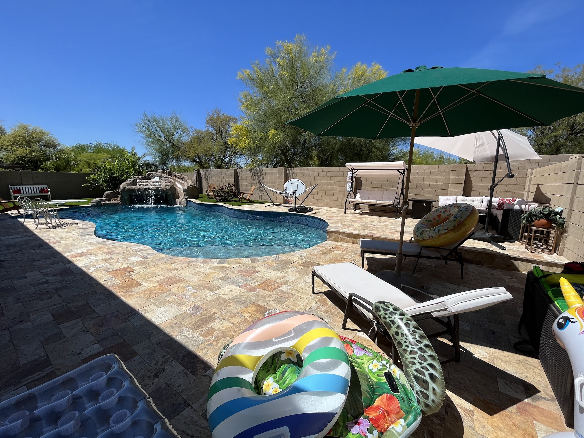 Fun In the Sun Backyard Oasis in Mesa, AZ, offers a private rental space ideal for gatherings or relaxation. This backyard features a large heated swimming pool, a hot tub, a BBQ island, and outdoor games such as corn hole and ping pong. Guests can enjoy ample seating, shaded areas, outdoor lighting, an outdoor bathroom, and a refrigerator stocked with complimentary drinks and towels.