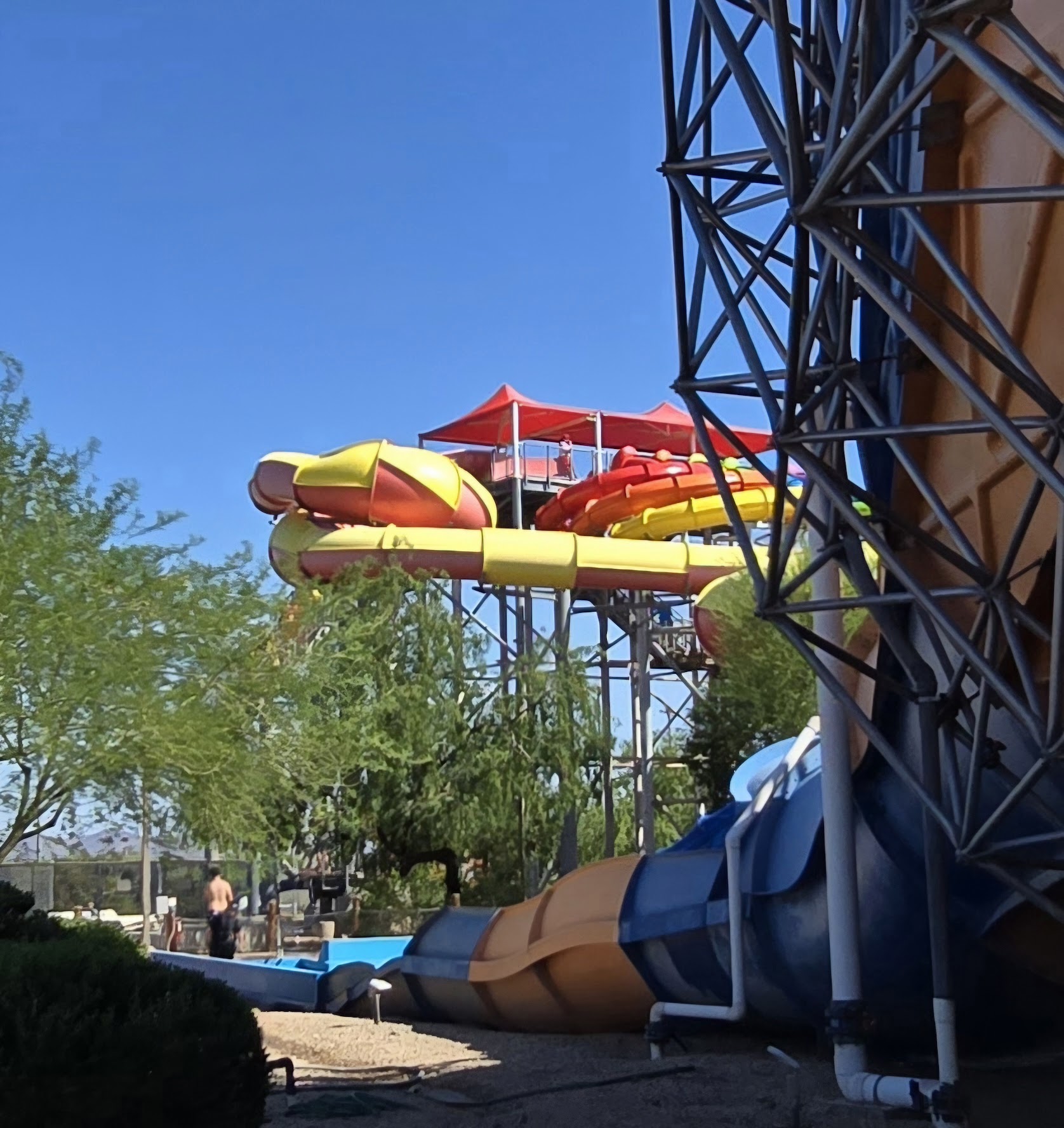 Spent the day here. Went on a Thursday so it wasn’t horribly crowded. They seem to have changed their opening hours from 9am to 10:30 am so we sat and waited a while. Overall the slides are all well done and functional. The lazy river was good but needed more inner tubes. The wave pool was broken in the morning and was up in the afternoon but it isn’t a monster wave pool like the place in Mesa used to have. Food was good value. The cheese burger had 2 patties and probably a half pound. The chicken tenders had like a half dozen and the fries had plenty is seasoning. I bought a beer. Only 1 beer… because it cost $20!!!! For 1 beer. Maybe that was a little overpriced…. Lockers are available for use and you keep the code all day. The park was clean and staff seemed nice. We would likely come again