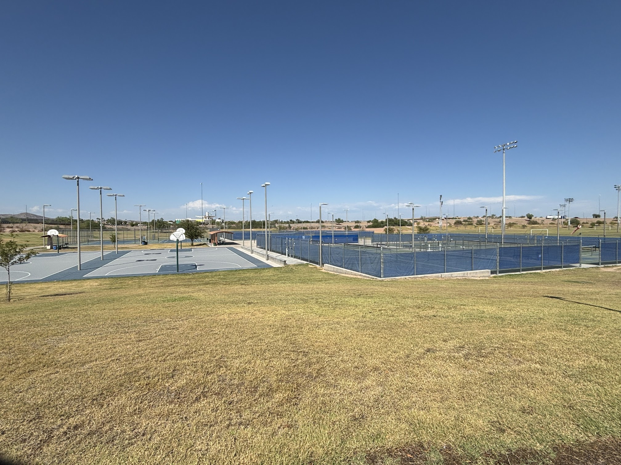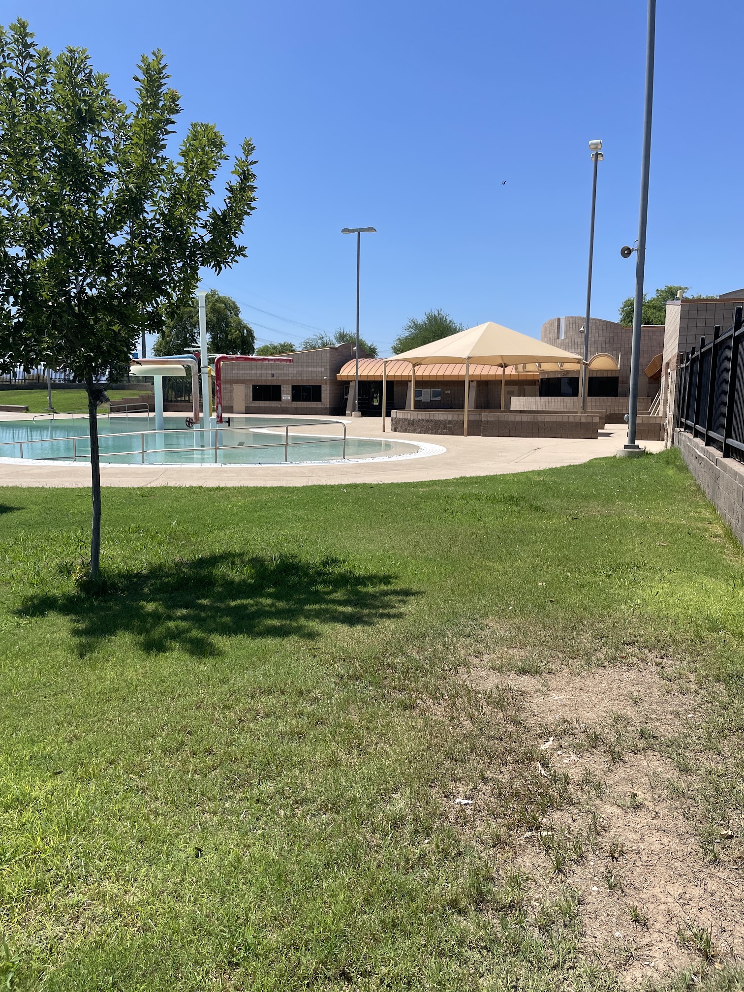 This is a great park with plenty of areas to spread out. Lots of nice picnic areas, basketball courts, pickleball, a skate park, two different walking tracks, and, of course, the pool and waterslide. There is also a large area accessible to the south of the park (which may or may not be part of the park) where you can go for a longer walk or run. The bathrooms are clearly handled by a septic system that is apparently above ground. If it is windy enough, you can literally smell them from over a half mile away. I have run in this park enough times to know exactly what the distance is. But, that isn’t very frequent, and overall it is a very nice park.