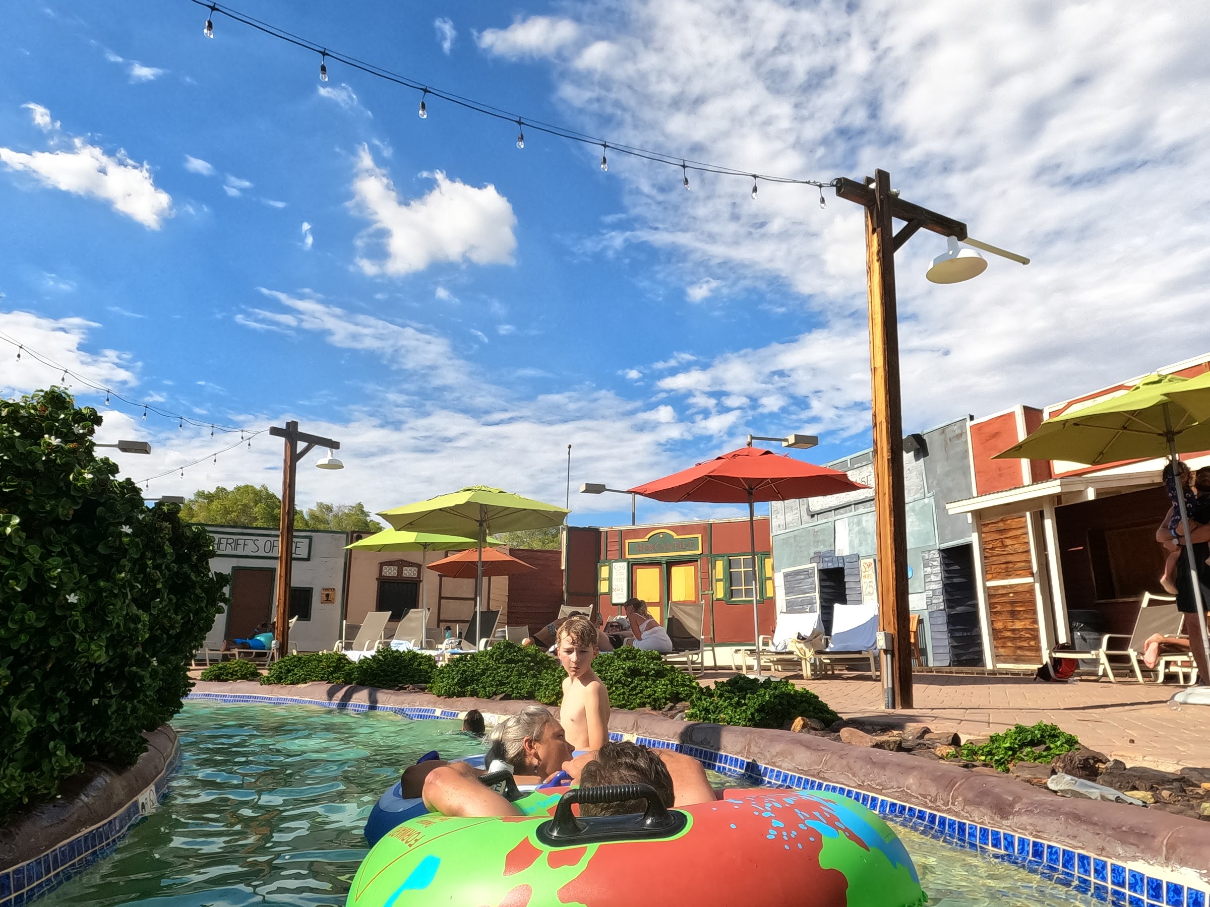 Fun fun fun! We drove there 2 hours before closing with barely sun, but we had still extremely fun! There's everything and enough for everyone. Lots of Recliners and towels, big pool has a volleyball net and a waterfall, a waterslide, a lazy river tubing with arizonian western themed decorations, mini golf ⛳️ and more! Own drinks and snacks are prohibited 🚫 but next to the entrance is a buffet with everything that needs, even beer and 🍹 😋. An American restaurant is also around the corner. I highly recommend this place for young and old 🙂❗️