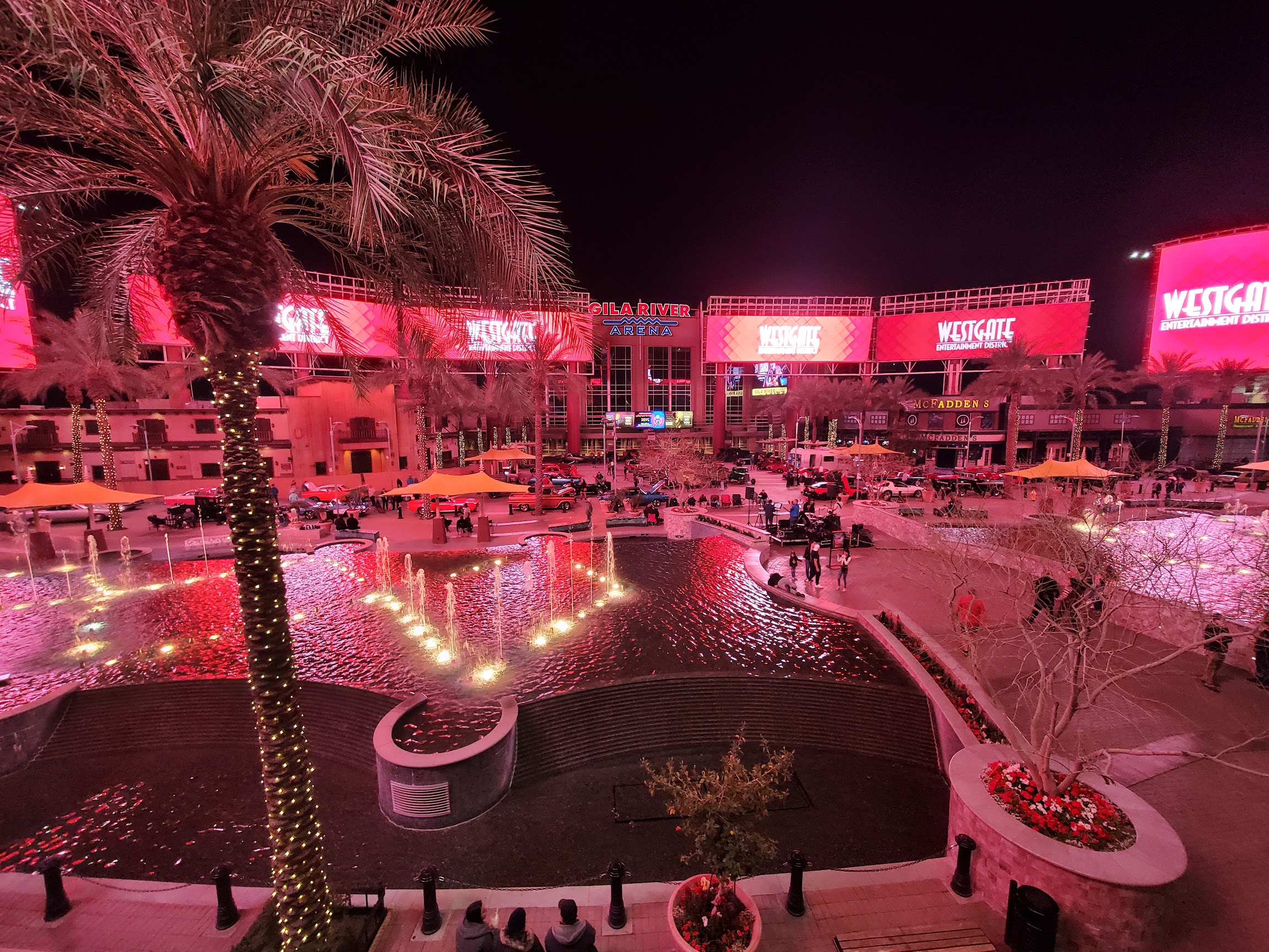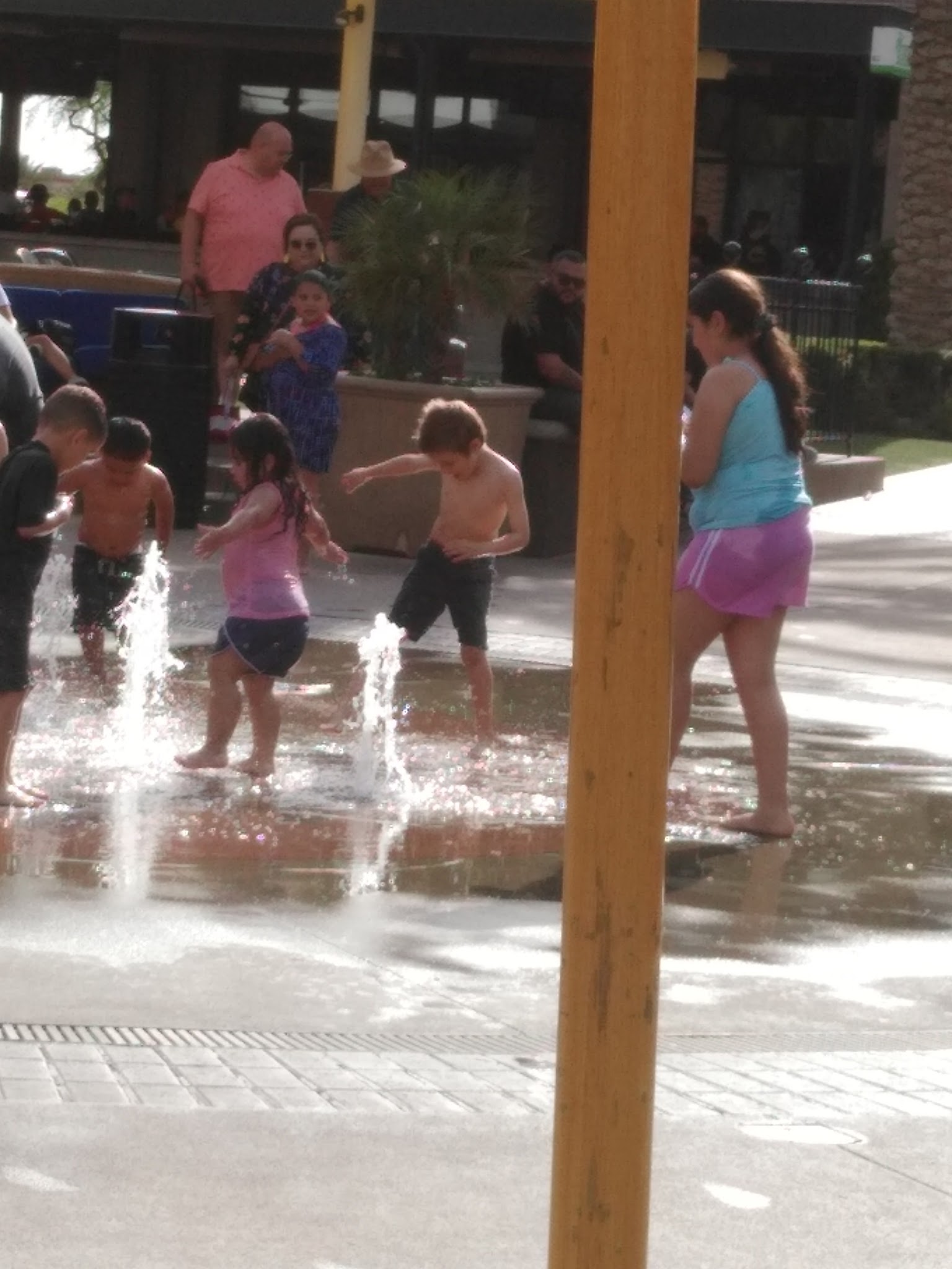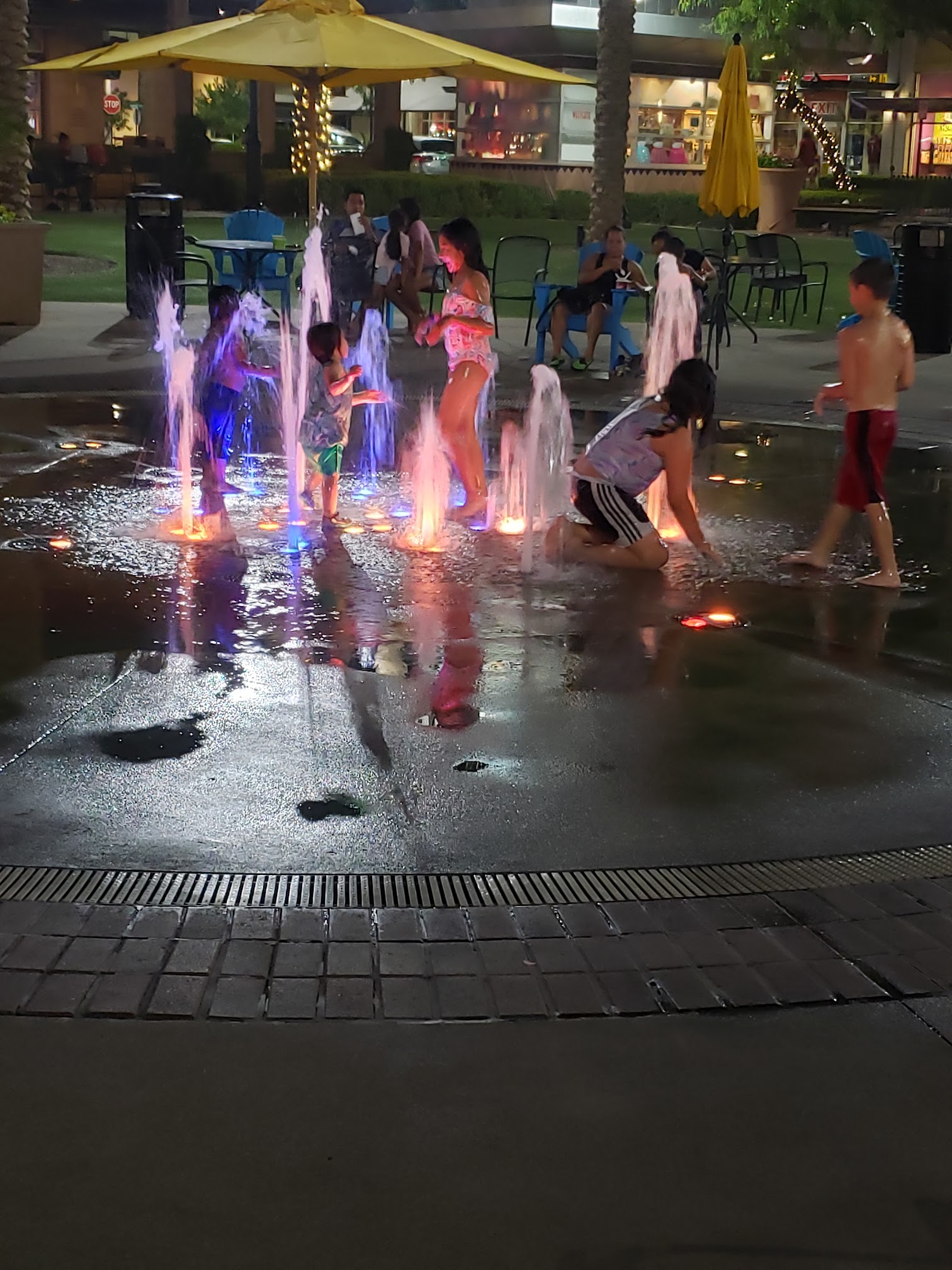 The splash pad for kids is small but very clean and nice. At night, there are colorful changing lights in place for the fun and safety of the children. There are patio tables and chairs placed around the open area in the small park, to sit and relax. There is also a decorative style fence to somewhat enclose the area. Often, there are musicians playing and/or singing for the public, free of charge. There are several restaurants, public restrooms, and small shops in the immediate vicinity.