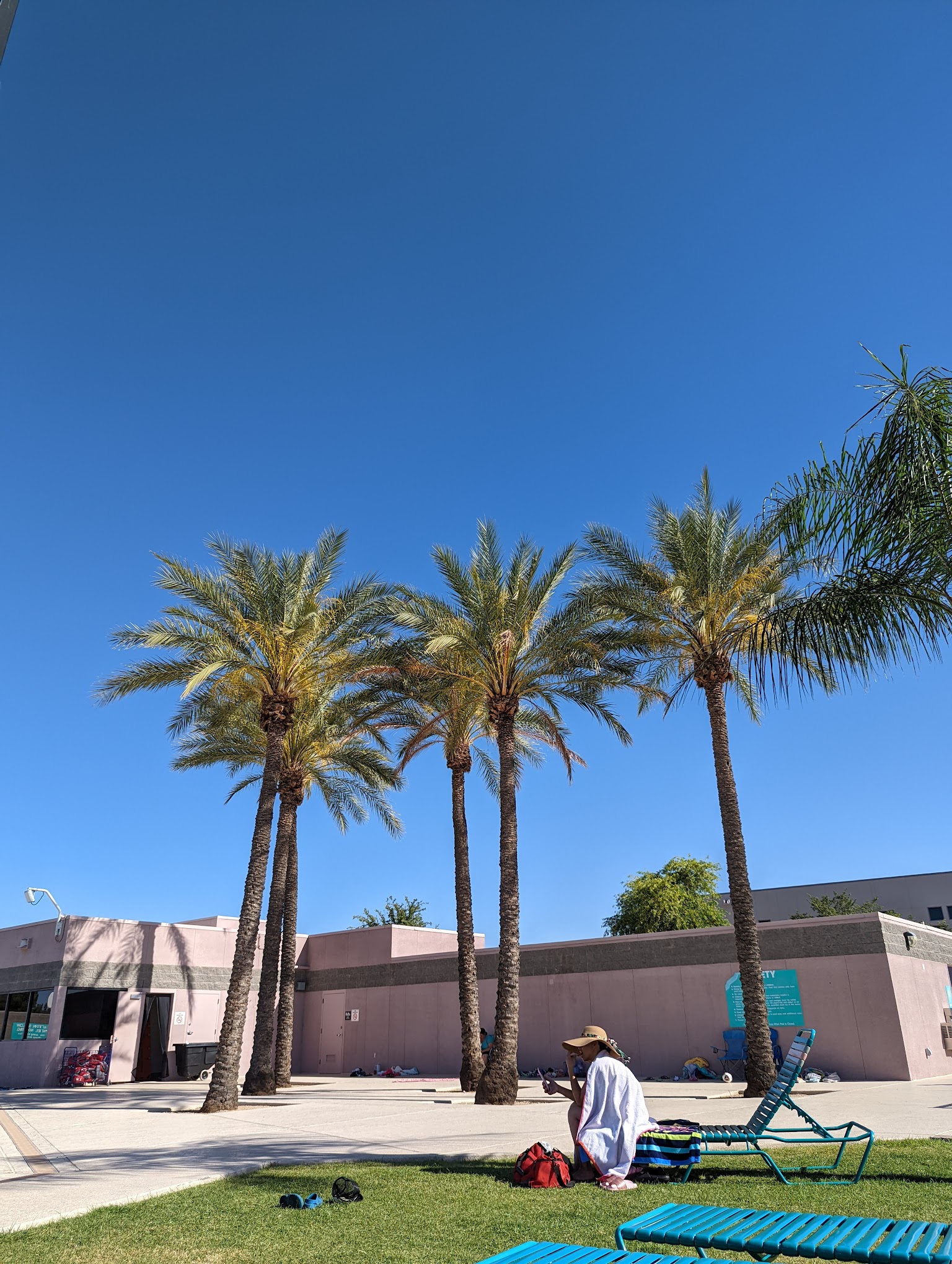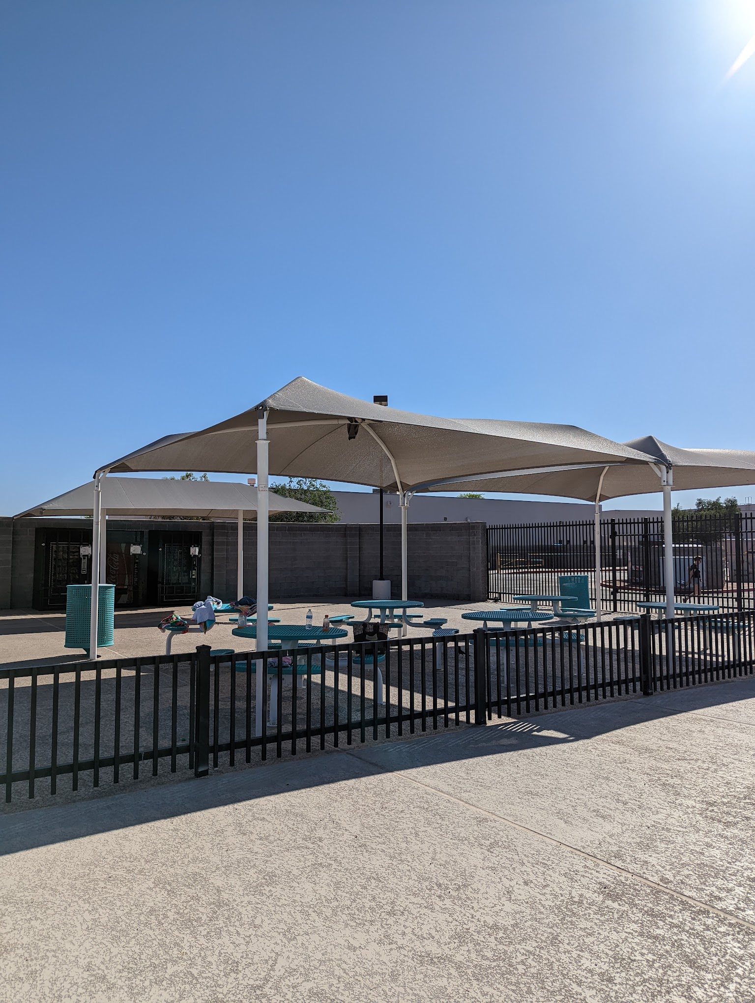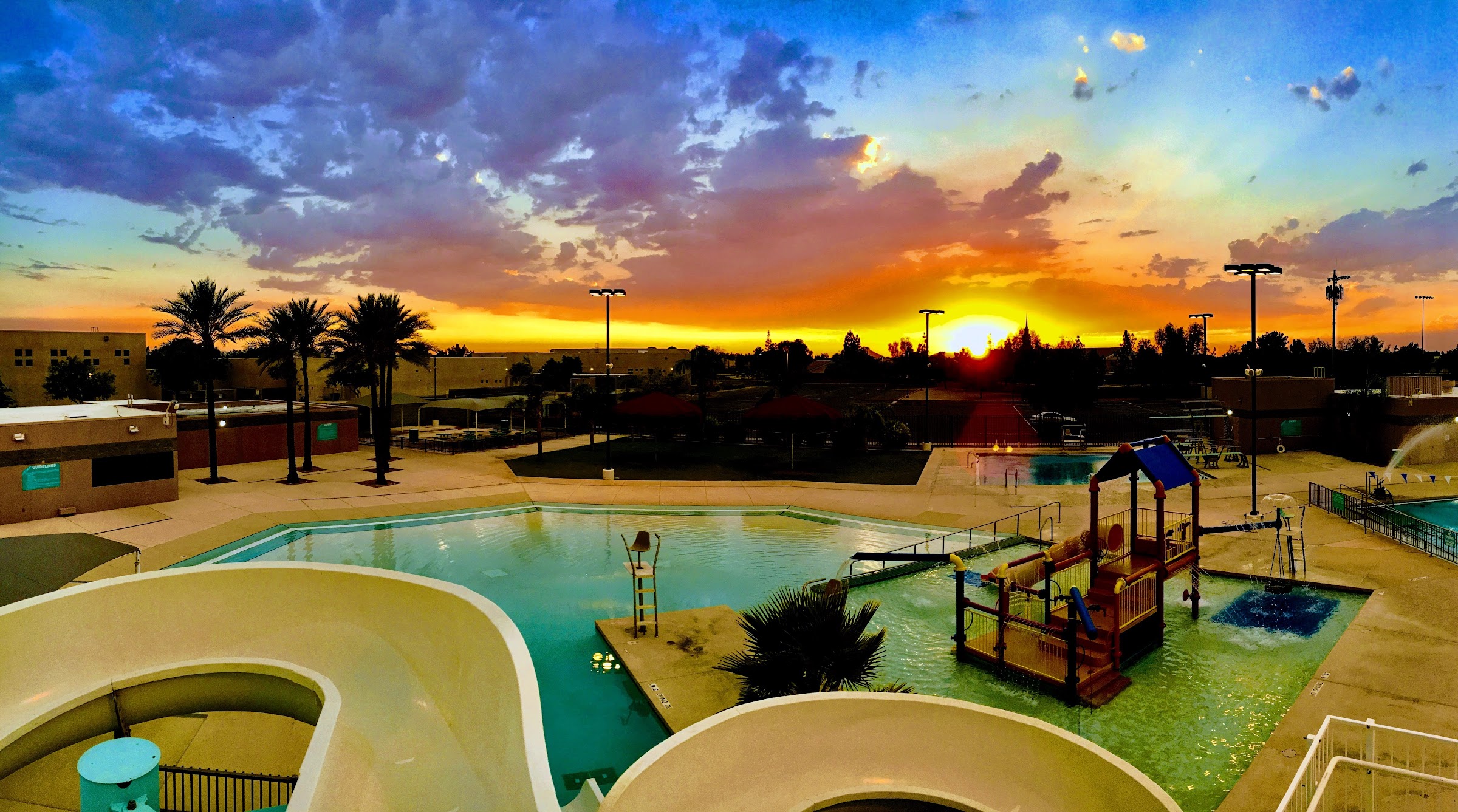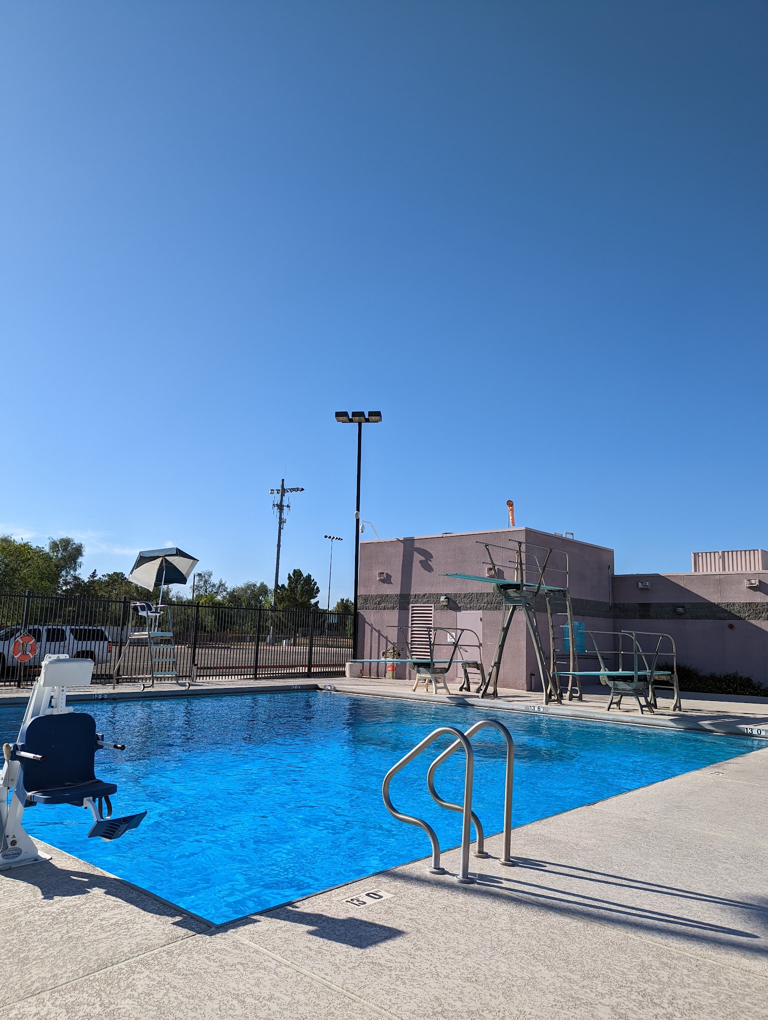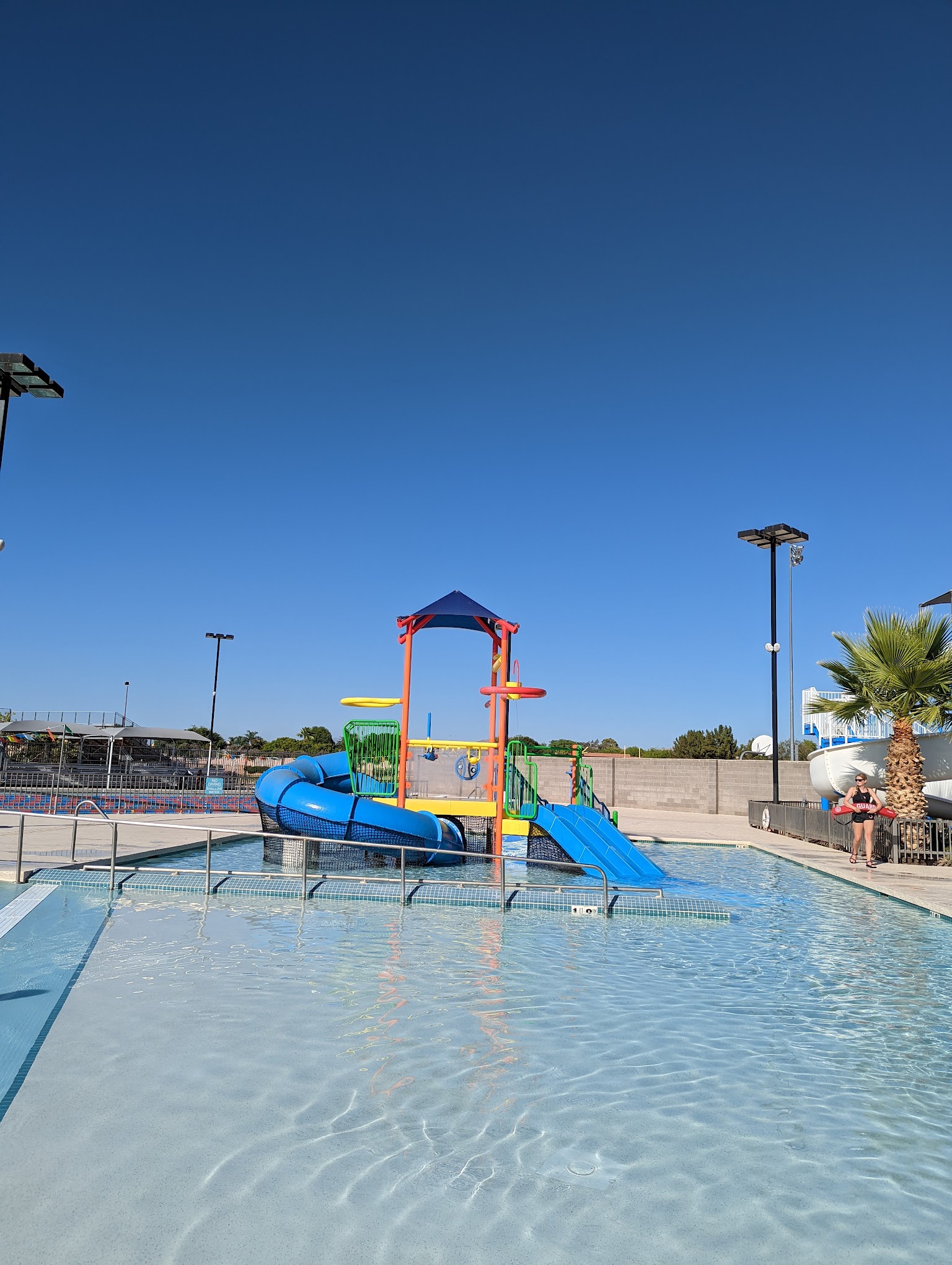 If you have lil ones who love the water and you live in Mesa and you also don't want to pay the high prices of water parks, which are great, but for those who can't afford them very often, or just don't want to pay that price, then this pool is one of the best in Mesa. For older kids, teens, and lil ones, it has it all. Great lil kids area, it's basically a playground area in the water, which isn't deep it has a side by side slide, for very lil ones, a tunnel circular water slide, also for the lil ones around 3 and 4 years old but not yet 46 inches tall. which you have to be to go on, the bigger water slide, or you need to be able to swim( if you think your 4 or 5 year old can handle the big water slide and they can swim fairly well, just ask the lifeguards on duty) I did at another pool, and they let my 4 yrs old go down then, even had the lifeguard at the end of the side in the water ready for her just in case, it's also for the older kids, teens, and us adults. Not to mention the 3 diving boards separated, and the larger swimming area, with the lap lanes. All the shade you could want, vending area with tables and shade, grass area with huge umbrellas for shade. The staff and lifeguards are very professional and friendly. I just had a small scrape on my foot, which was bleeding, they tended to it very professionally, nicely, and they gave me an extra band aid to boot. Love water, love to have fun with your kids and cool off, and not break your bank account to do it, then this is the place. Just saying. Give it a try, hope you enjoy it if you do. I'll add photos soon. And here are the two photos, so far, more to come when we visit again, the dark haired lil one that's my daughter/granddaughter, she's with her cousin. They had a blast.