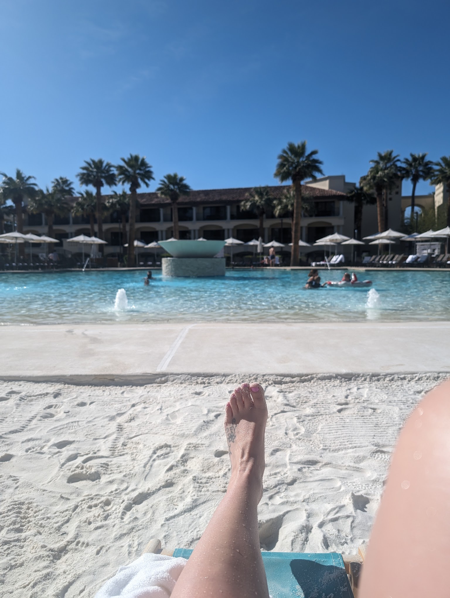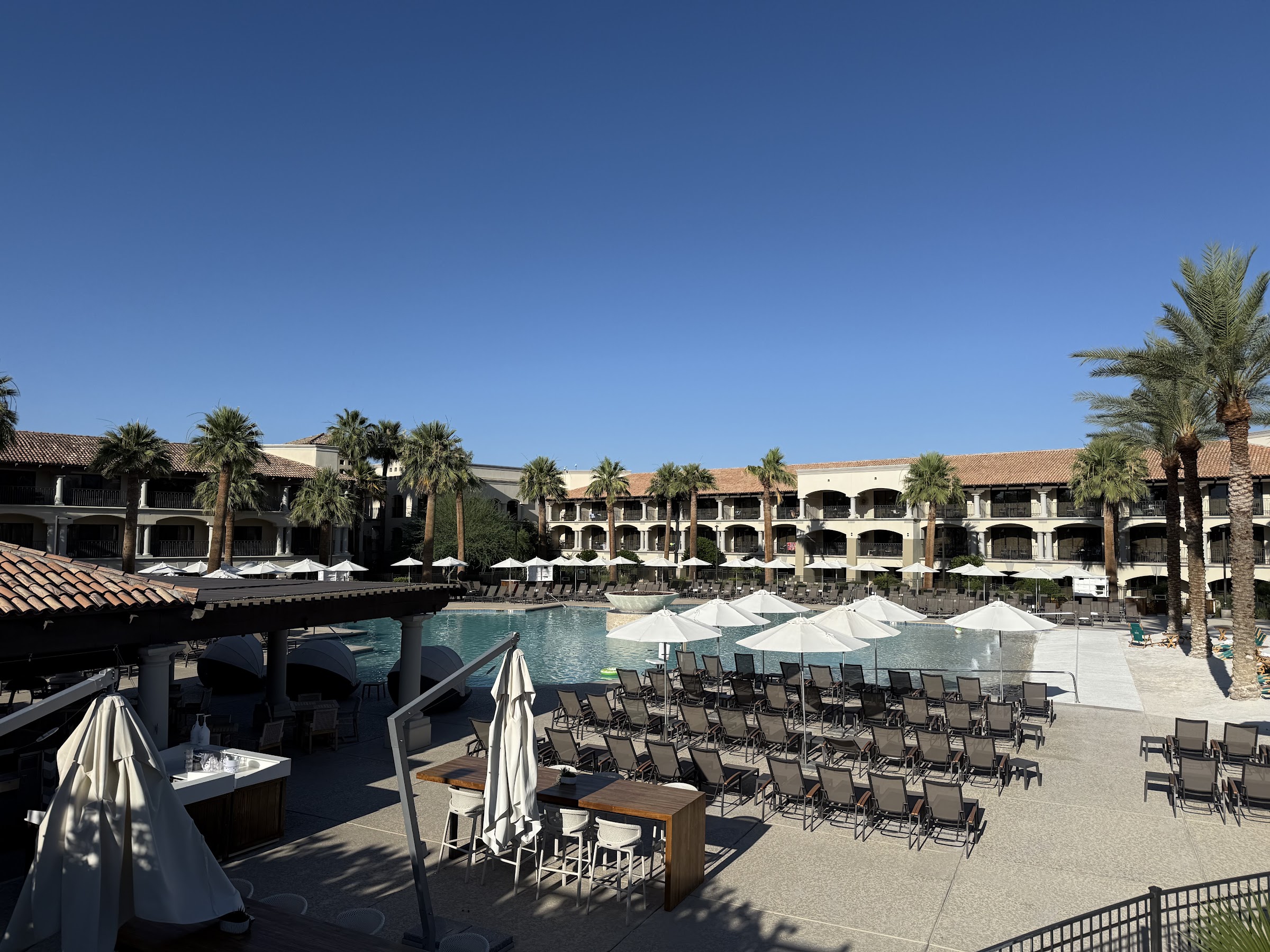 Get there early if you want a good spot. This pool is nice but it is zero entry which attracts the toddlers and little kids... Wasn't as quiet or relaxing as I was hoping for. But the great thing about this property is that there are 5 other pools to choose from with a few of them adults-only. This one was still great (though "boring" for my 11-year-old). The cabanas in the back start at $400 per day but can be more depending on the day of the week and availability.