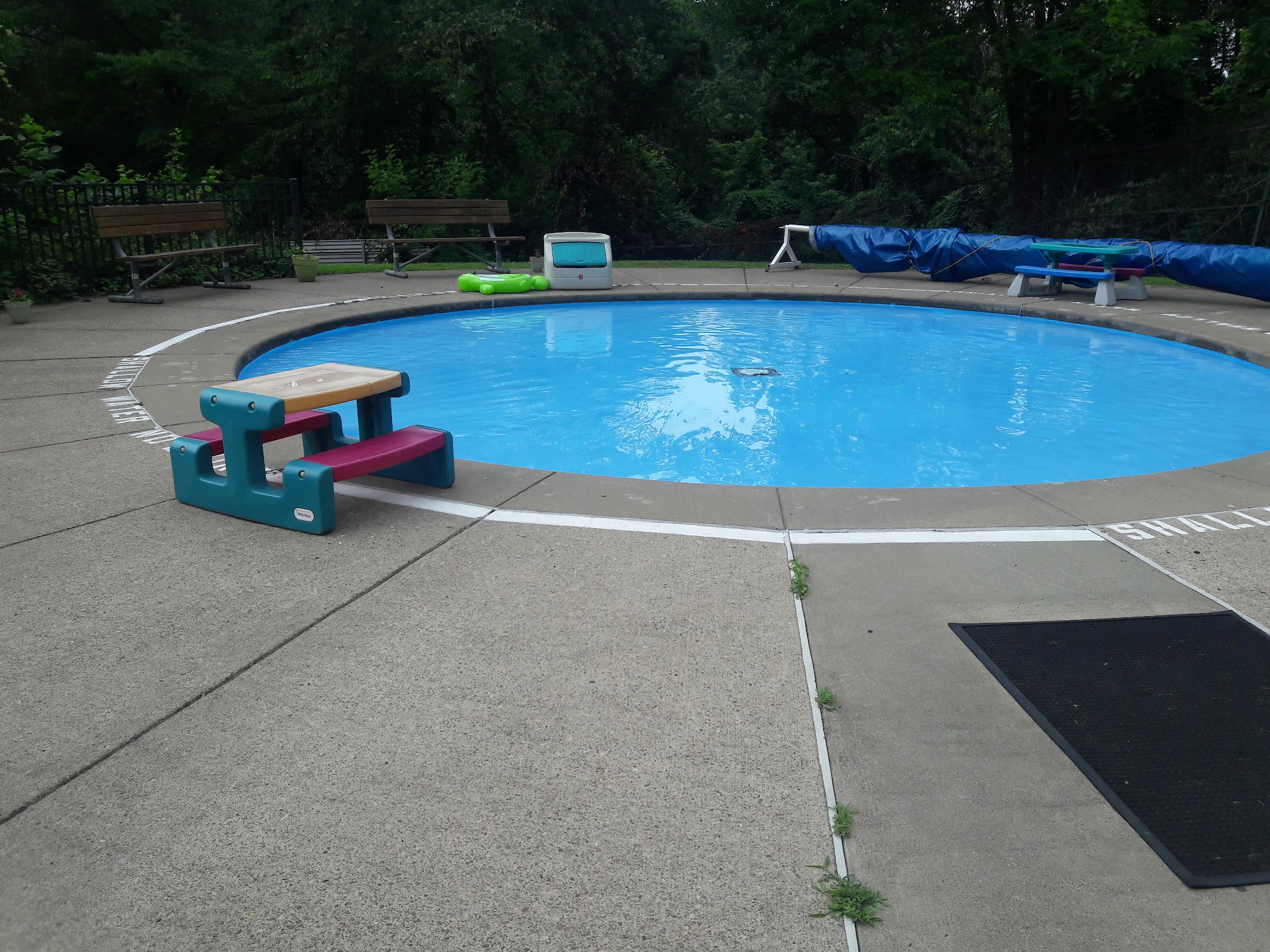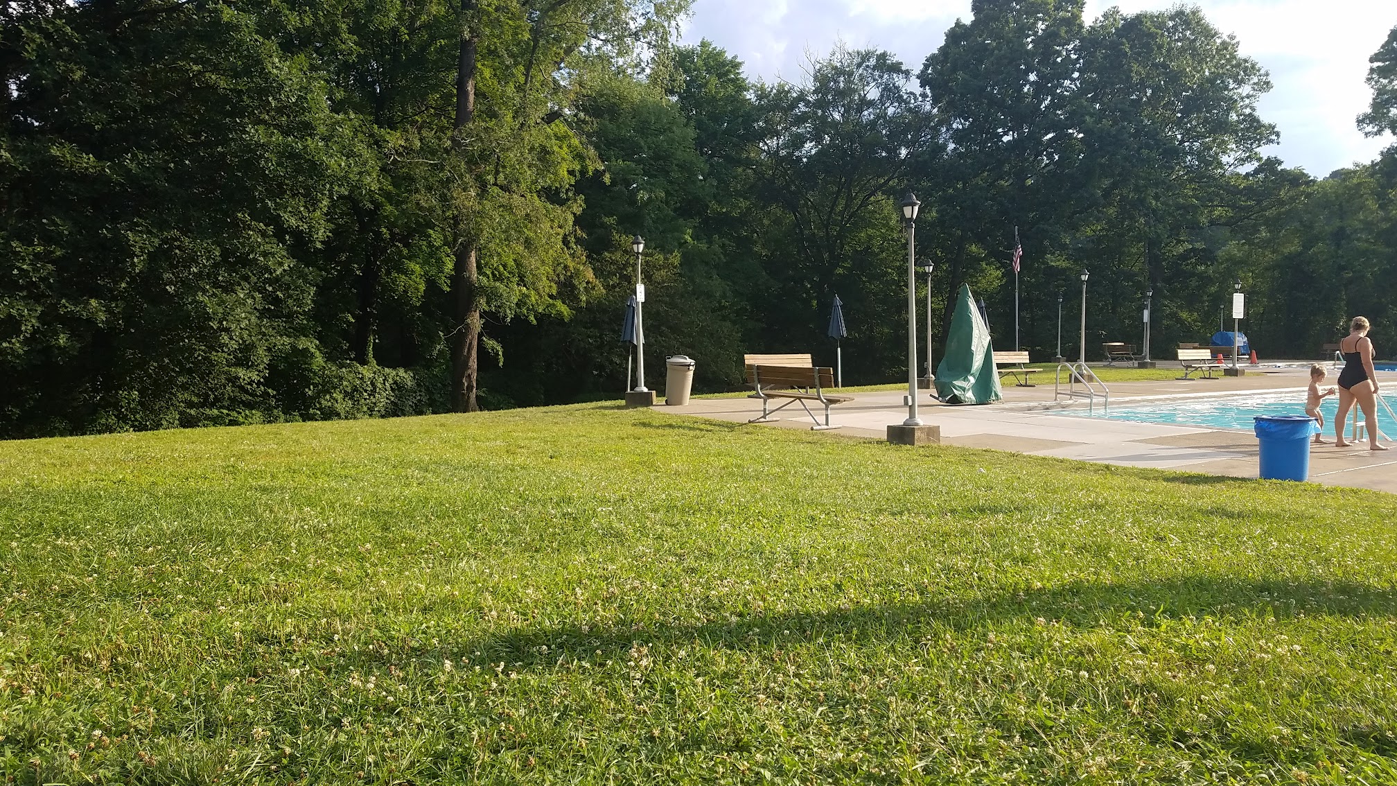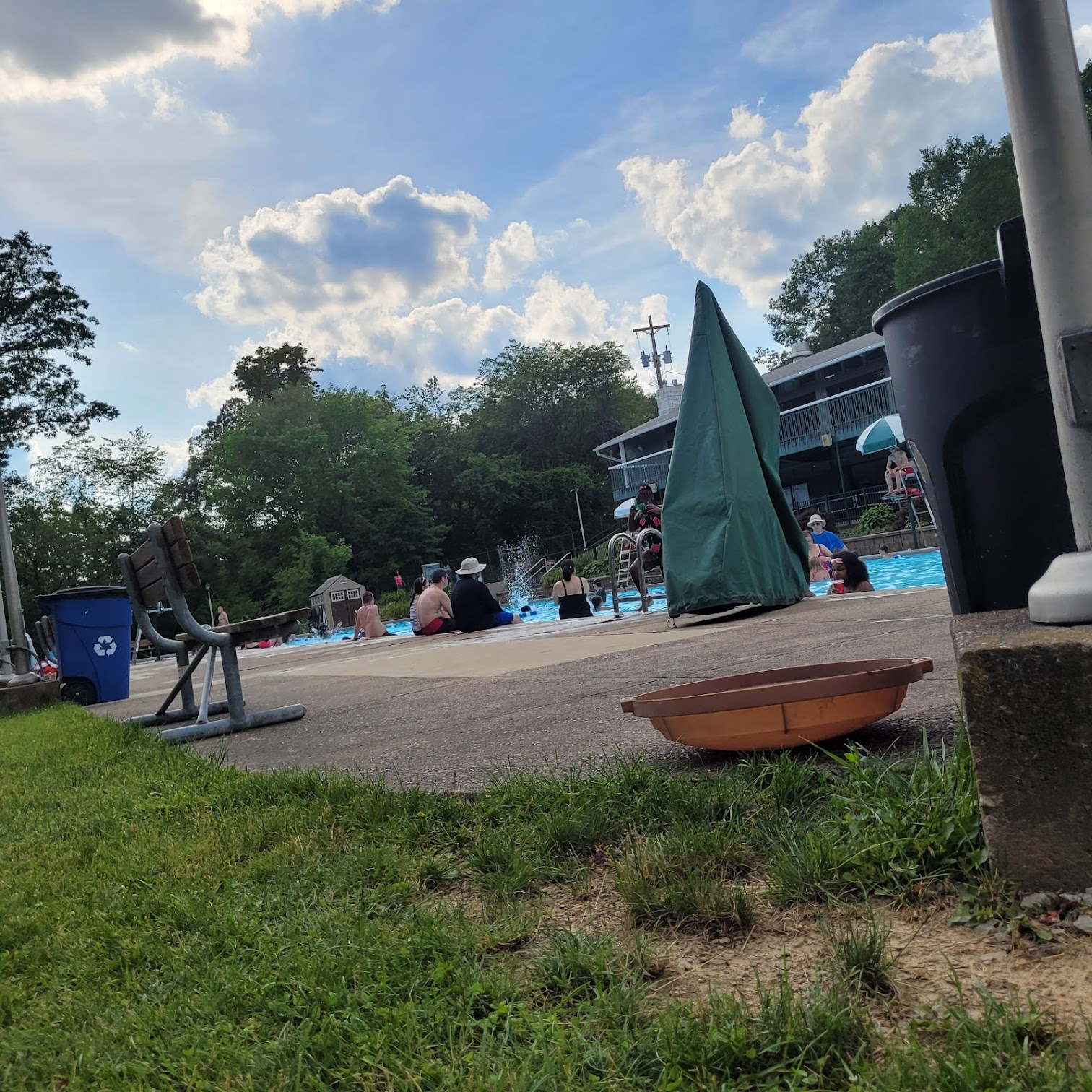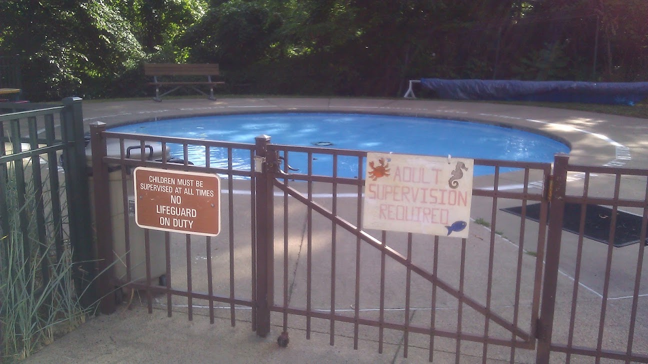 A beautiful heated pool. No rafts etc permitted. There is a Kids’ section (apparently kids aren’t permitted to use life preservers even with parents right there, as it gives a false sense of security). There are lanes for swimming laps and a tiny diving area. Rates are kind of high. There is nice diversity in the crowd and lots of families but also individuals. Lifeguards frequently blow the whistle at kids. Huge grassy hill with plastic adjustable chaise longues and big umbrellas, concessions stand has good selections. Some kind of chess club some days. Friendly staff.