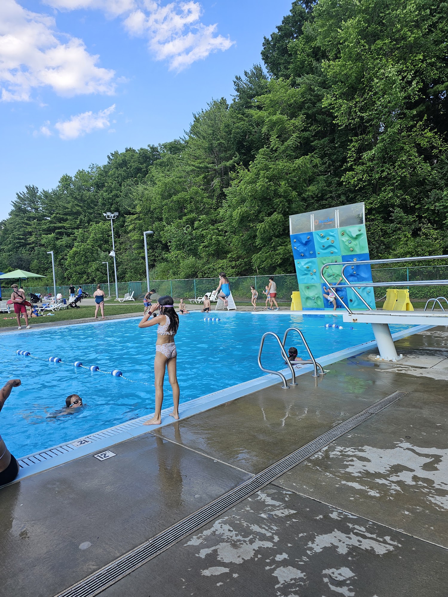 I thought this was a fantastic public pool. You can dive in specific sections of the pool, and there is a diving board too. Dedicated swim lanes, rock wall next to the pool to climb and plunge, two water slides, and an area for smaller kids. Decent changing rooms. Solid concession stand (pricey). No spray sunscreen allowed. If they can't see the bottom of the deep end, they close the pool - but provide a raincheck. Excellent staff, friendly and helpful. $10 for adults and $9 for kids at the time of writing, Jun '24.