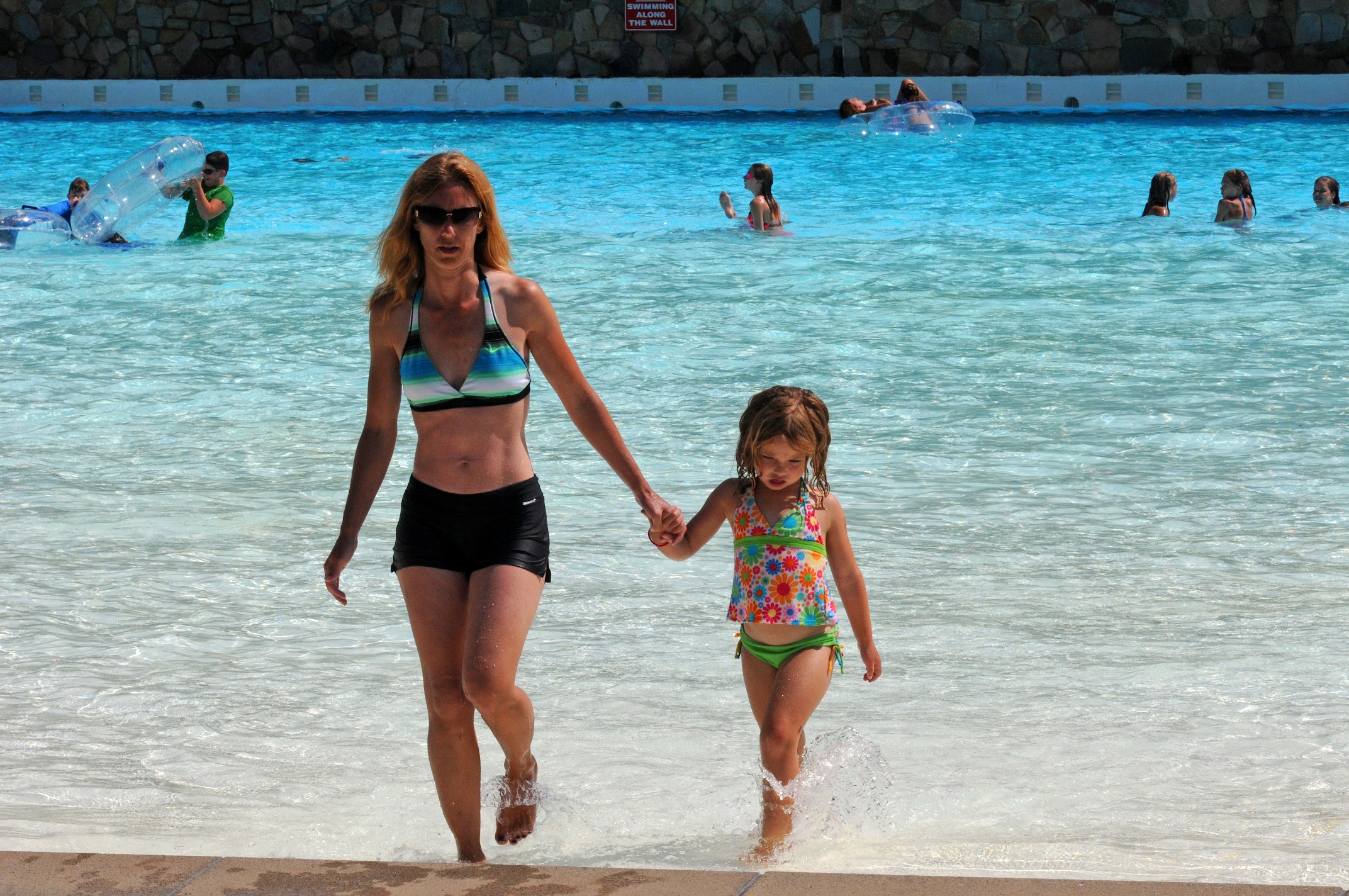 Popular pool, a water park for families, featuring waves and raft rentals.