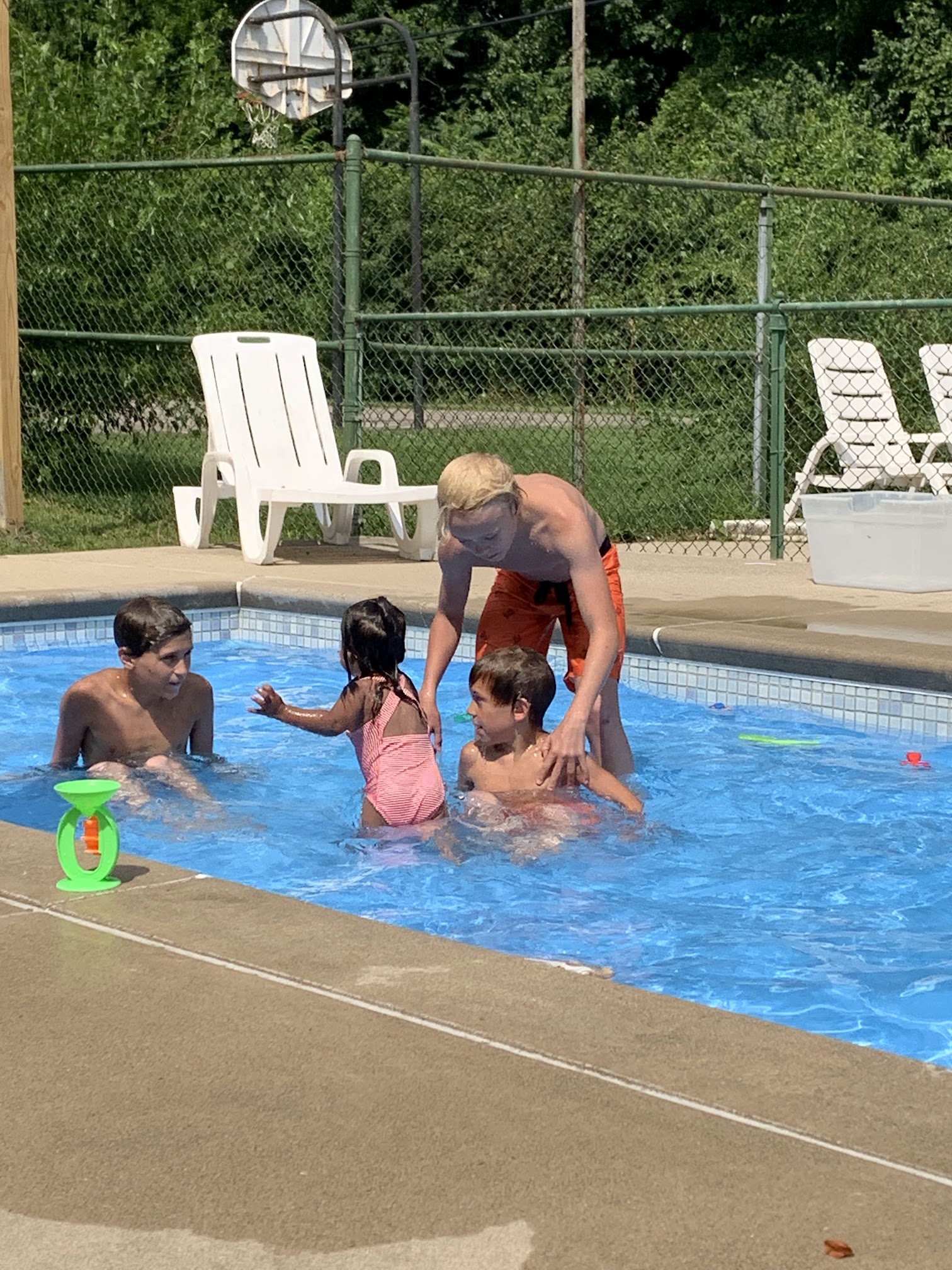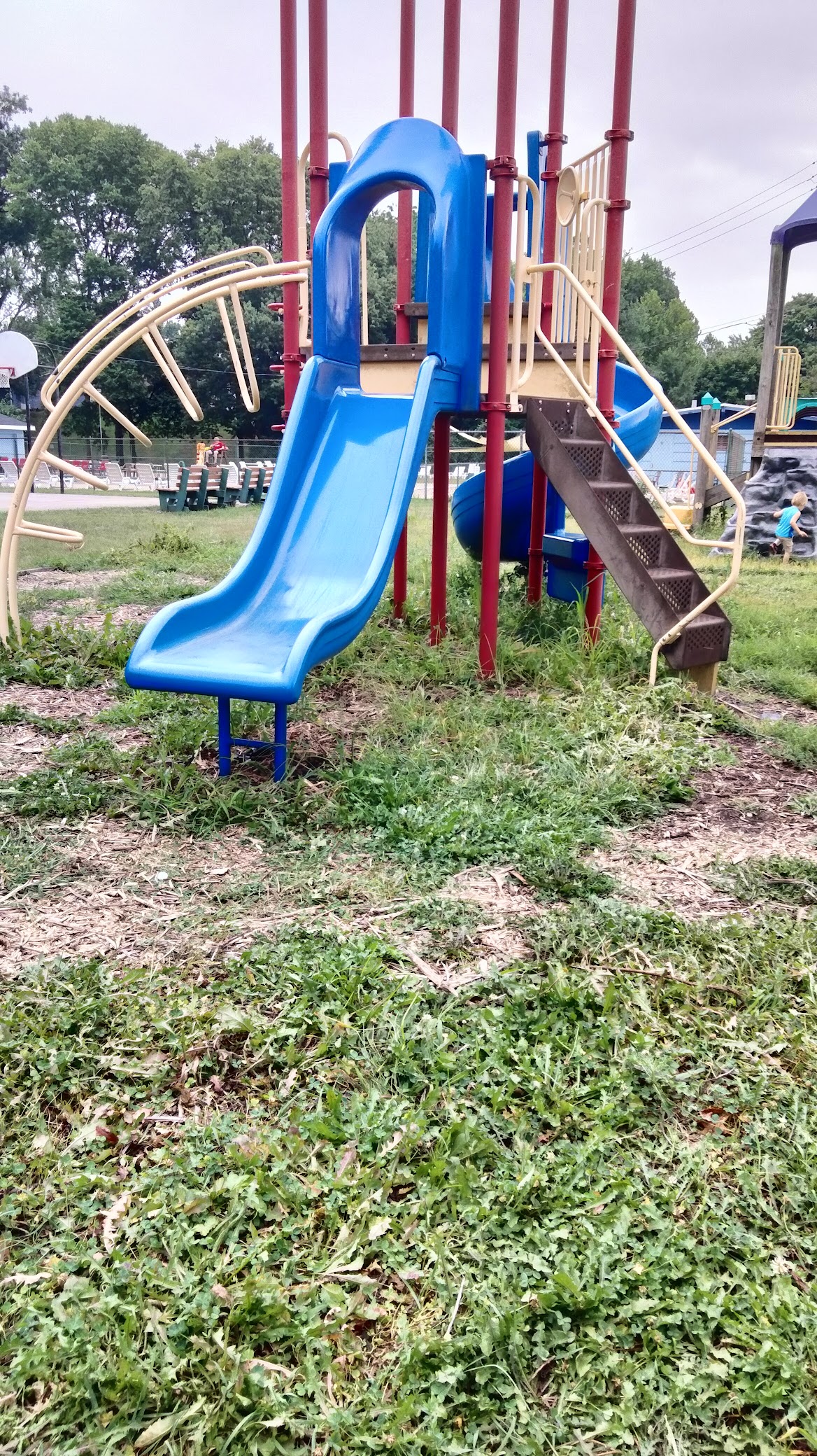 Love this park. Just needs some TLC. Weeds are grown all around the park. Basketball hoop is a plus. Nice pool too. Nice grassy area for play as well.