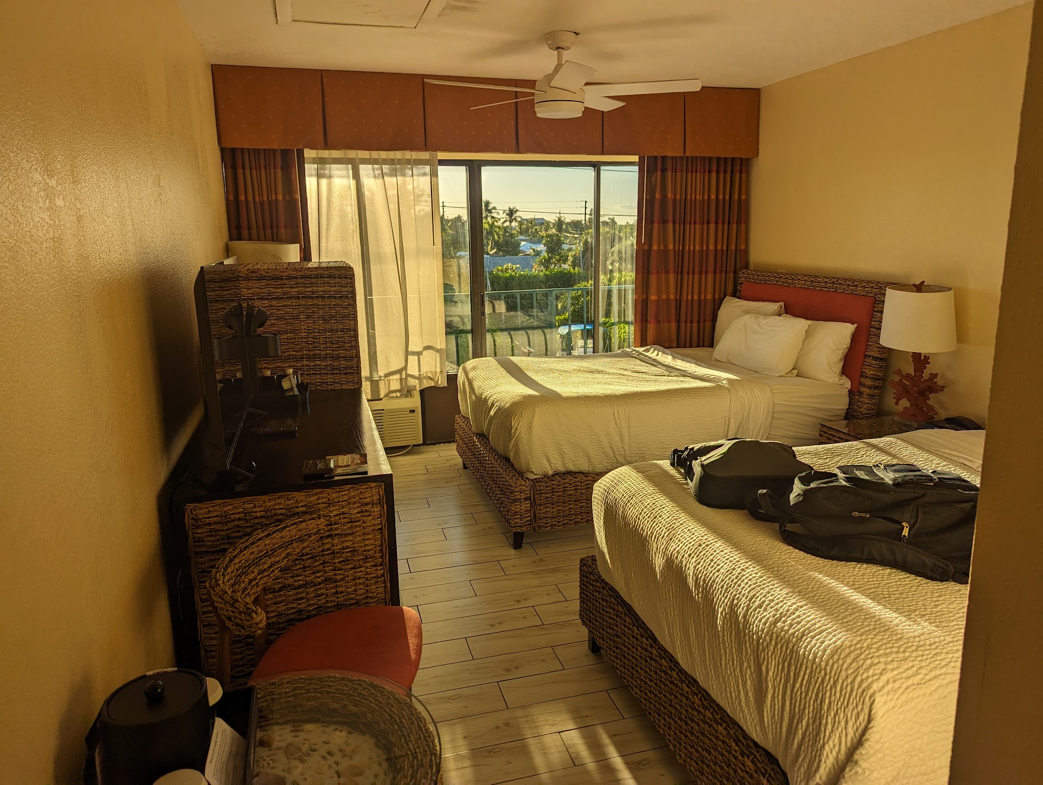 The hotel was to be expected, what one may call “beach clean”. Cozy, spacious, comfy beds, nice pool, close beach access, tv in our suite with WiFi & convenient kitchenette. Front desk staff was incredibly friendly and helpful. The only downside was some days our room was not cleaned and I did have to find a broom and sweep the place everyday myself, but we did get fresh towels everyday.