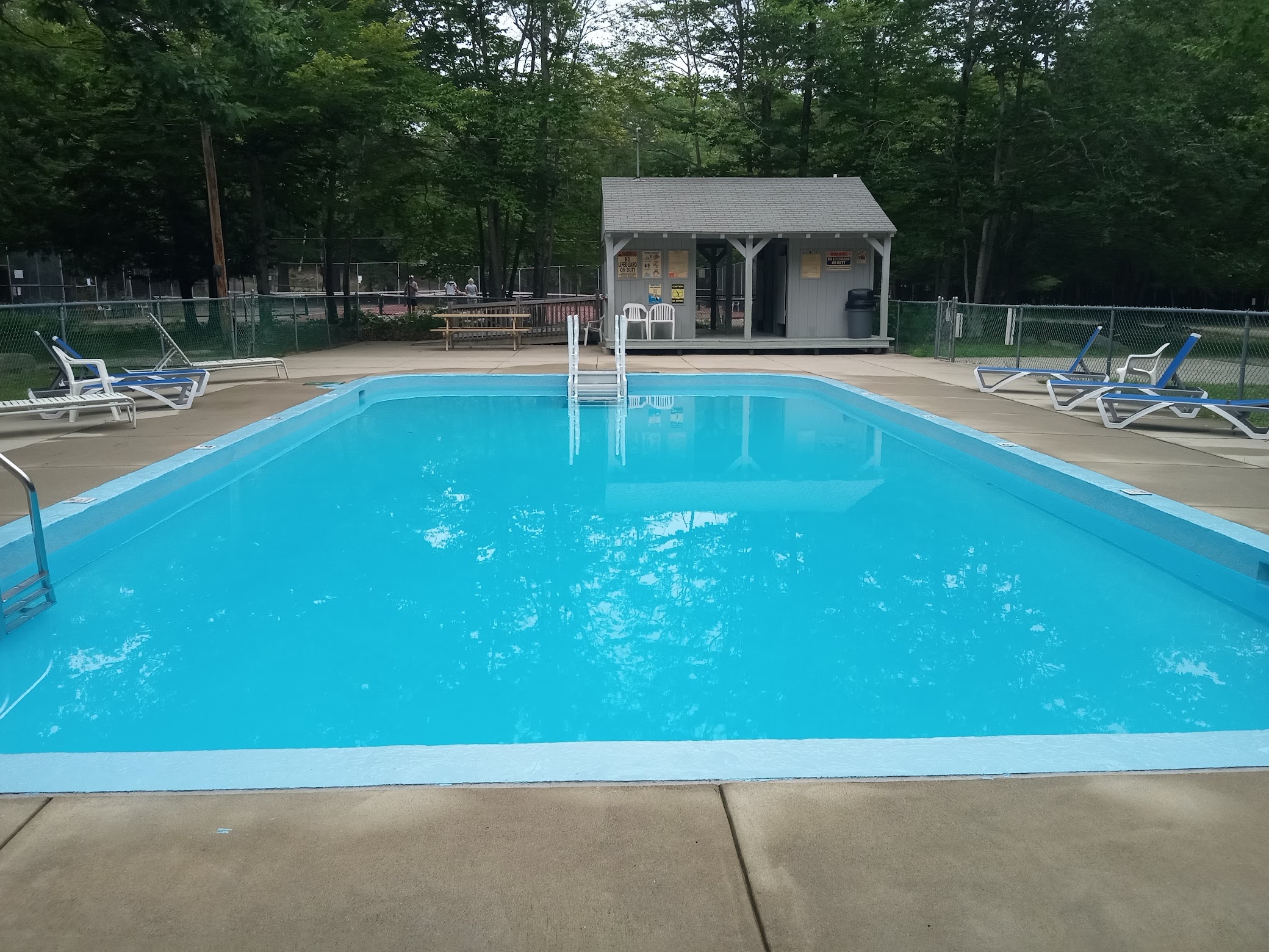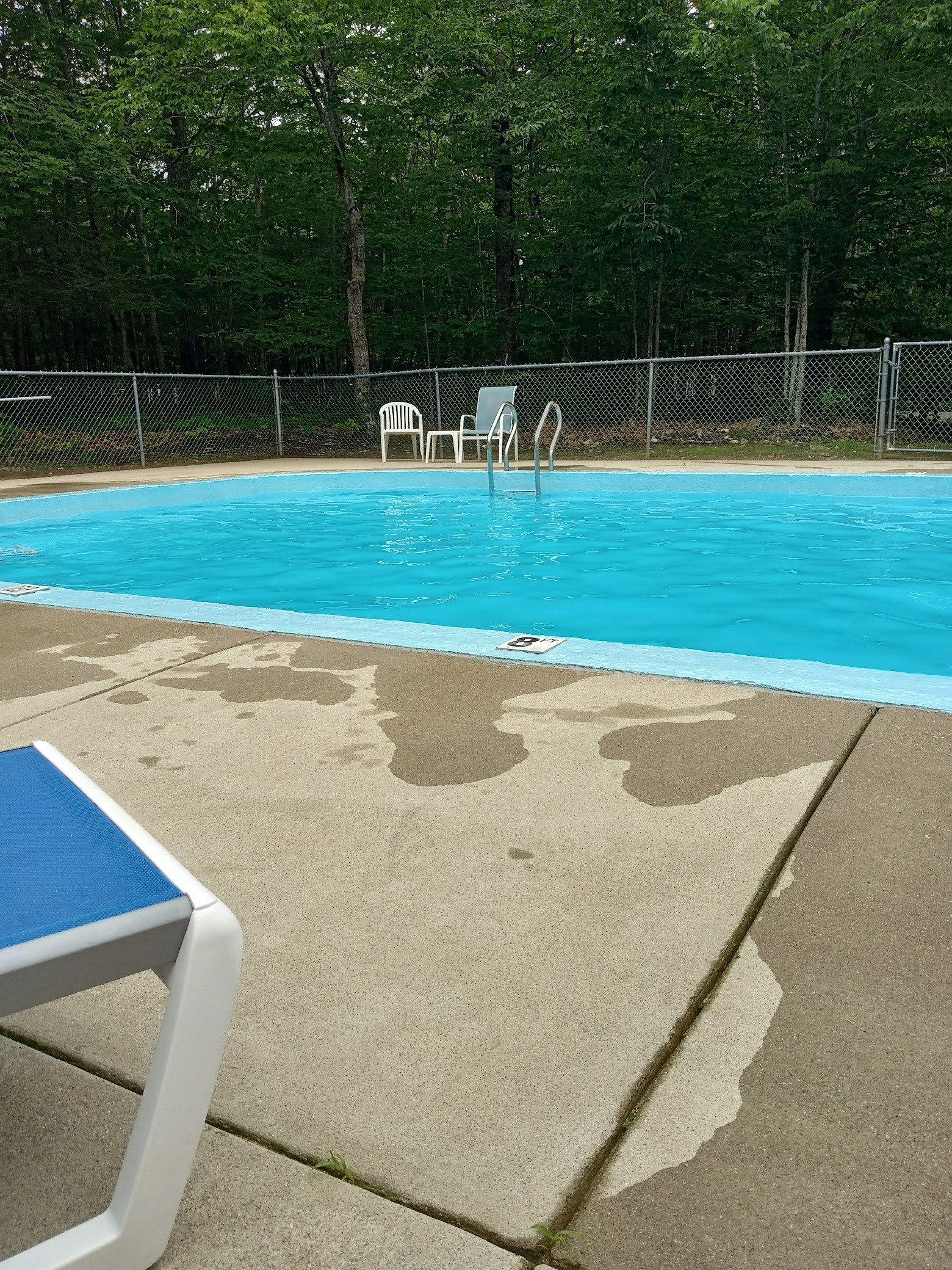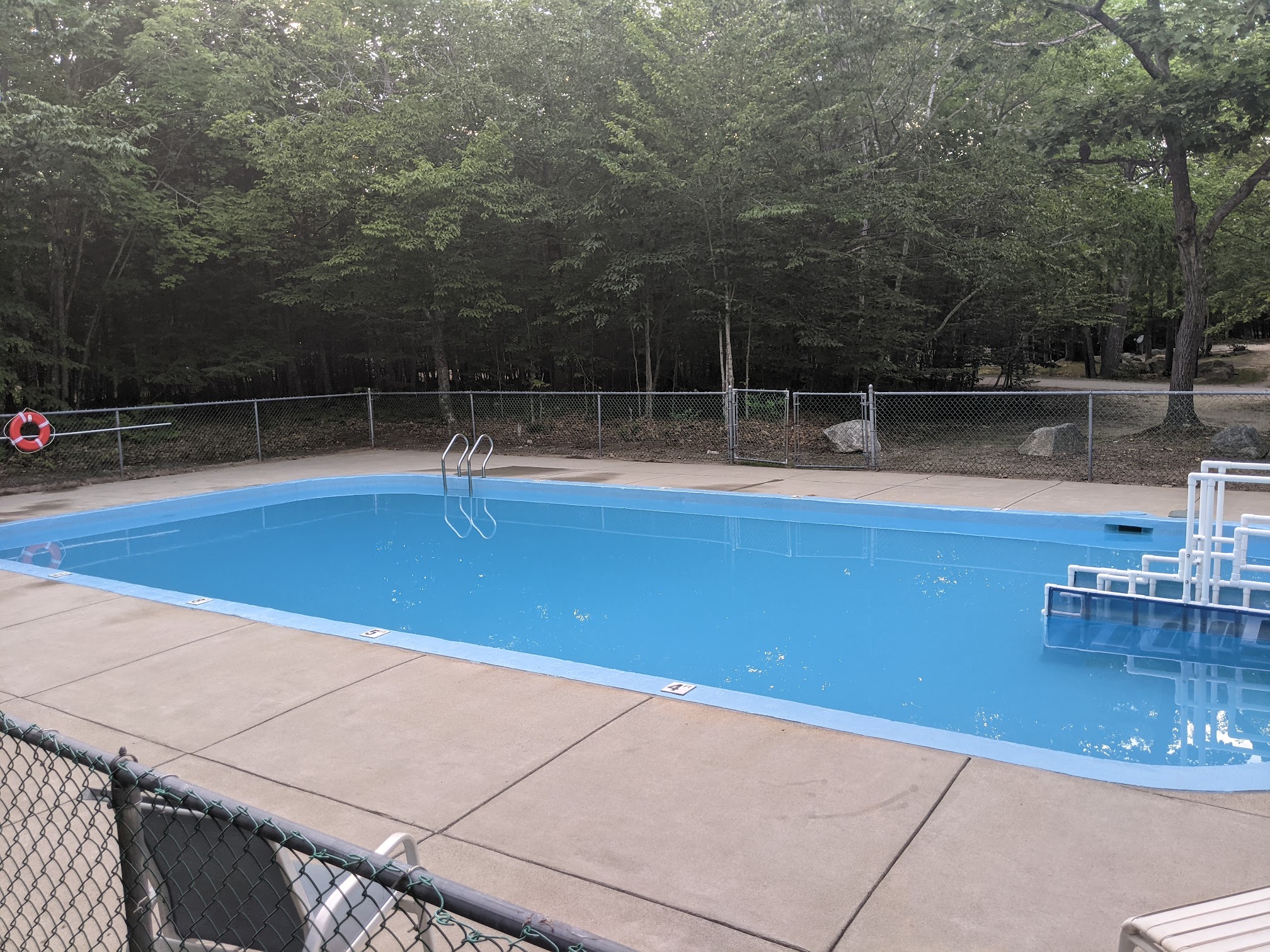 The pool at Frye Island is a heated outdoor facility. While a specific temperature is not publicly provided, it is maintained at a comfortable swimming temperature during its operational season.