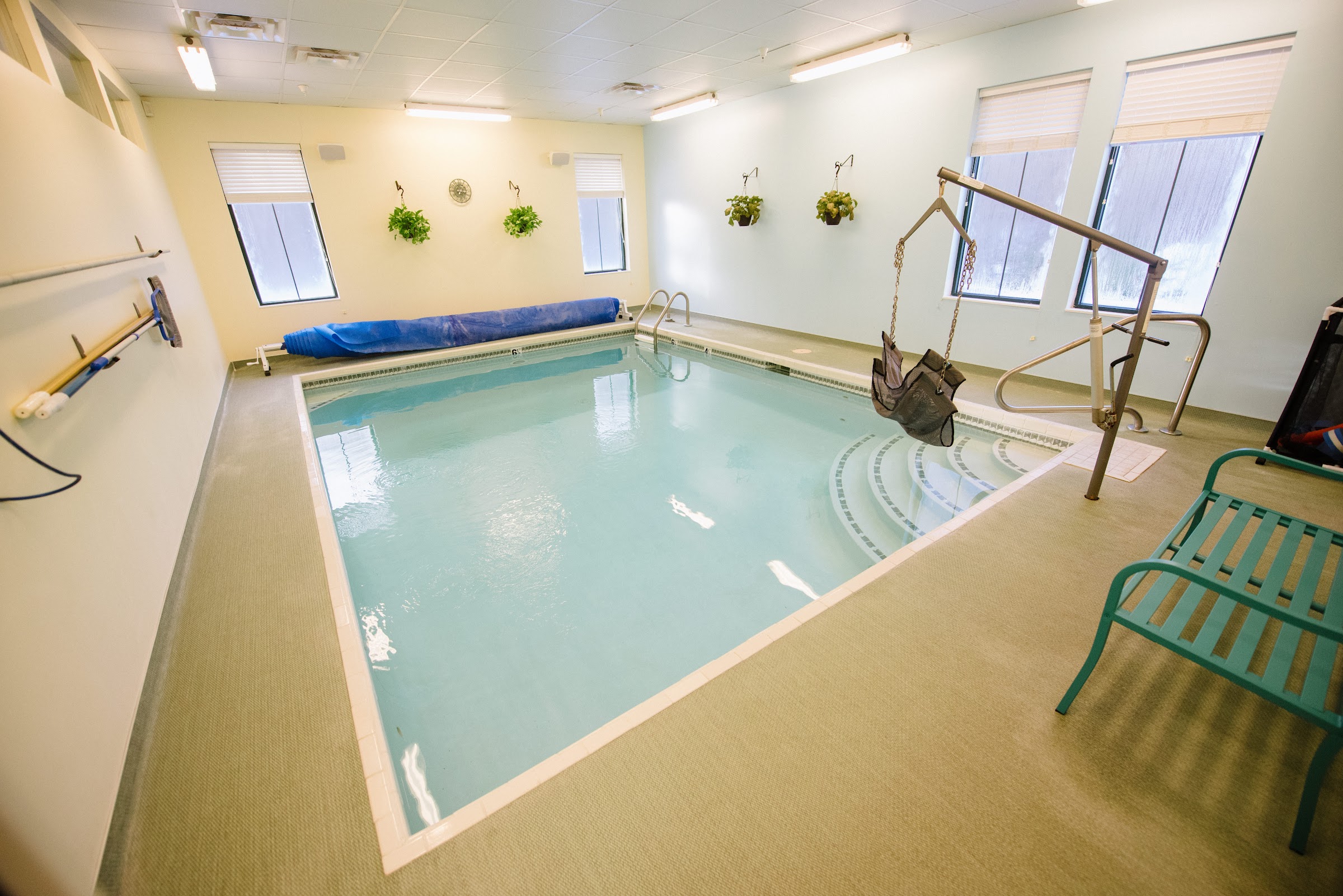 The center features a custom-built indoor aquatic therapy pool designed specifically for rehabilitation. This pool is maintained at a therapeutic temperature of 92 degrees Fahrenheit and includes an underwater treadmill, multi-depth levels, and parallel bars.