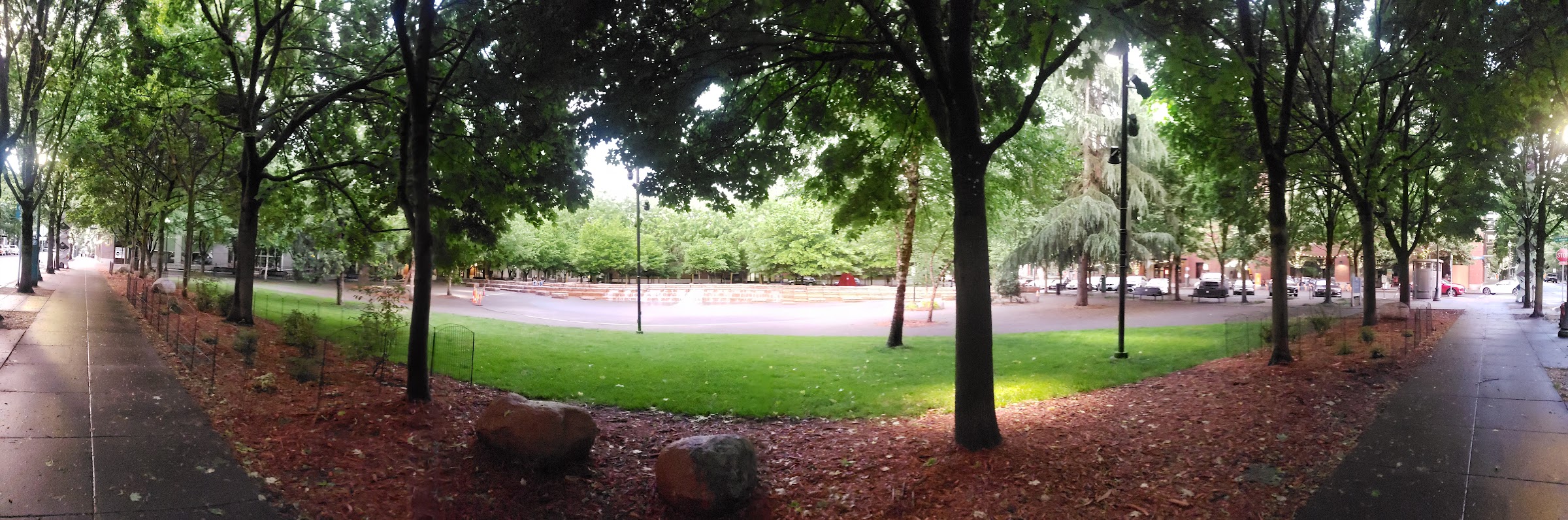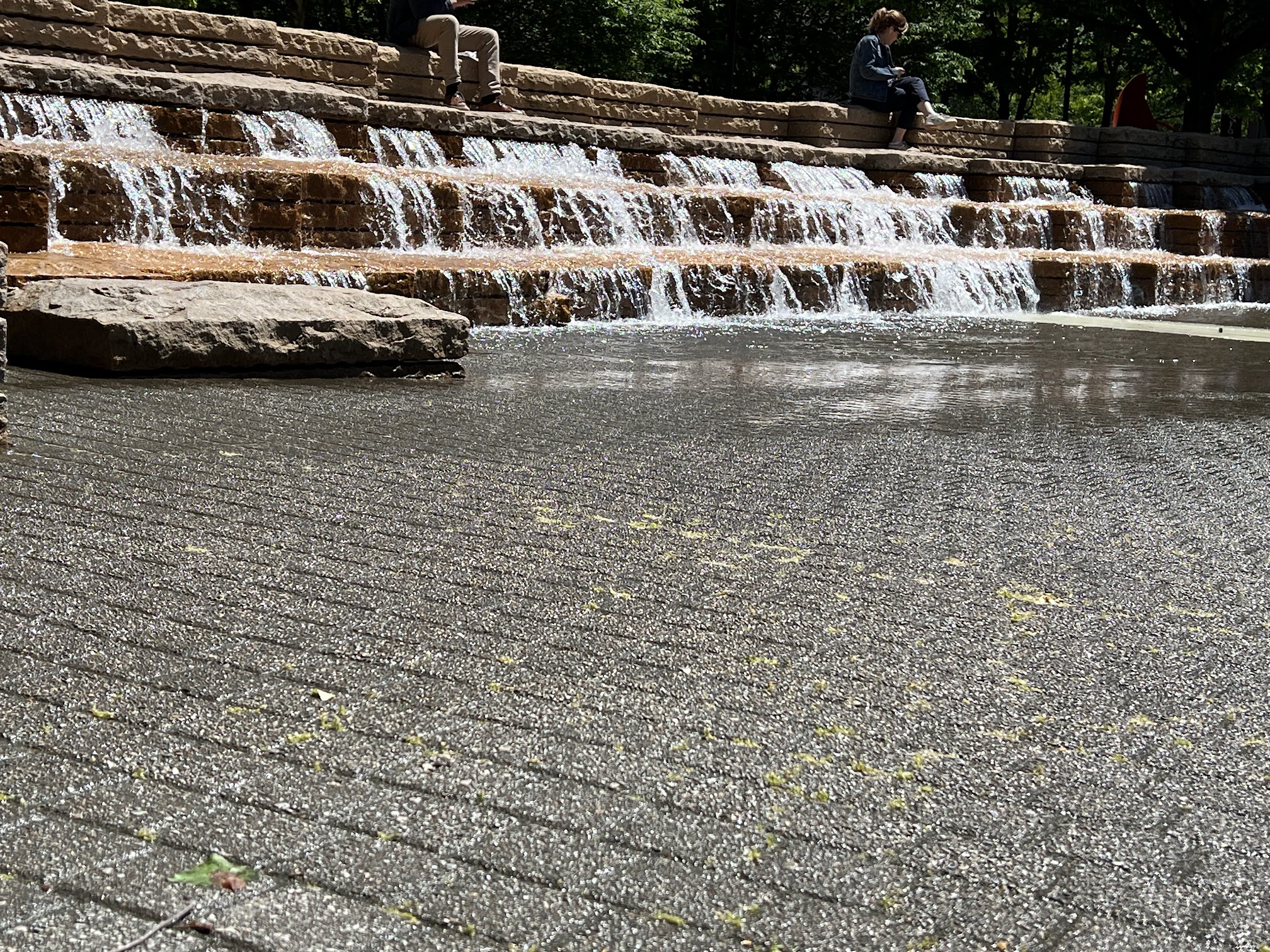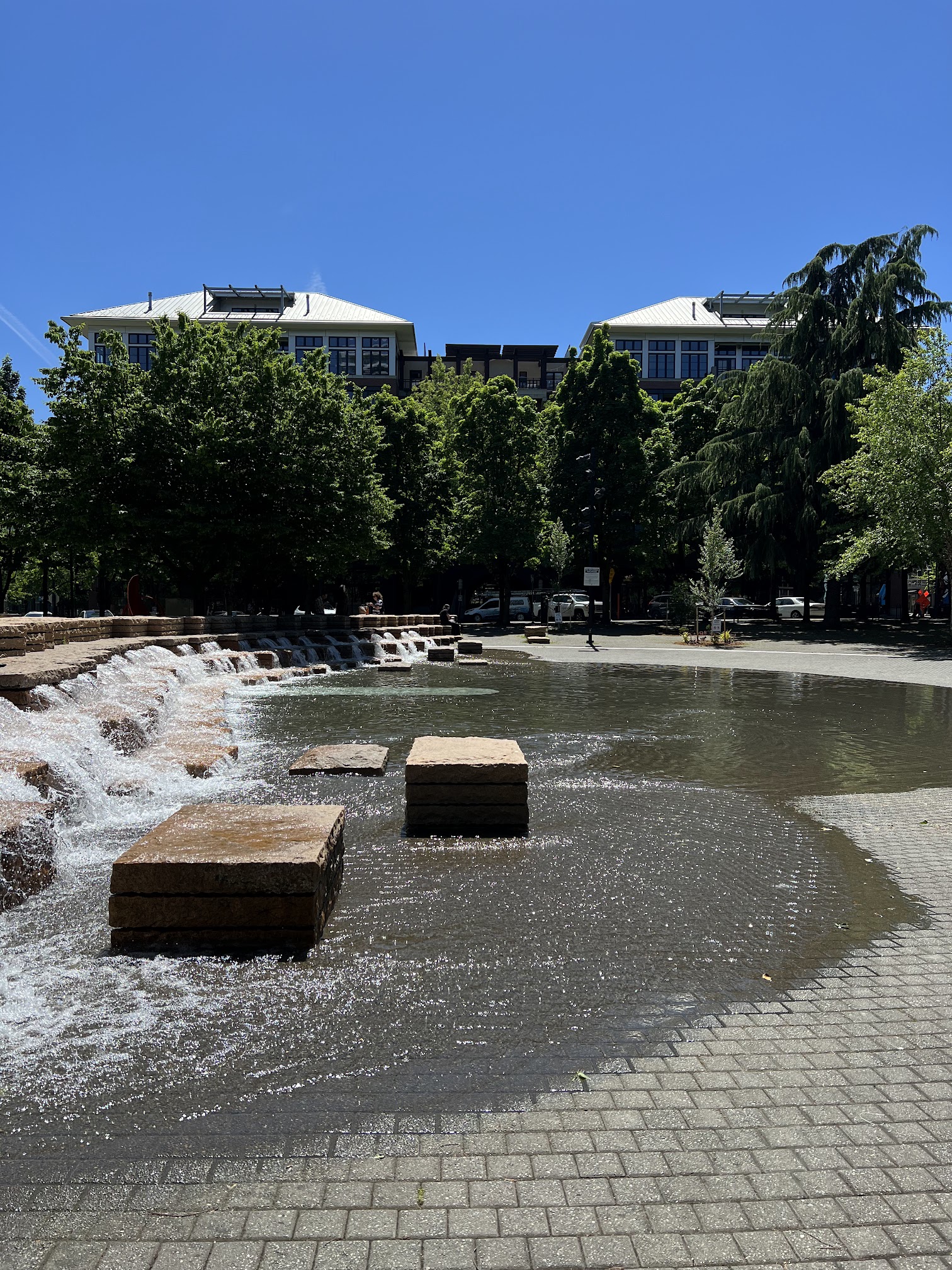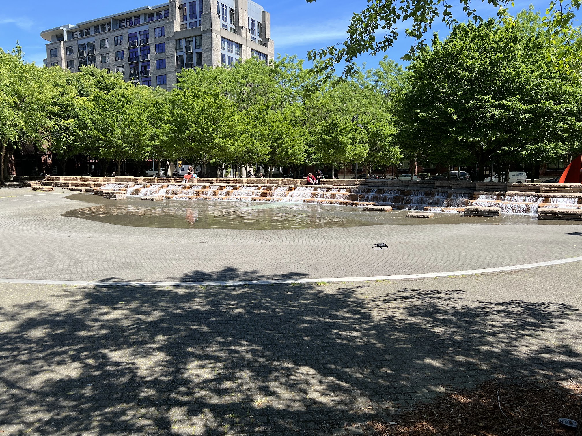 Jamison Square Interactive Fountain, located in Portland's Pearl District, is a popular urban park featuring a unique interactive 'tidal pool' water feature. This zero-depth entry design cycles between filling and draining, creating a shallow play area particularly favored by children during warm weather, serving as a community gathering spot.
