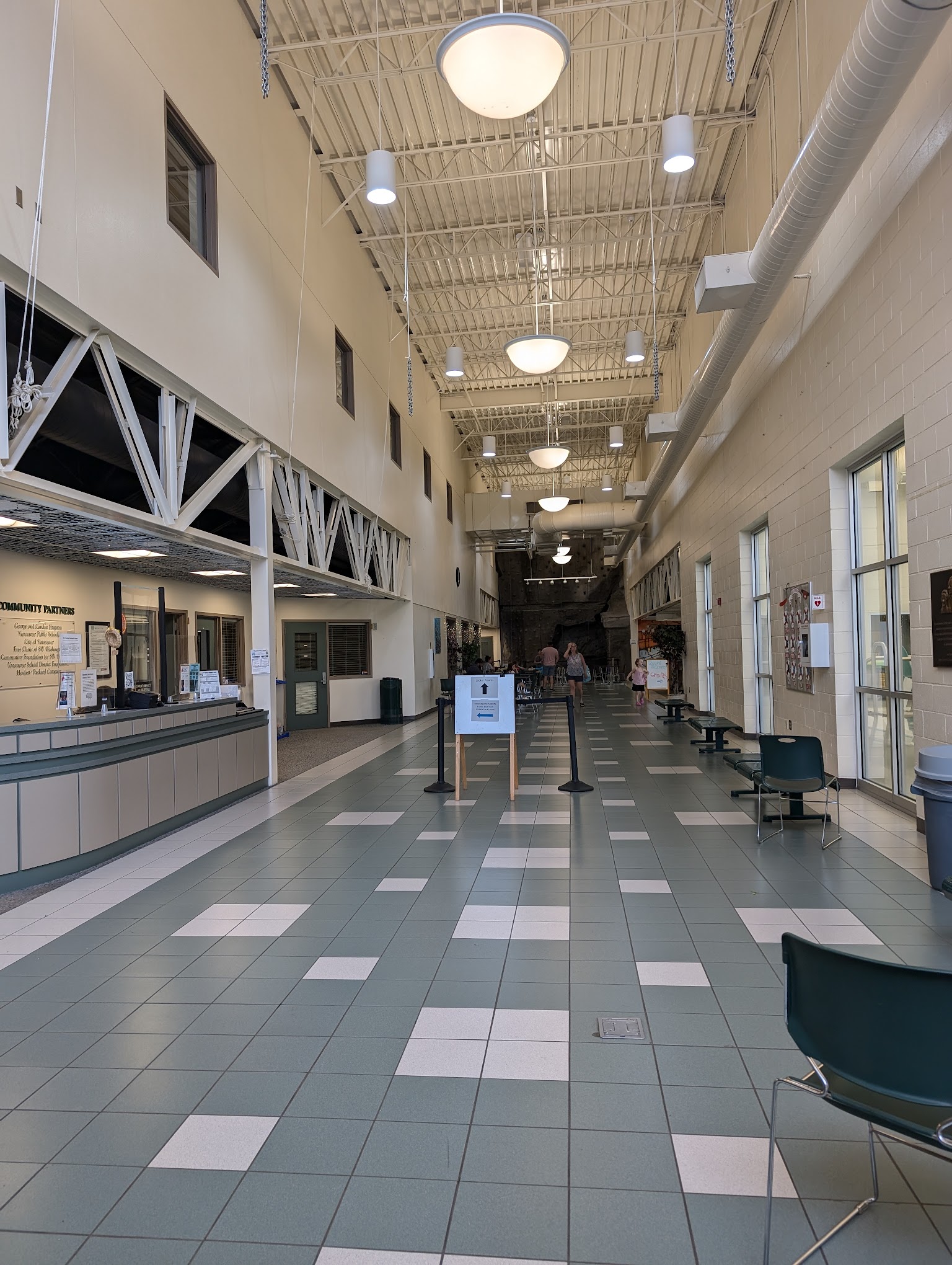 Community center providing an indoor swimming pool with a waterslide, plus a rock-climbing gym.