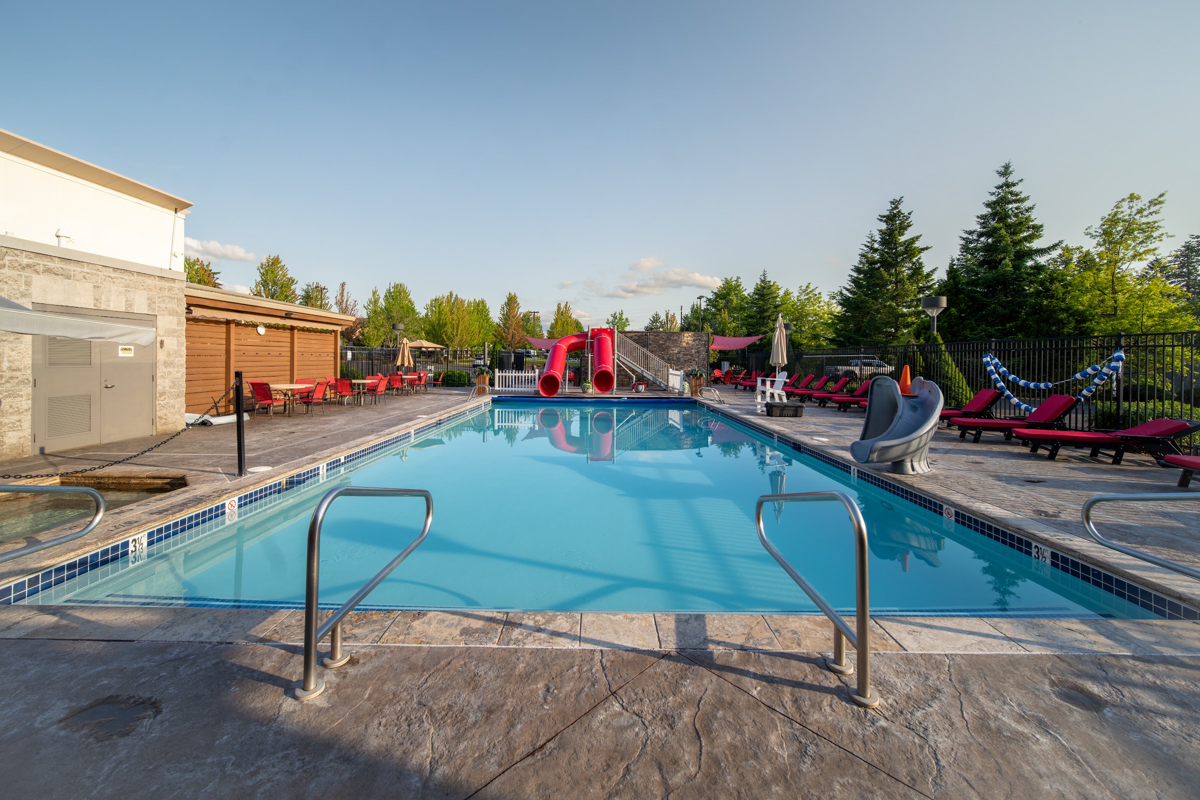 Great place for the whole family. Outside pool during the summer with three slides, one designed for younger children, inside pool, 2hot-tubs inside and outside, steam-room and sauna. Fully equipped with weights and equipment, snack bar, and they even serve beer.