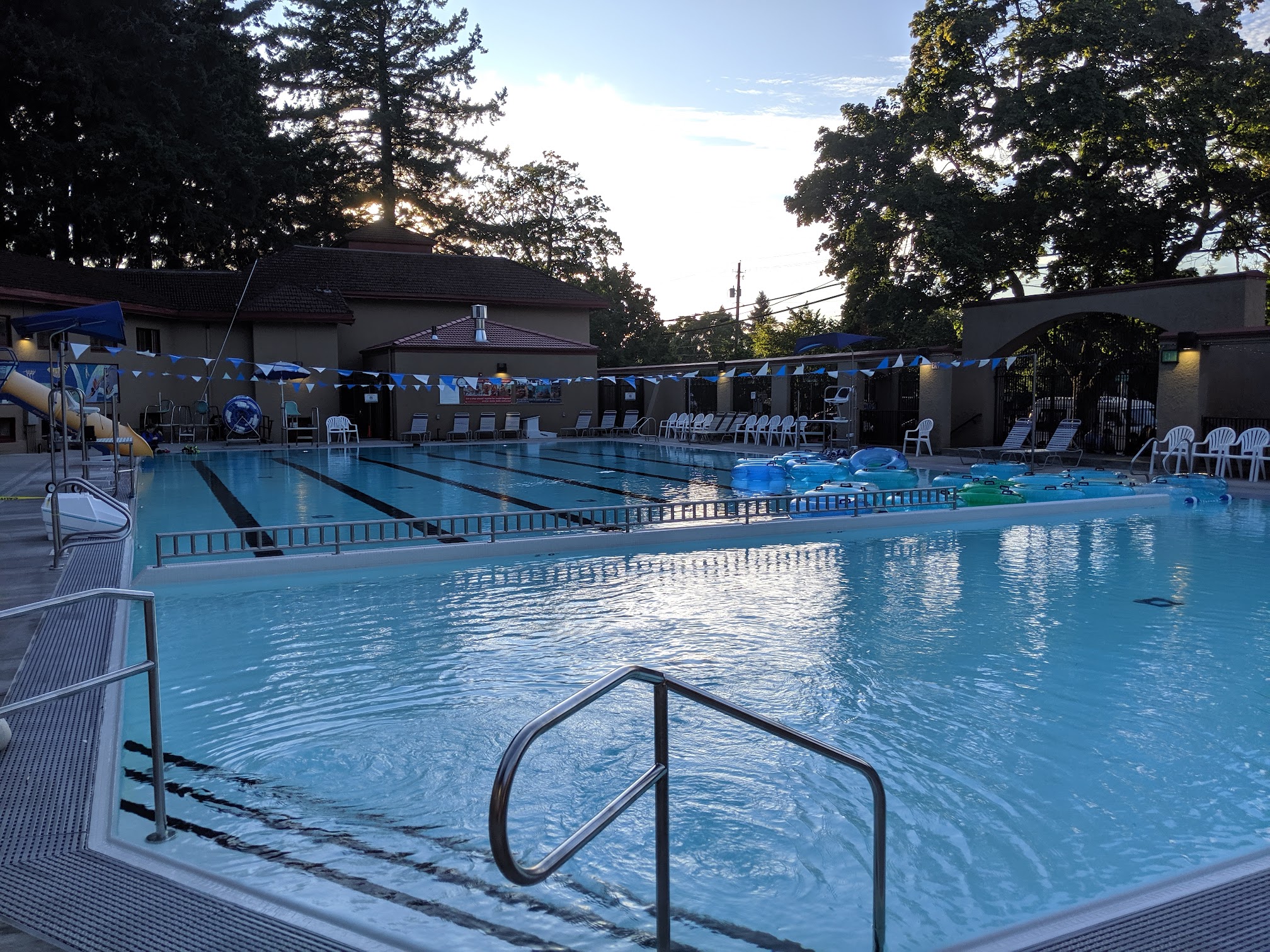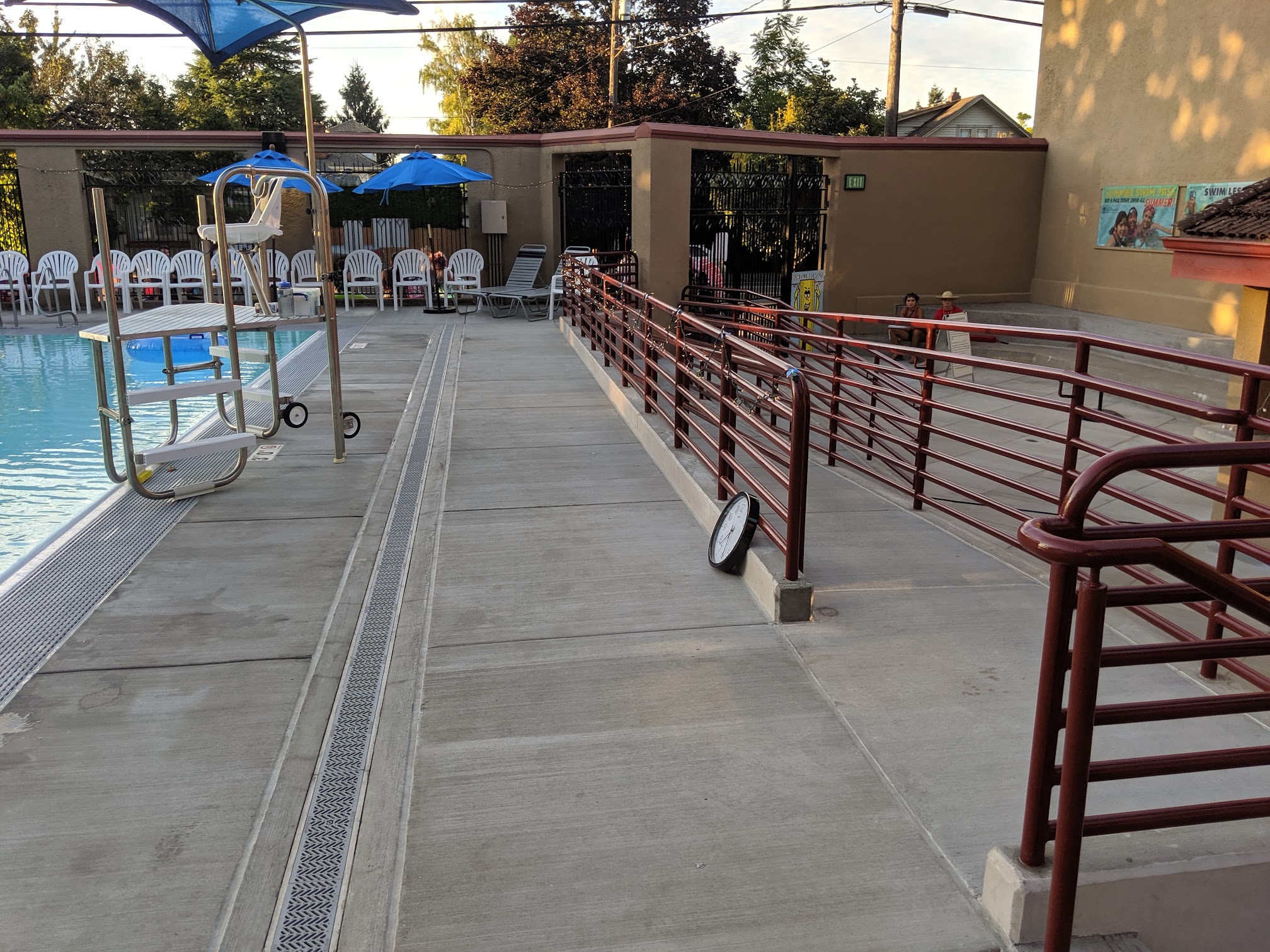 Pennisula Pool is well maintained clean. The line inside along the sidewalk is safe and orderly, with a friendly and helpful staff. Pennisula Park itself is busy, so parking was a challenge throughout the summer. I often had to let my older kids out to wait in line, as I circled the park for a reasonably close spot. The only other negative was one of two computer broke downs making the line to get inside slower. The staff did a good job making those waiting in line aware of the issue, and worked quickly to check people in. I highly suggest you bring your own folding chair. If you are a larger person, I would suggest you avoid the plastic chairs as they are uncomfortable, flimsy, and liable to break. It's the biggest negative of the pool deck experience. Another suggestion for families with younger kids is to attend the early afternoon open swim session. The earlier session attracts fewer teens and young adults than the week day later afternoon swim sessions.