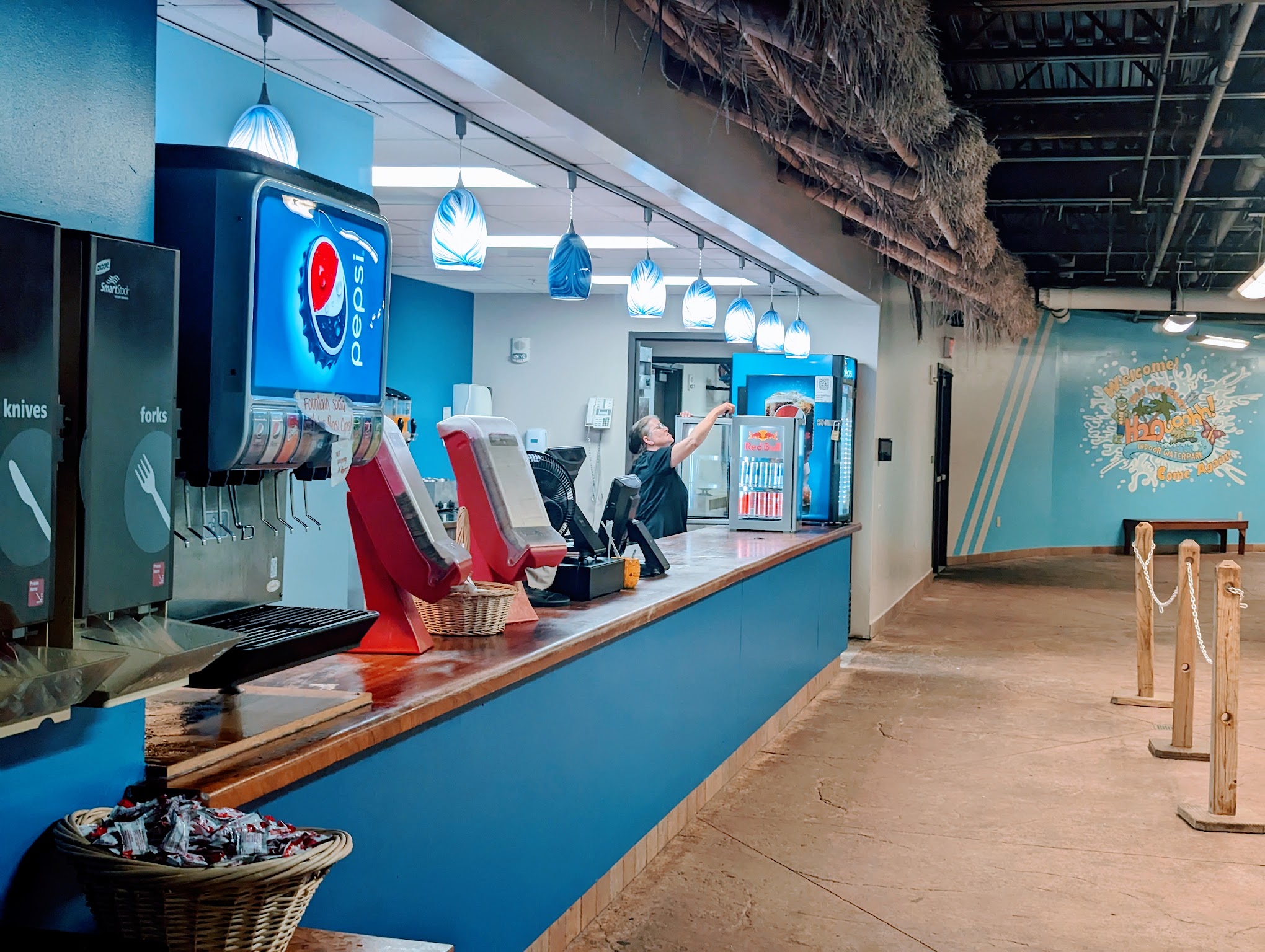 Front desk girl was wonderful. The snack bar guy was rude. We went to another area to eat and the woman working was very polite . The food is expensive. The water park area was extremely dirty. Food everywhere on the floor and a dead bug. My daughter was charging her phone in another area of the complex and saw a roach. Not a lot of things for the kids to do. I definitely thought it would be bigger. Would not go back . The place isn’t well maintained and that can lead to sickness.
