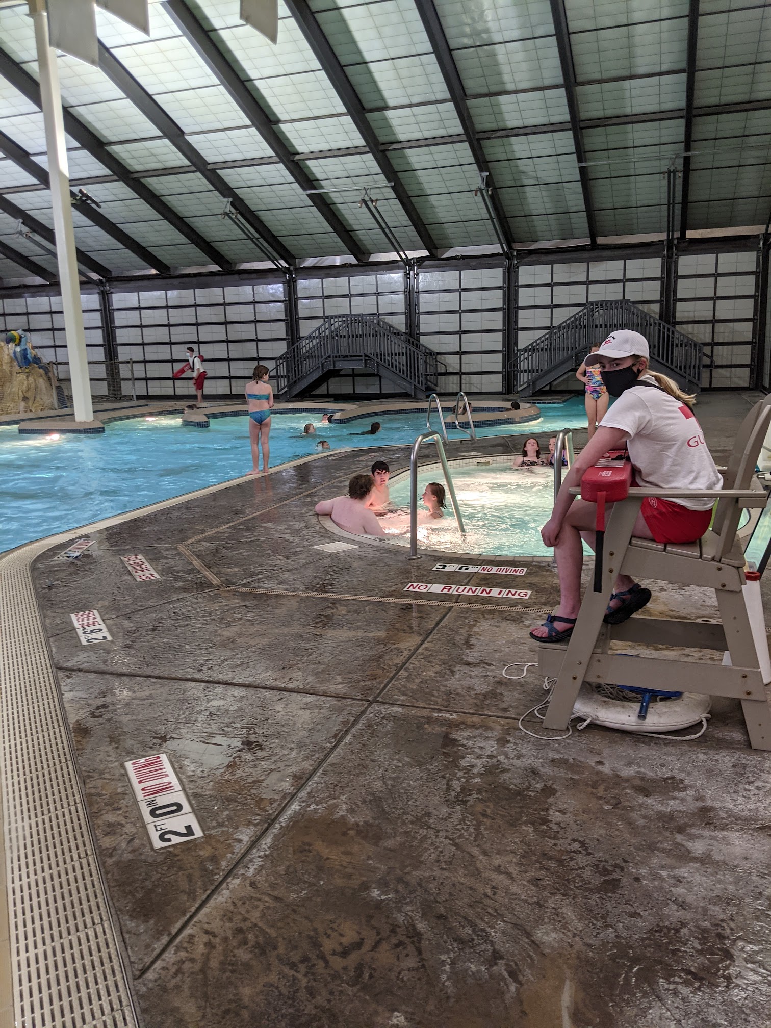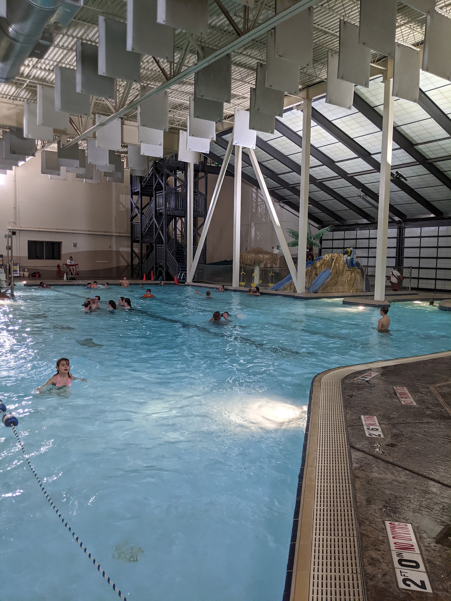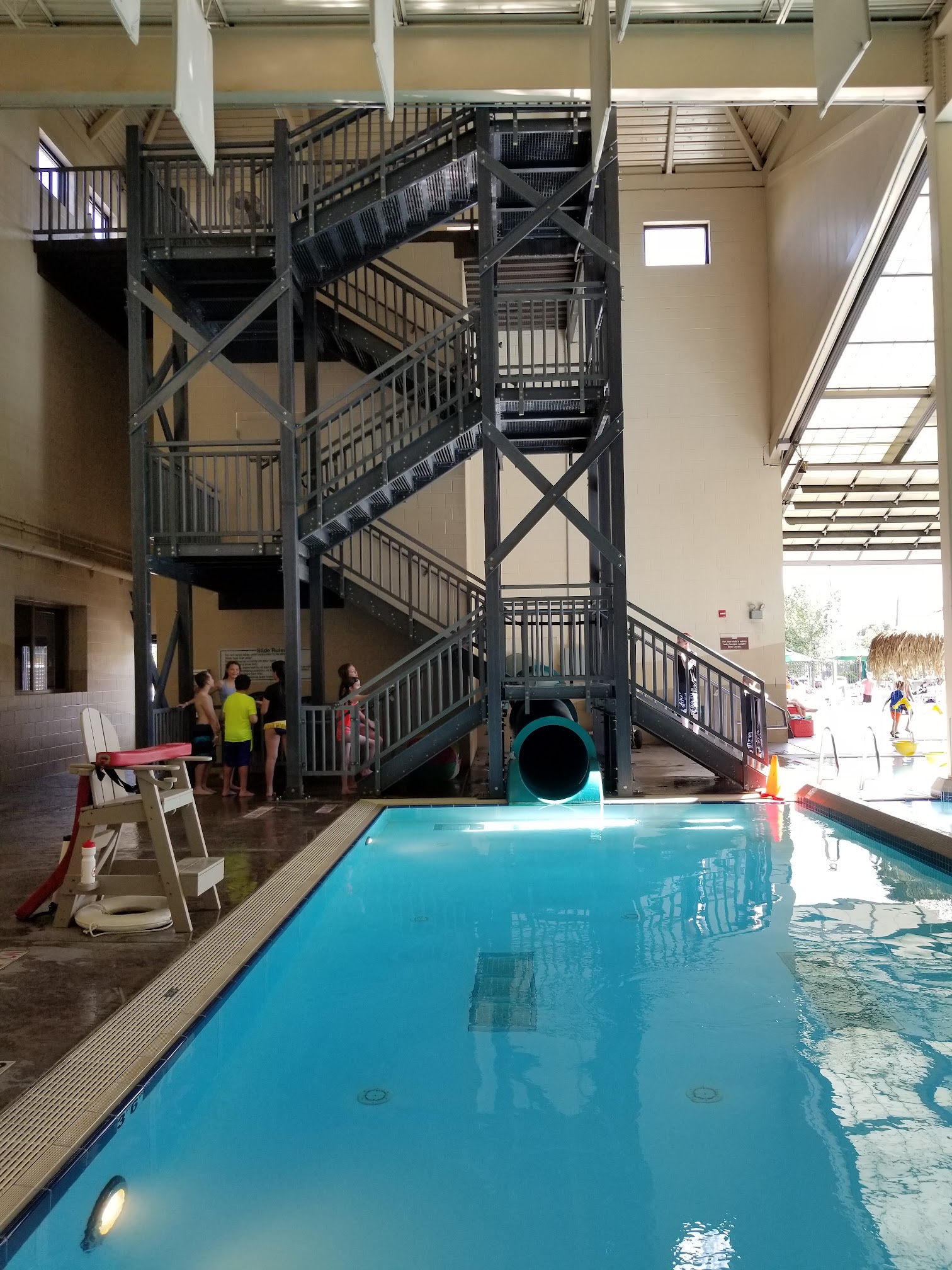 We love this pool and come often. The bucket that pours water every so often is so fun. There is also a lazy river, a baby area, a tubular water slide, and a hot tub. The price is right ($5). It is fun when the big bay door is open to the outside. It makes the pool an outdoor and indoor pool at the same time. There are a few tables with canopies outside.