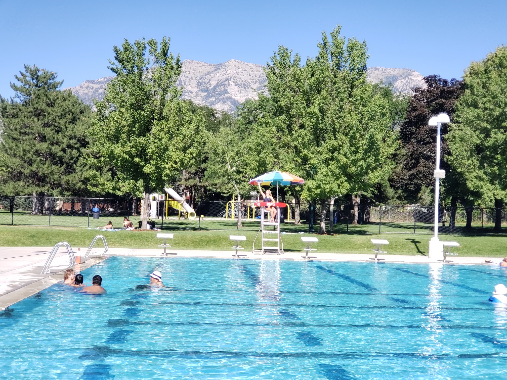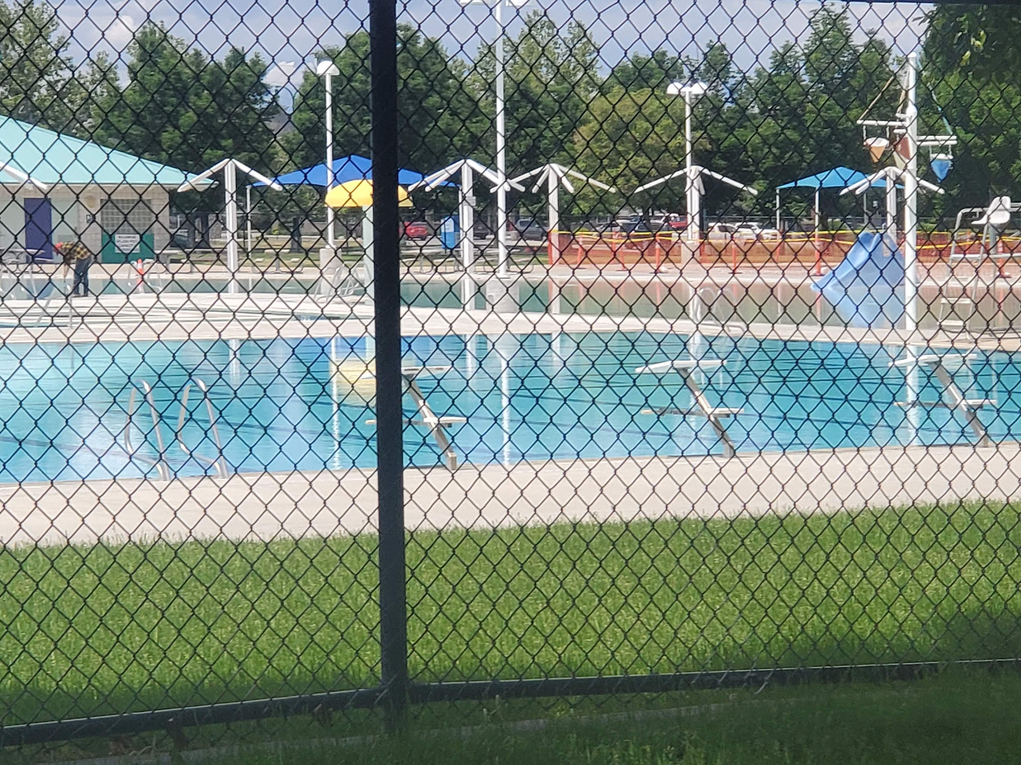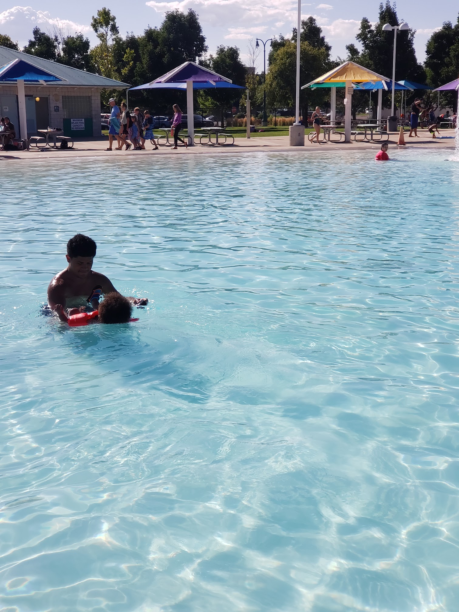 This pool has very warm water in the shallow area which is great for little ones. They also have a small slide and a few water features in the kids area. Plenty of trees and shady spots. They did not have a ton of chairs but we had enough for what we needed. The two diving boards and water slides are fun for the bigger kids. Kids under 48 inches will need a parent or older child to take them on the twisty slide.