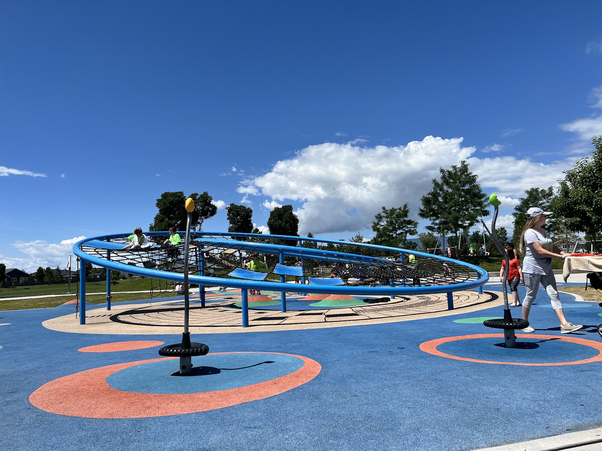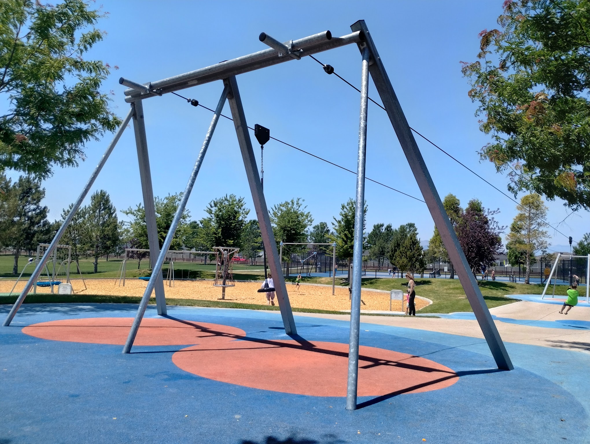 Awesome park, well planned out with lots of activity areas, picnic tables, bathrooms, pickle ball courts, basketball, splash pad, zip line, walking trails, soccer fields, and open spaces to play.