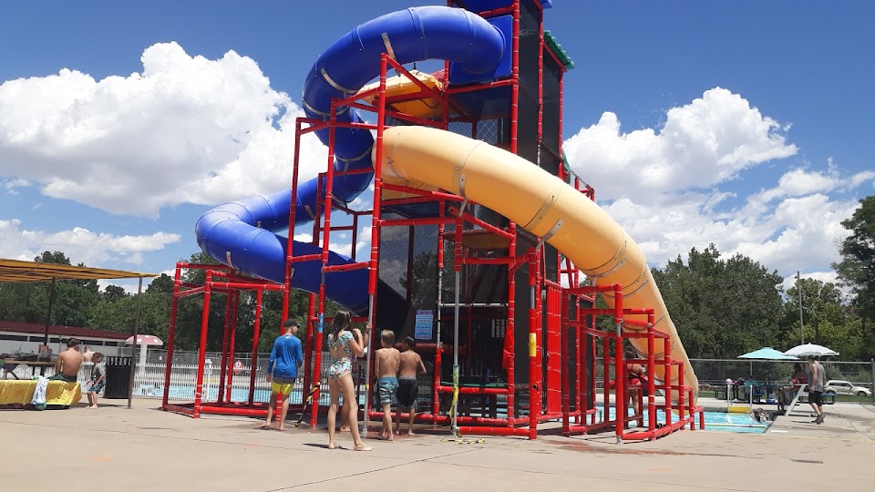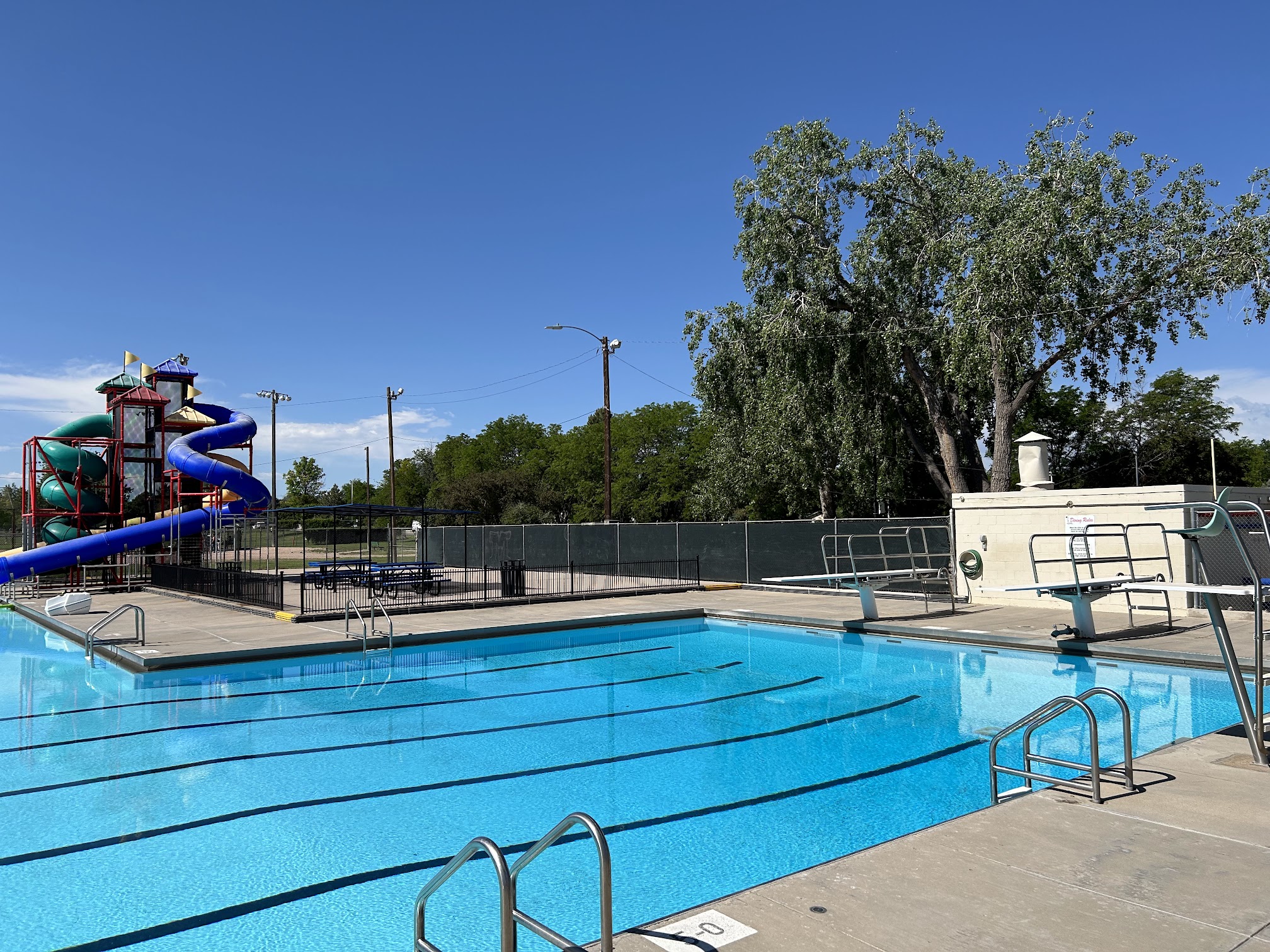 Public pool featuring waterslides, a diving board, and a kiddie pool, plus concessions.