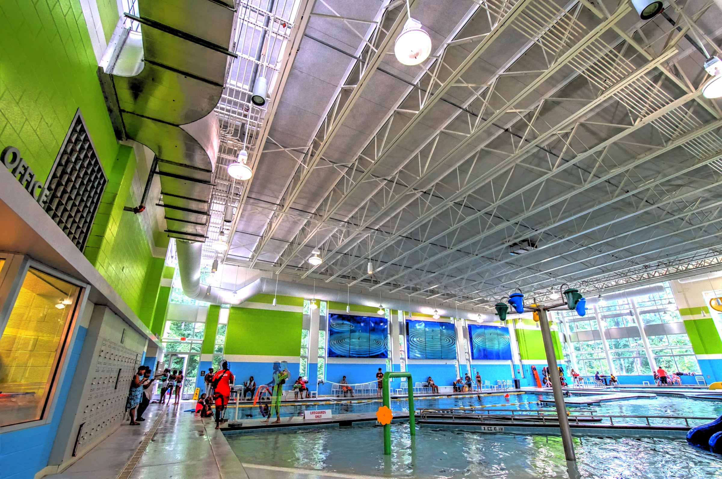 Buffalo Road indoor pool is great for kids wanting to float down a small lazy river, slide down a big curvy water slide and enjoy a small splash pad area plus a regular pool. Pool depth is 3 feet 6 inches so easy for kids and parents to maneuver. There are several adult lap lanes as well. Because its the only indoor pool/play area of its type in the area it can fill up with people and hence you may have to wait to get in. Lifeguards are attentive. Noise level is likely what you'd expect at an indoor pool filled with kids having fun. There are several family changing areas and regular locker rooms too. Plenty of seats and lockers to store clothes.
