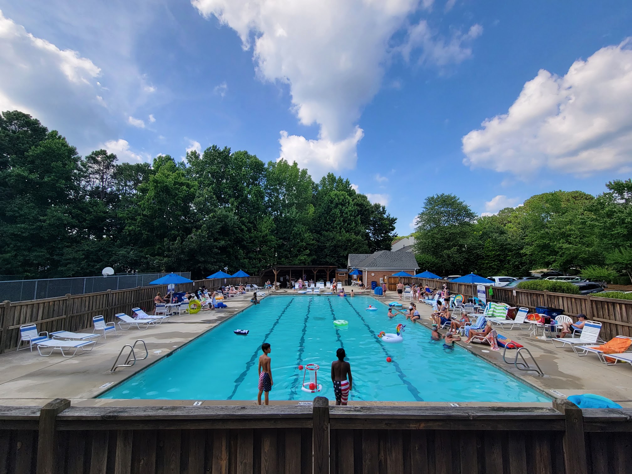 Summer 2025: 3 stars due to reduced the open hours with no explanation, and very snippy and uneven enforcement. Summer 2017: 4 stars. Warms up fast. Lots of kids playing. No shade in the pool, a few umbrellas out - bring your sunscreen. Lots of fun social activities. No shallow end to speak of, Deep end could've been deep enough for a diving board, but thanks to litigious people, no joy there. Chlorine is sufficient, and sometimes heavy.