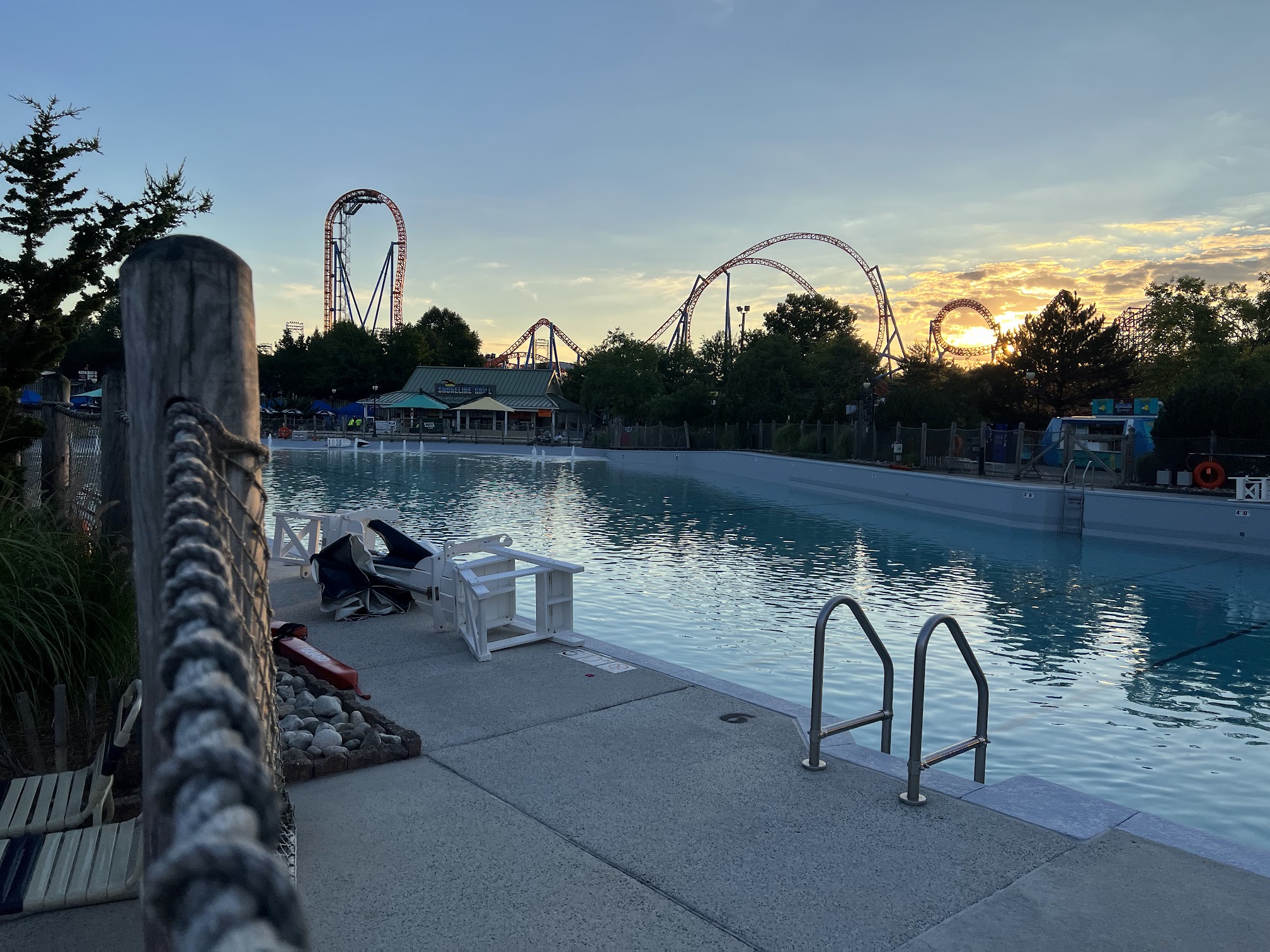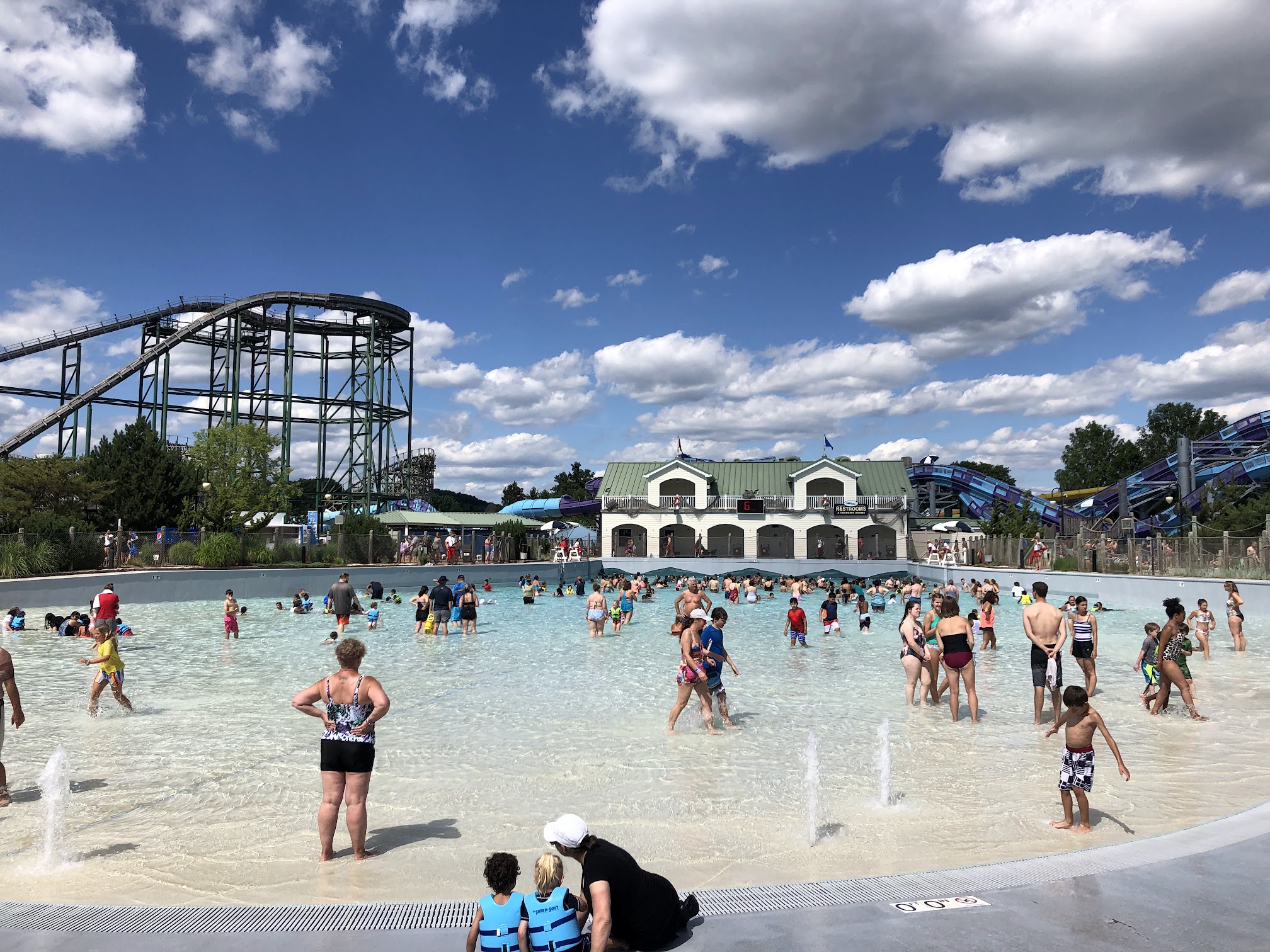 It's a fairly decent wave pool. Lots of seating is placed near the wave pool along with some nice looking cabanas. The wave pool appears fairly clean. I don't really like getting in the pool when the park first opens in late May or early June because it's so cold There is a place to put your shoes before you enter and also after. There's also a bathroom/changing area right near the pool as well.