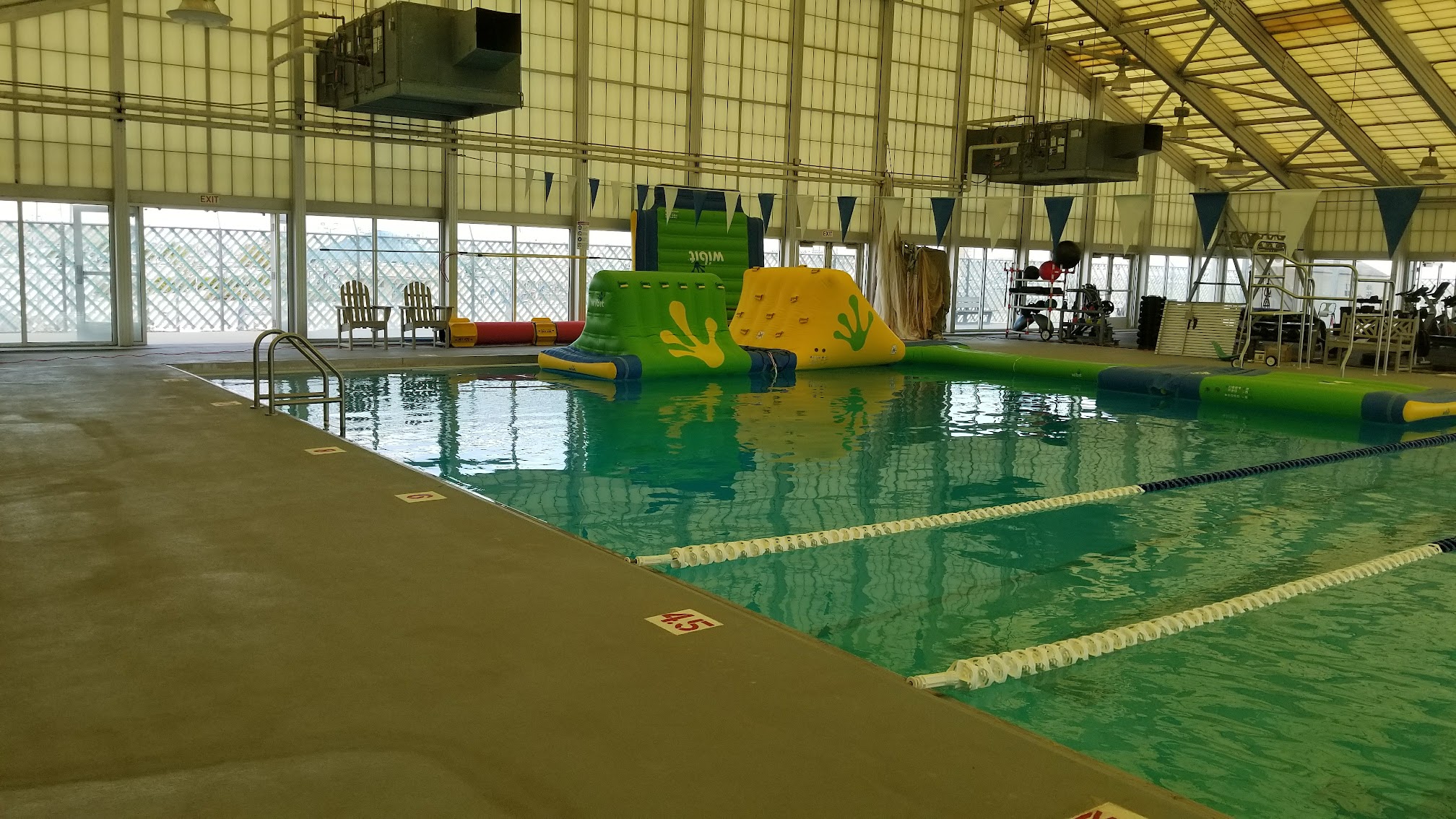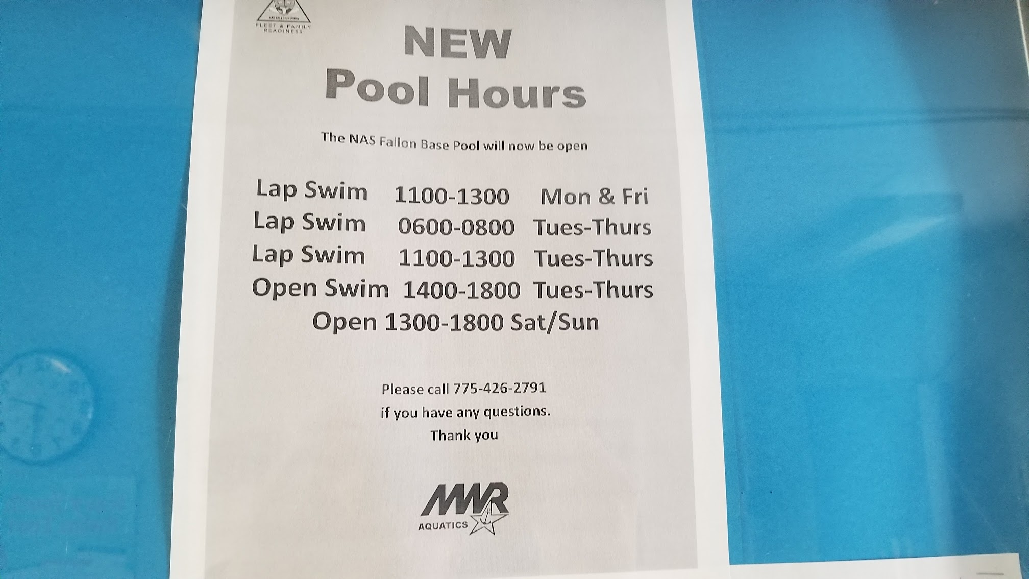 What are people saying (AI review summary)? This indoor pool, located on Fallon NAS and accessible to eligible MWR patrons and all service members, offers a range of activities for both individuals and families. It features multiple swim lanes for laps, an aquatic play set, and a blow-up obstacle course for children. Lifeguards are highly praised, and kids can take a swim test to swim without a life jacket. The facility provides amenities such as towels, life jackets, various swimming equipment, and water toys. It also includes clean changing rooms with hot showers and swimsuit dryers, as well as a small poolside gym/workout area. Reviewers highlight it as a fun, clean, and great activity, especially during hot summer days, though swim lanes can fill up quickly.