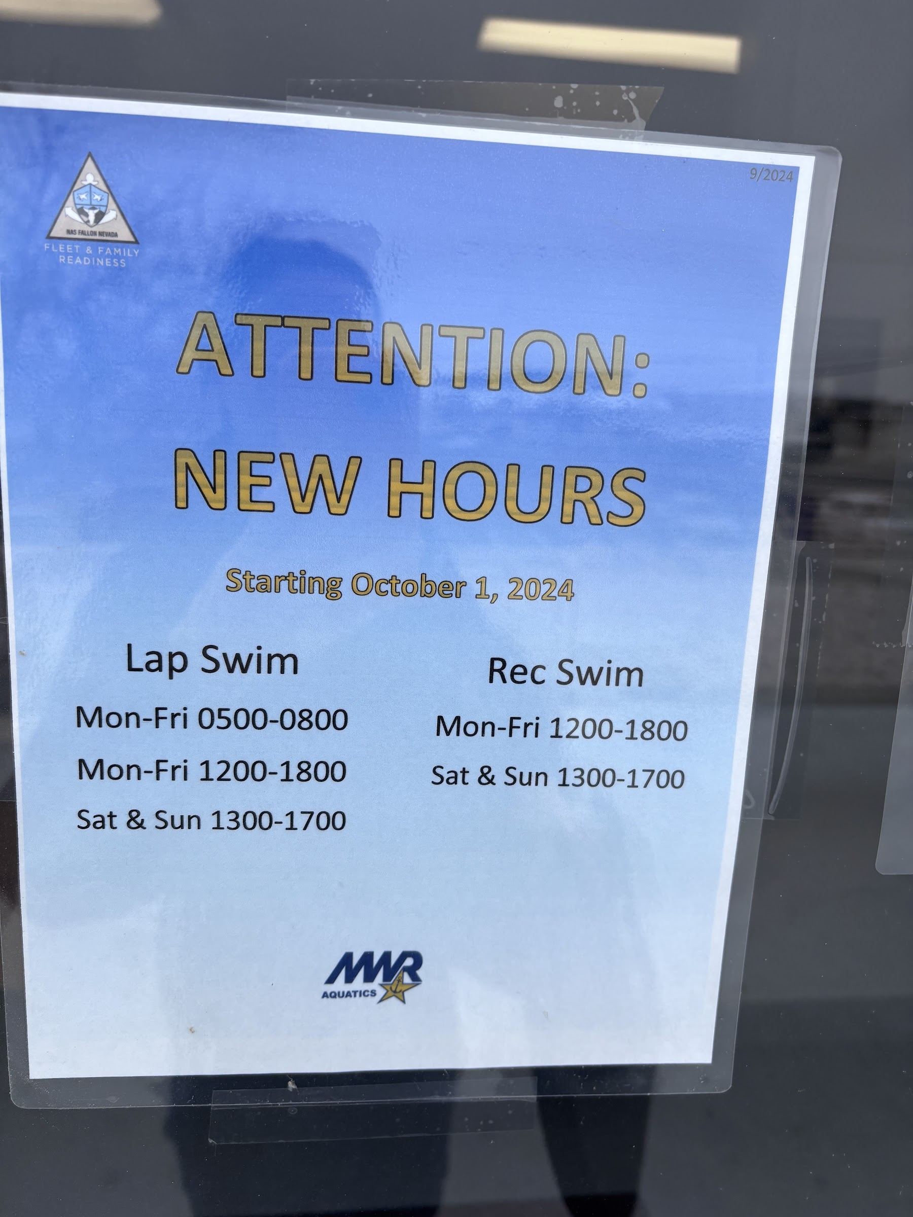 First youll need to be a sponsor or be sponsored by someone eligible to use the base MWR facilities. Great pool for swimming laps , shooting hoops,or playing on the blow up obstacle course. The life guards are great. Kids need to pass a swim test before being allowed to swim without a life jacket. Has a small workout area. There are benches and chair to sit and watch the kiddos. They provide towels, life jackets, some swimming equipment for doing laps, and water toys like ring torpedoes and small animals the kids can toss in and search for.