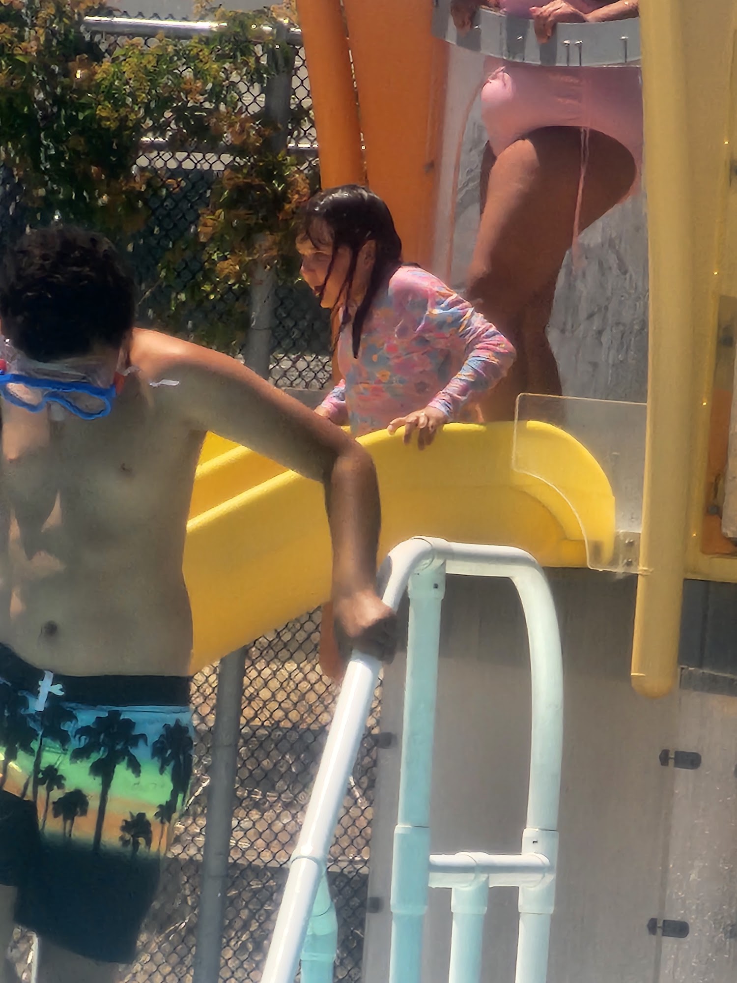lots of fun, no real steps into the pool, but they have a set of stairs that looks like a secondary addition(pvc pipe). Lifeguards a ere nice, there are two slides you can go on as long as you pass a swim test. shallow is 3.5 feet deepest is 10 feet. There is also a little splash pad play structure, the kids had a good time with that. Not a lit of shade but there are about 3 shade structures to help.