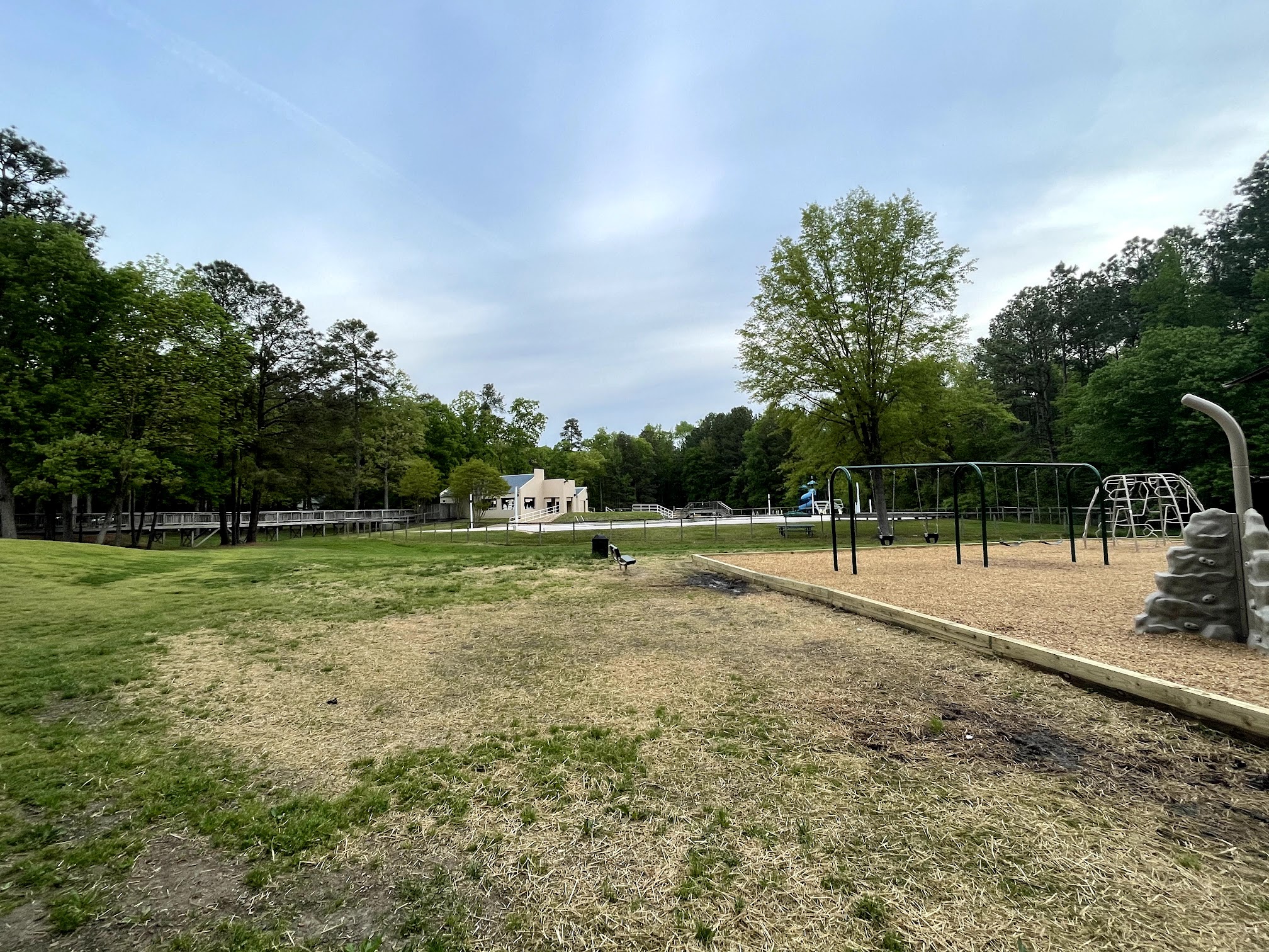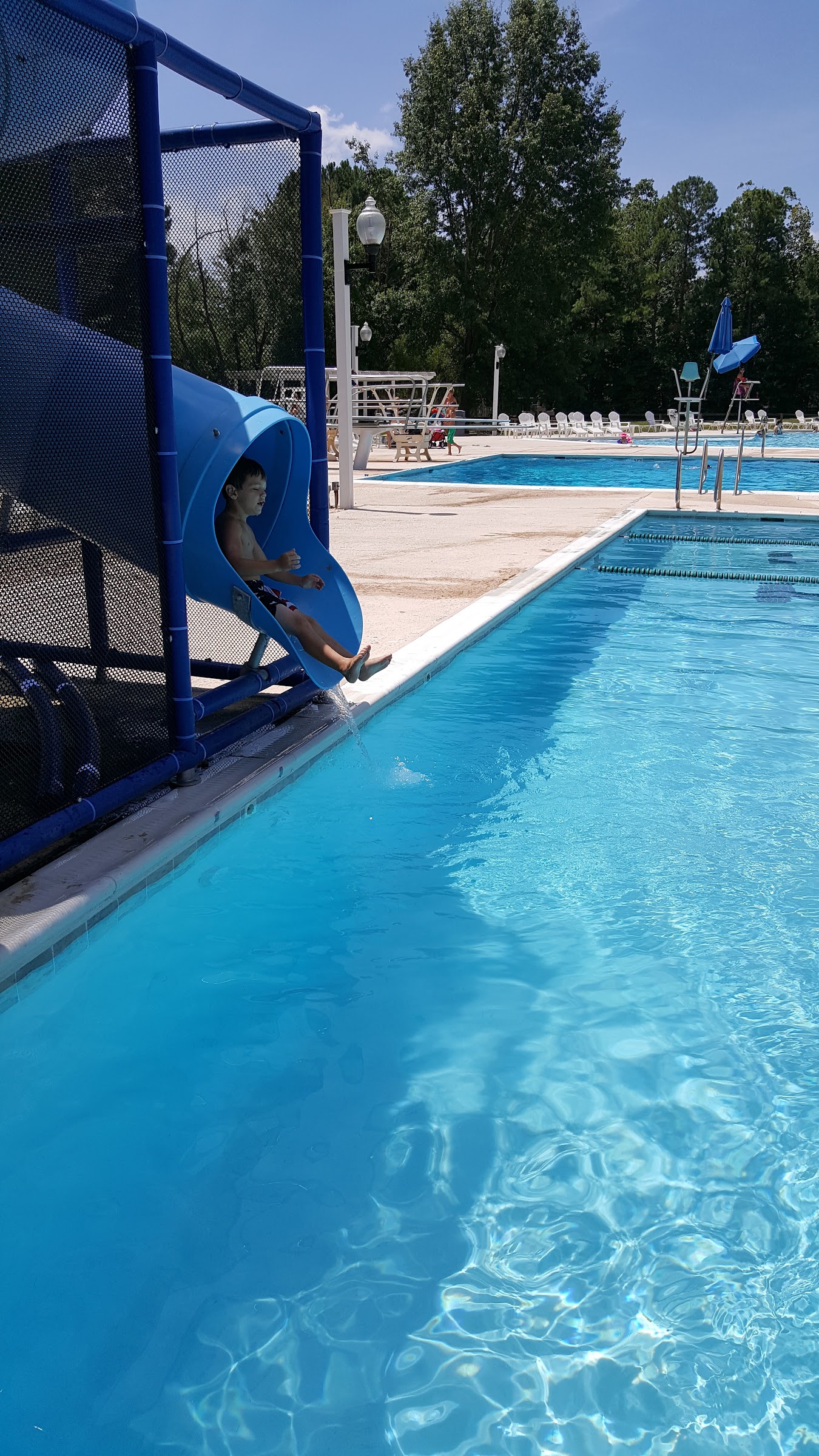 There's a large swimming area with stairs that goes up to 5ft. This is connected to the diving well which is connected to the lap lanes that include a slide. Covered area by check in can be rented at reasonable rates and there's a nice new playground right behind. Walking distance from many neighborhoods via trail. Ample parking, and tanning chairs and picnic tables with umbrellas galore! Mom and kids paradise!