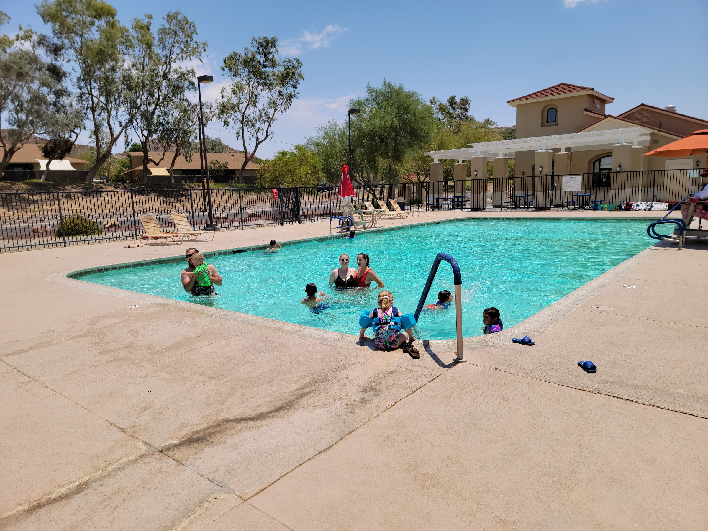 Haven't used the pool personally, but it looks well maintained and always has a lifeguard on duty when open. Safe for children of all ages, but not a great option if you're looking to do some laps. The clubhouse/venue center inside was really freaking nice though. Full refrigerator, stove, tables with chairs, and TV's. Great for small get togethers and birthday parties.