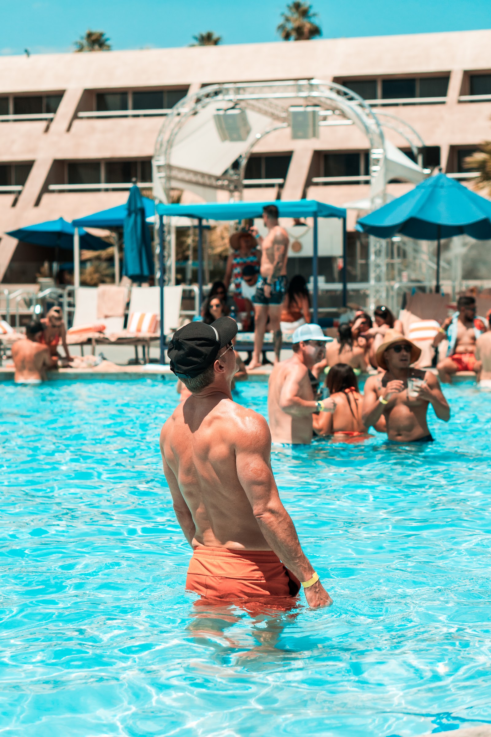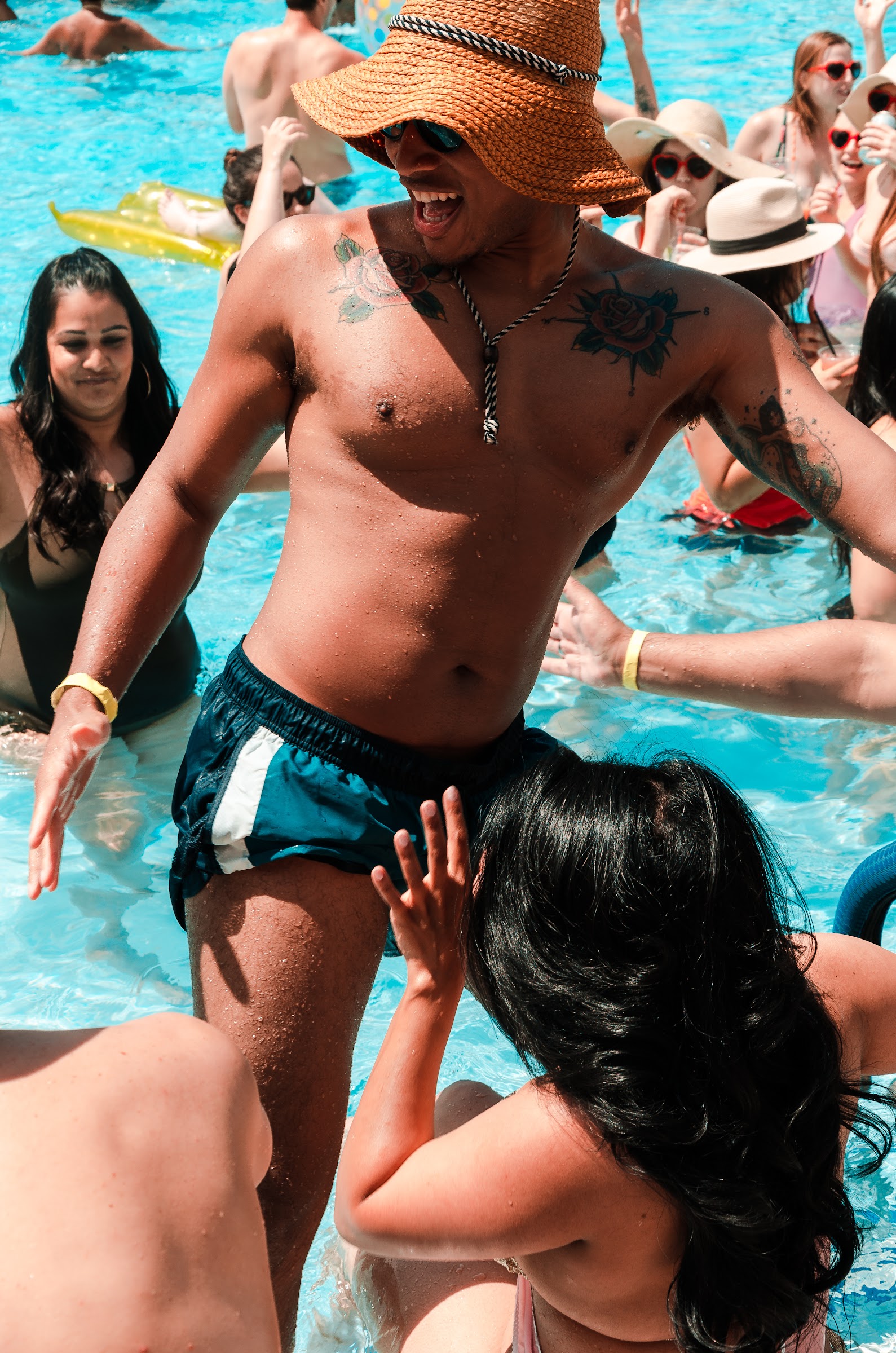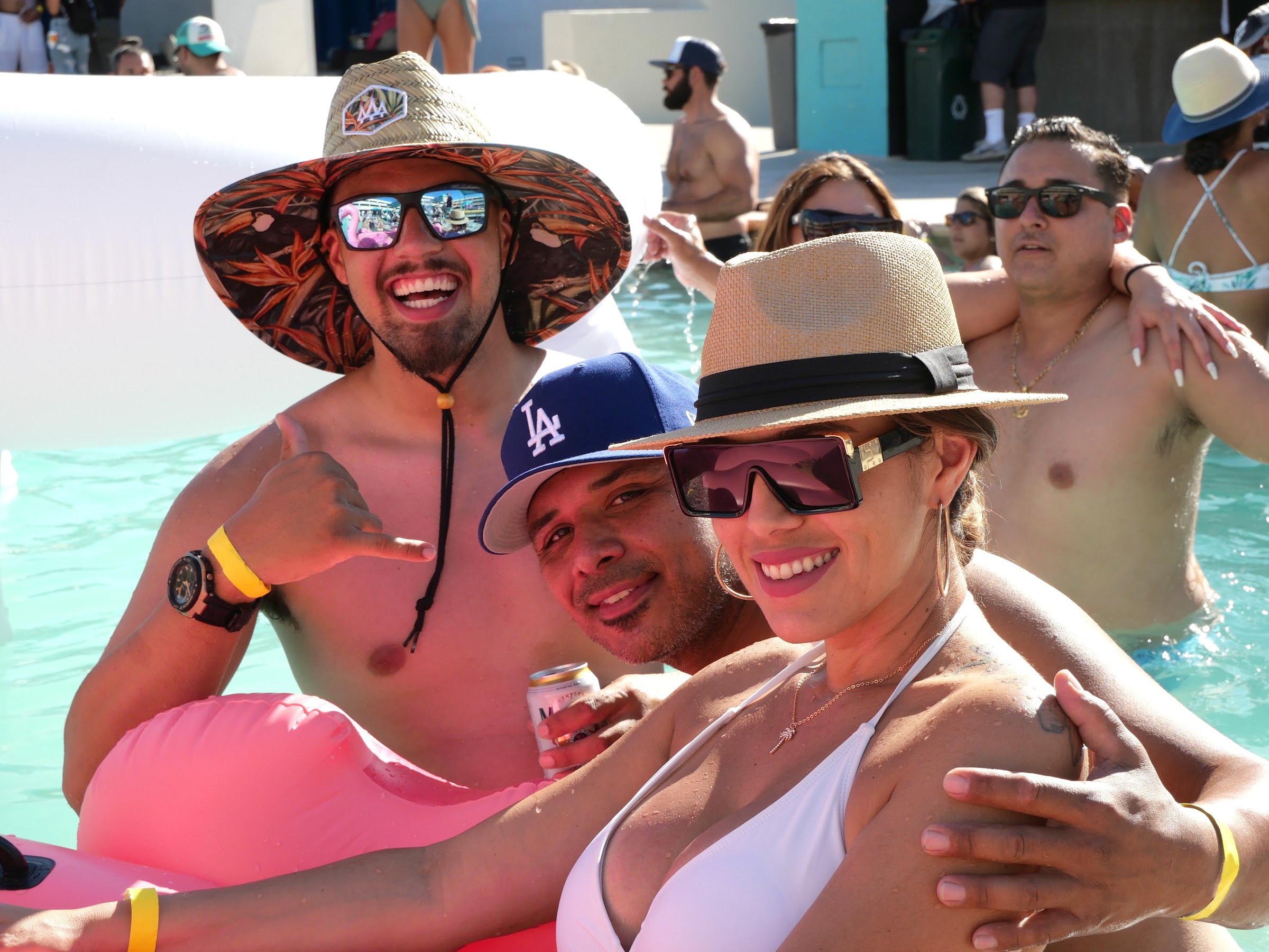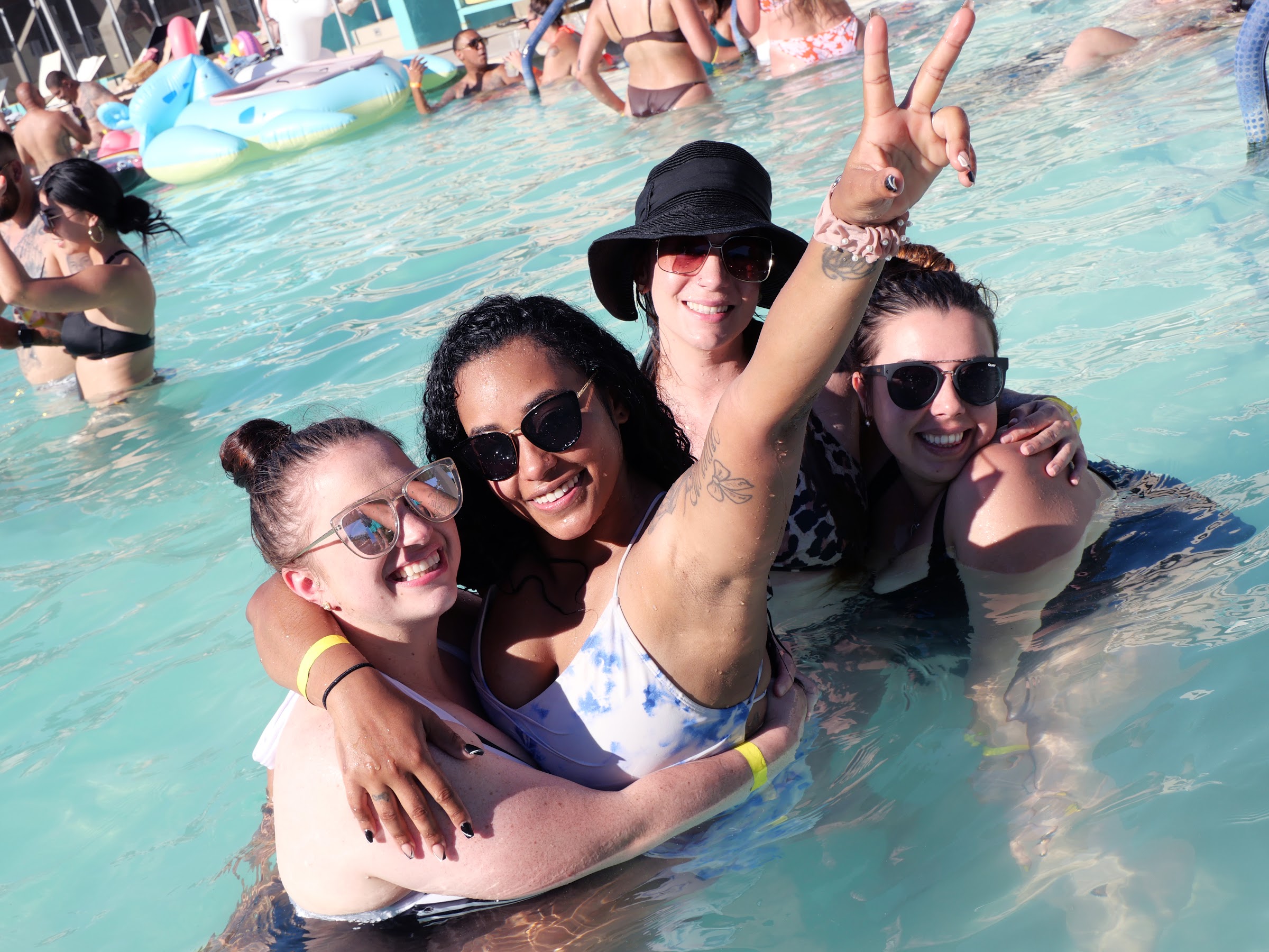 What are people saying (AI review summary)? Reviews are mixed for this pool party. Positive aspects highlighted include a 'no kids' policy, reasonably priced drinks, and good music with an energetic DJ. However, negative feedback points to poor service and an oily substance in the pool.