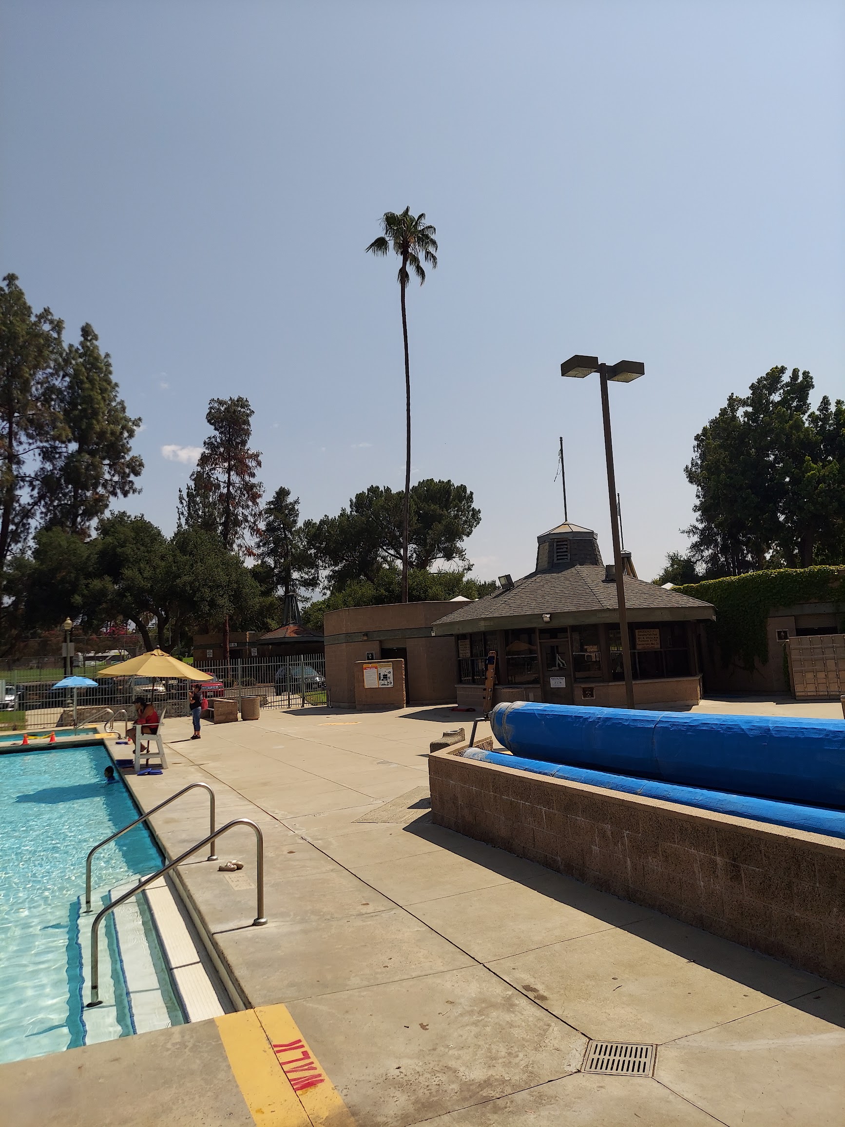Recreational park with a swimming pool, basketball courts, and picnic tables, plus a playground.